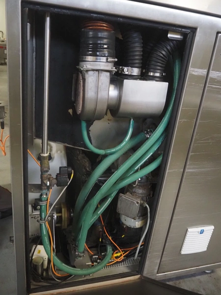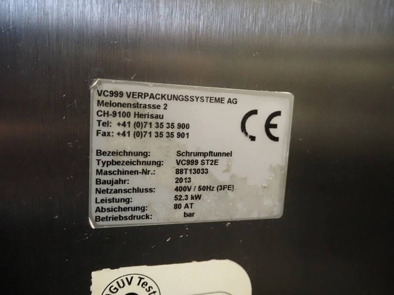 VC999 Verpackungssysteme AG shrink tunnel, type: VC999 ST2E, machine number: 88T13033, year of construction: 2013, 400 V, 3 Ph, 50 Hz, 80 AT, 52.3 kW, s/s mesh belt, belt width: 880 mm, clearance: 970 mm x 340 mm, total dimensions: 1400 mm x 1400 mm x 1660 mm.