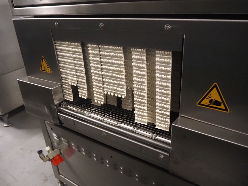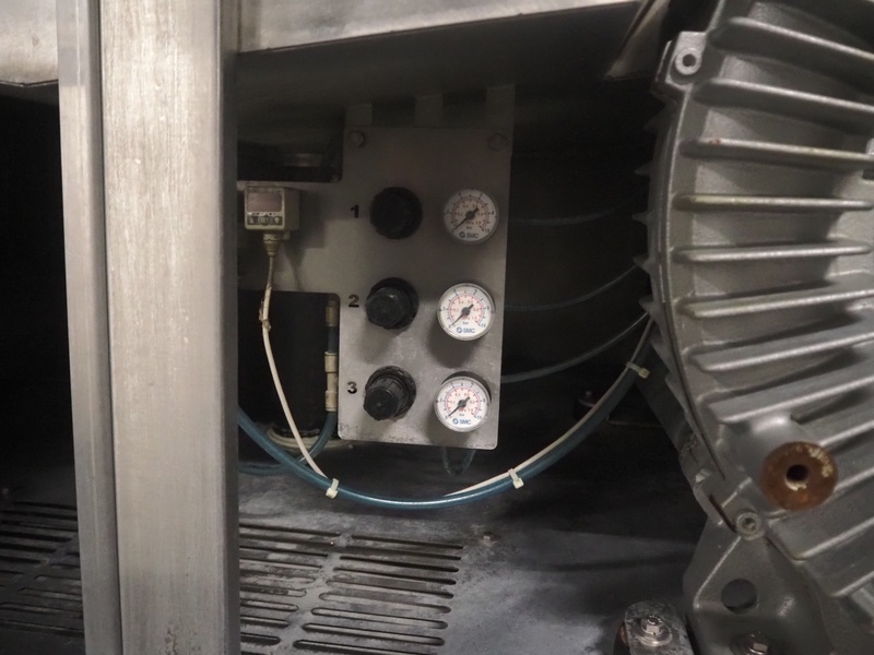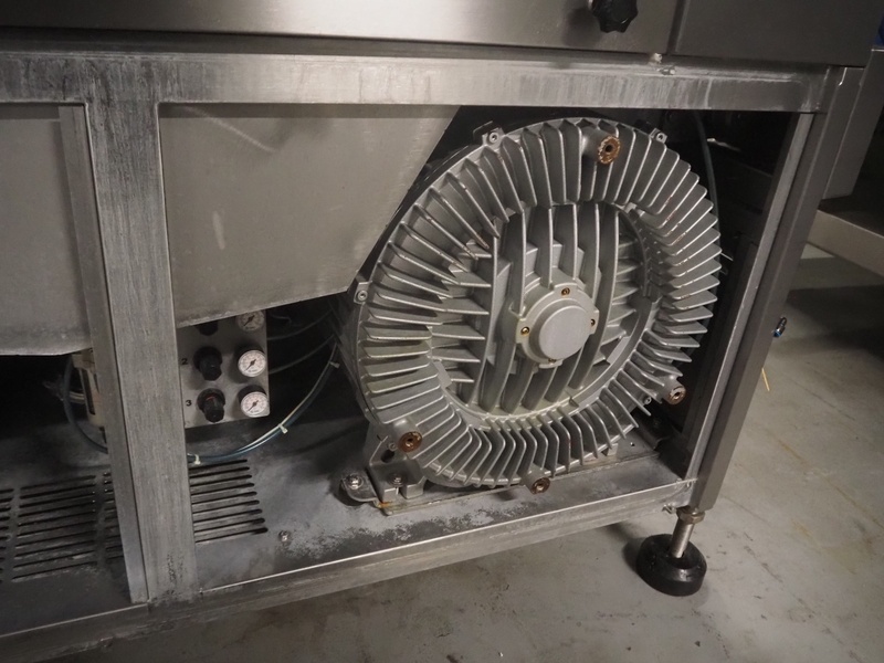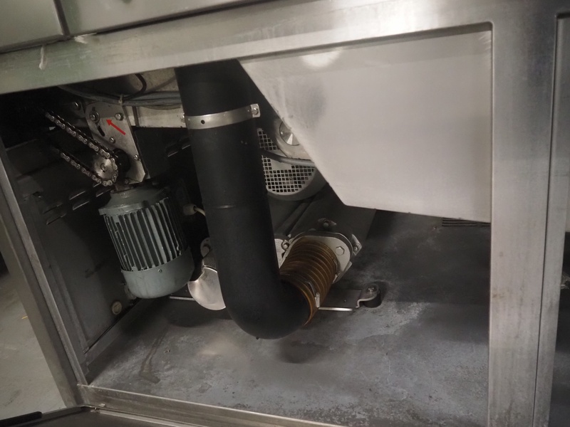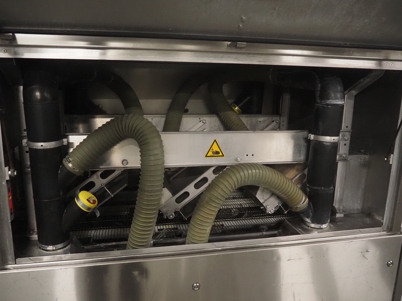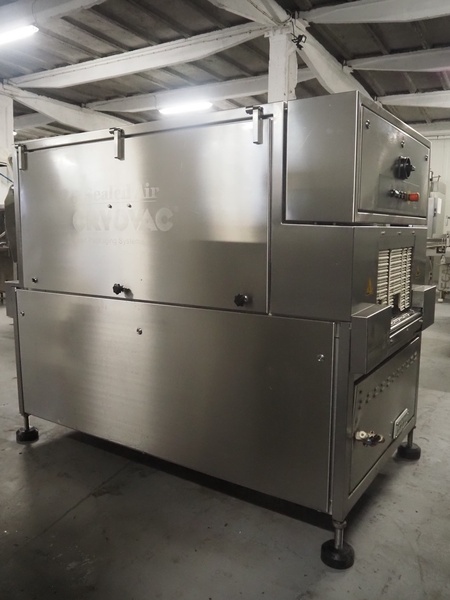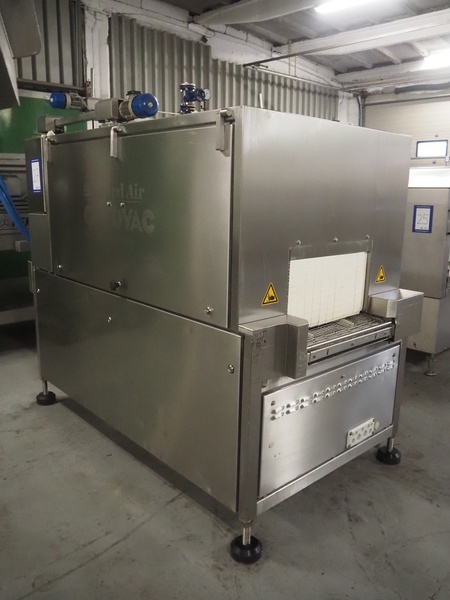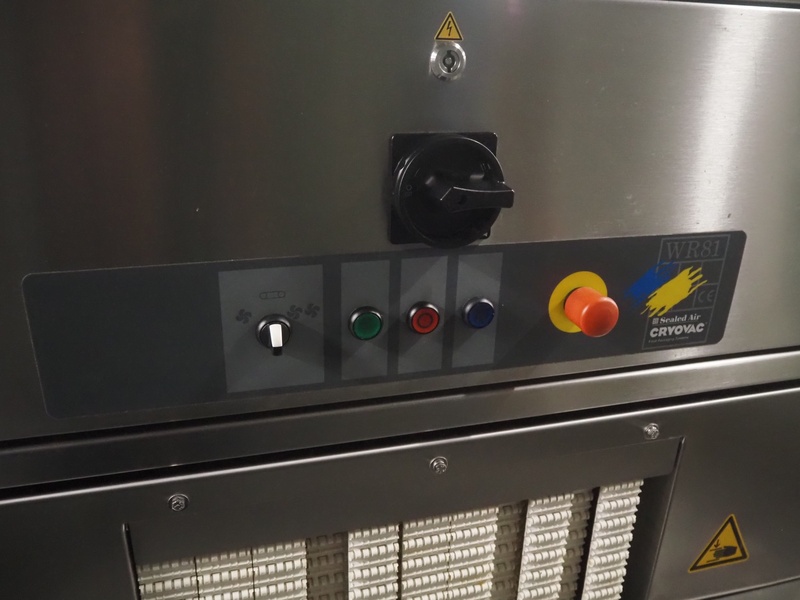 Cryovac drying tunnel, model: WR81, s/s mesh belt, belt width: 550 mm, clearance: 560 mm x 300 mm, (3x) blowers, working width blower: (3x) 550 mm, total dimensions: 2050 mm x 1170 mm x 1700 mm.