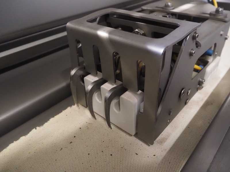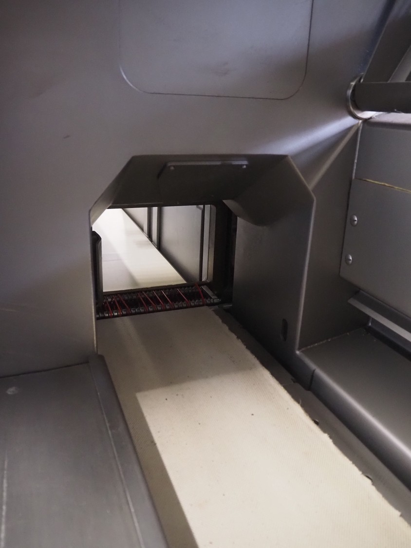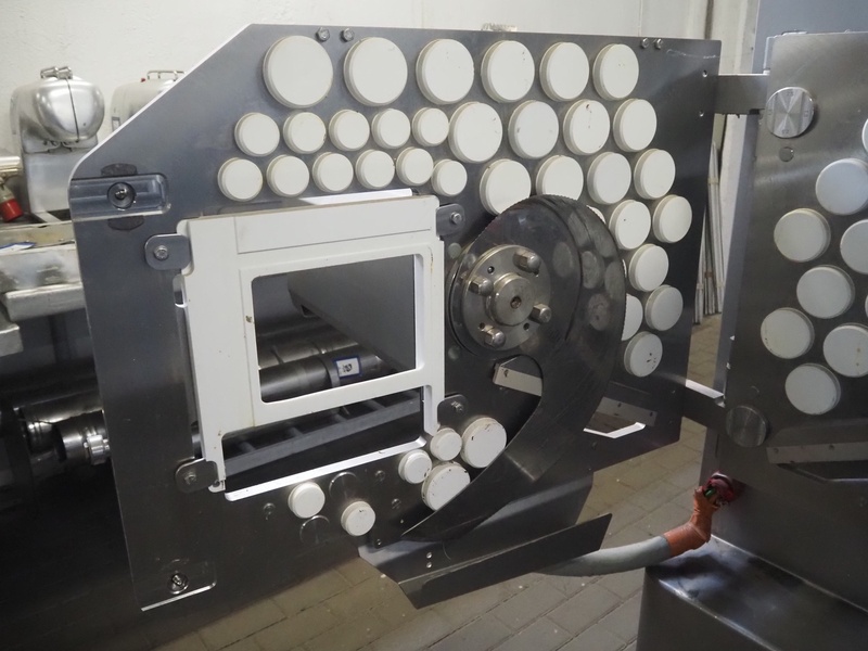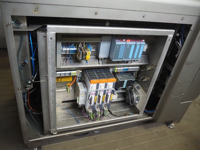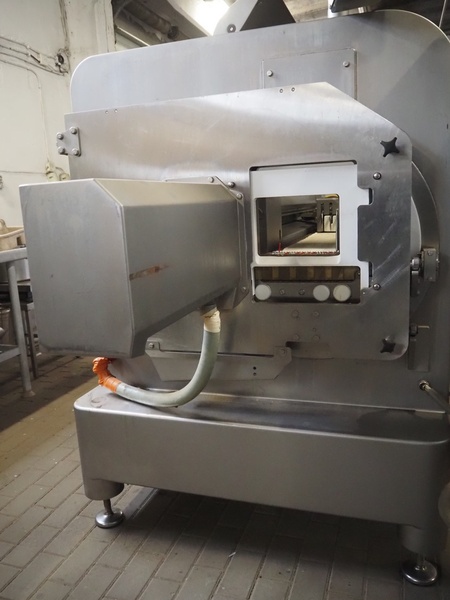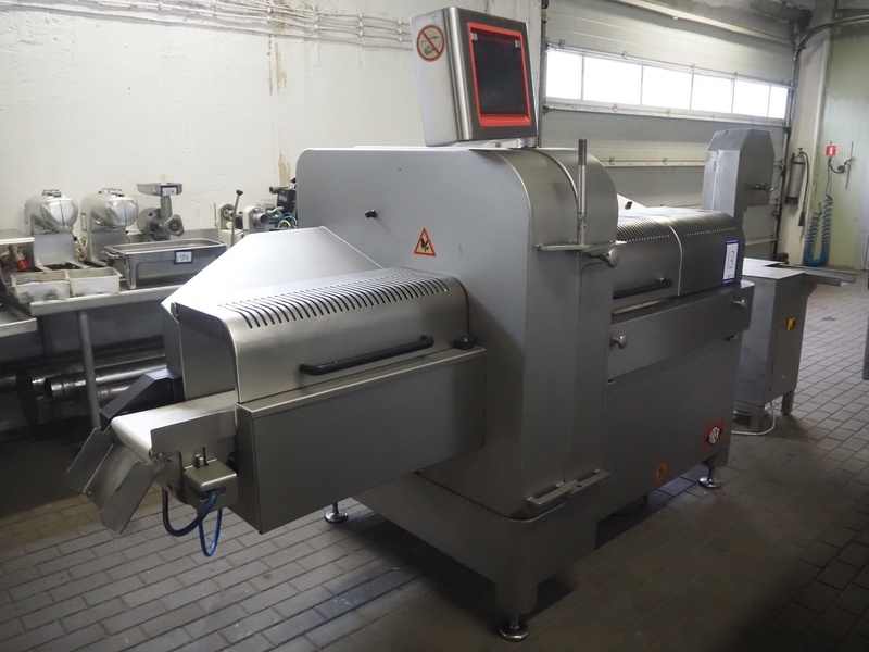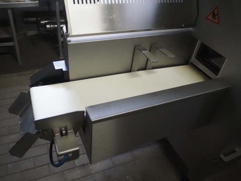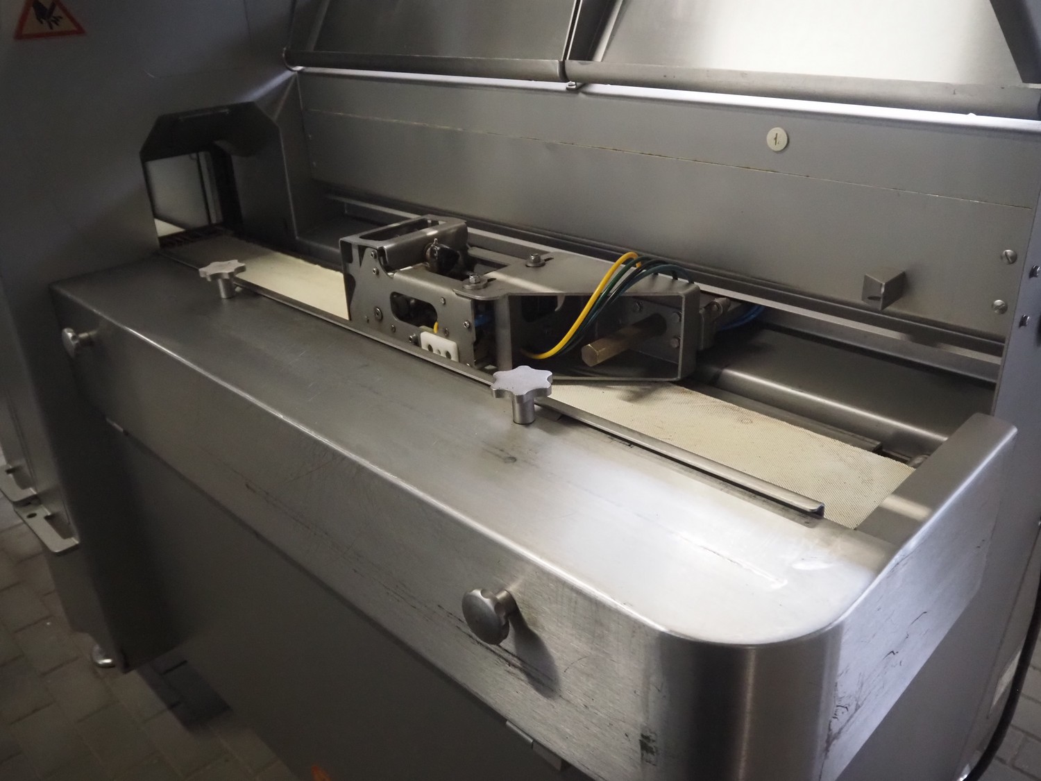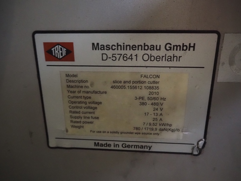 Treif Maschinenbau GmbH slicer and portion cutter, model: FALCON, machine number: 460005.155612.108835, year of construction: 2010, 380/480 V, 3 Ph, 50/60 Hz, 25 A, machine weight: 780 kg, plastic belt, belt width: 200 mm, clearance: 260 mm x 260 mm, diameter knife: 500 mm, total dimensions: 2800 mm x 1270 mm x 1900 mm. Broken screen.