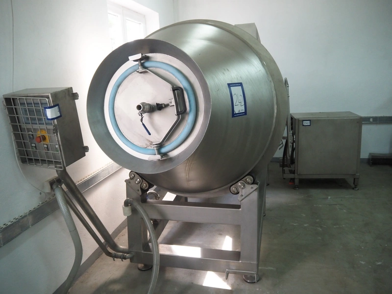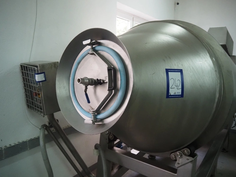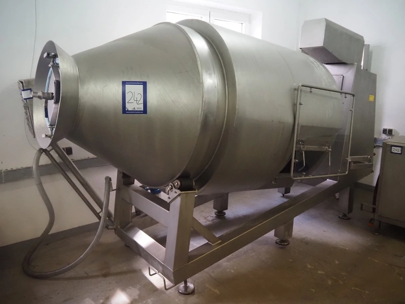 Karpowicz cooled vacuum tumbler, model: MK-2000C, serial number: 5252, volume tumbler: 2000 liter, ZTP TEPRO vacuum pump, type pump: AT 40 A, serial number: 1293, year of construction: 2015, capacity: 38 m³/h, dimensions tumbler: 3500 mm x 1650 mm x 2050 mm, dimensions cooling unit: 970 mm x 580 mm x 940 mm. Lot located in Skierniewice (PL), viewing and pick up in consultation with Industrial Auctions B.V.