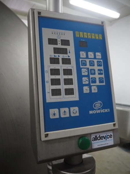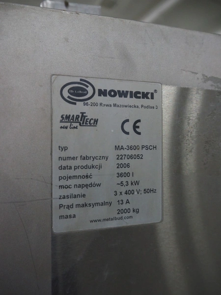 Nowicki cooled vacuum tumbler, type: MA-3600 PSCH, number: 22706052, year of construction: 2006, 400 V, 3 Ph, 50 Hz, 13 A, 5.3 kW, machine weight: 2000 kg, volume: 3600 liter, Busch vacuum pump, type: RC 0063 E 501, number: 060057311, capacity: 63 m³ per hour, dimensions: 3700 mm x 1600 mm x 2080 mm. Including cool unit, dimensions: 1240 mm x 810 mm x 950 mm. Lot located in Skierniewice (PL), viewing and pick up in consultation with Industrial Auctions B.V.