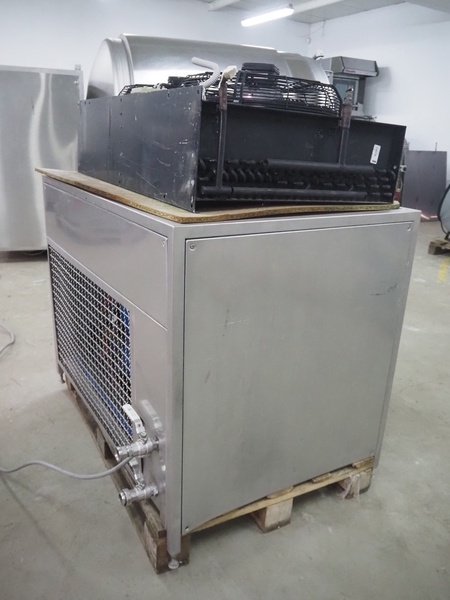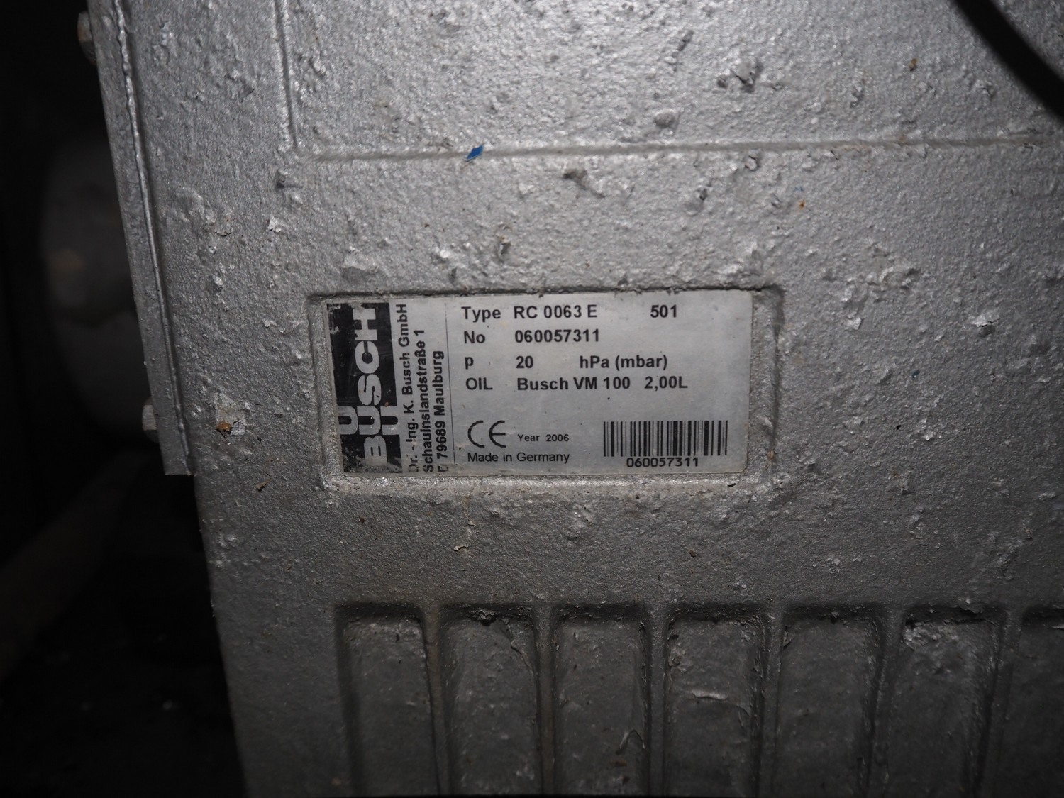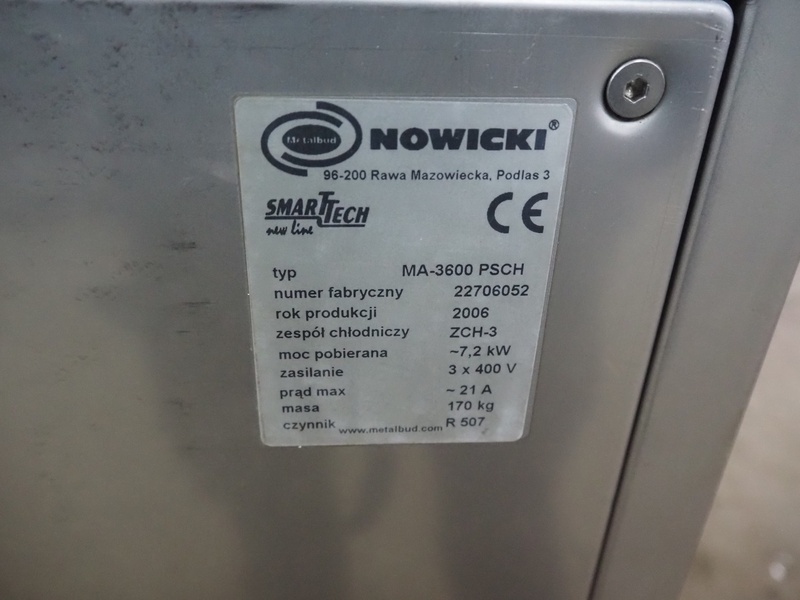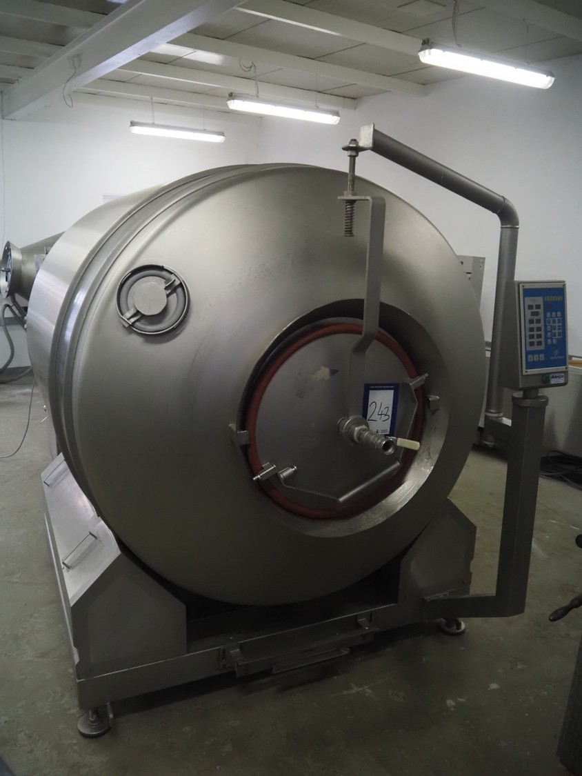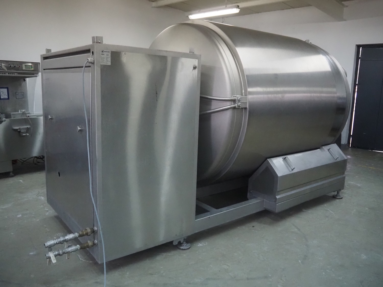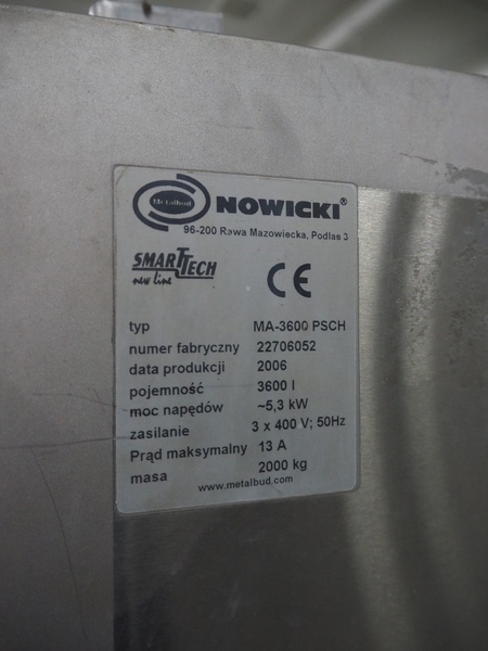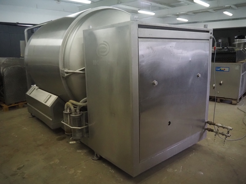 Nowicki cooled vacuum tumbler, type: MA-3600 PSCH, number: 22706052, year of construction: 2006, 400 V, 3 Ph, 50 Hz, 13 A, 5.3 kW, machine weight: 2000 kg, volume: 3600 liter, Busch vacuum pump, type: RC 0063 E 501, number: 060057311, capacity: 63 m³ per hour, dimensions: 3700 mm x 1600 mm x 2080 mm. Including cool unit, dimensions: 1240 mm x 810 mm x 950 mm. Lot located in Skierniewice (PL), viewing and pick up in consultation with Industrial Auctions B.V.