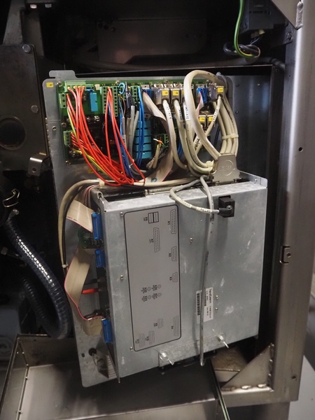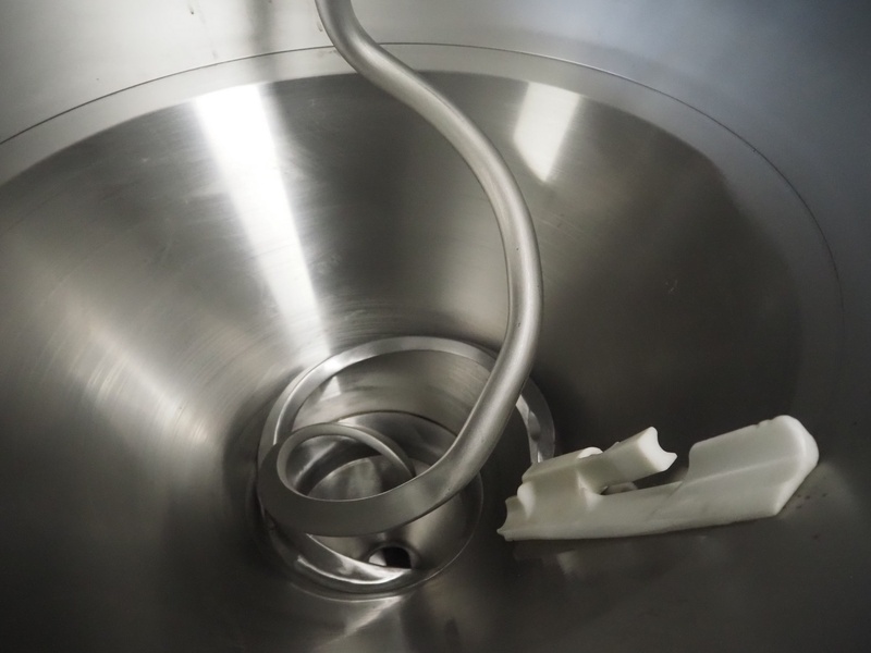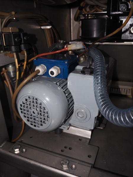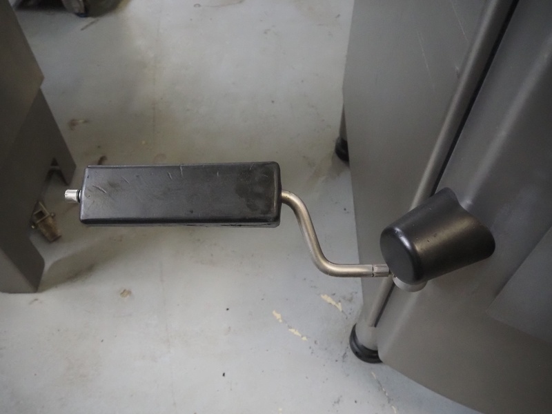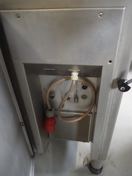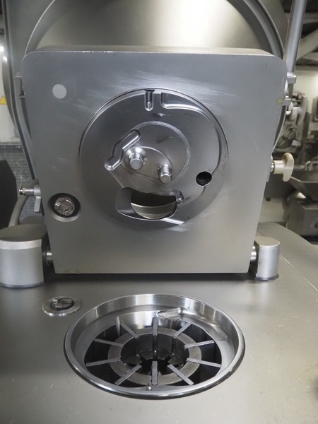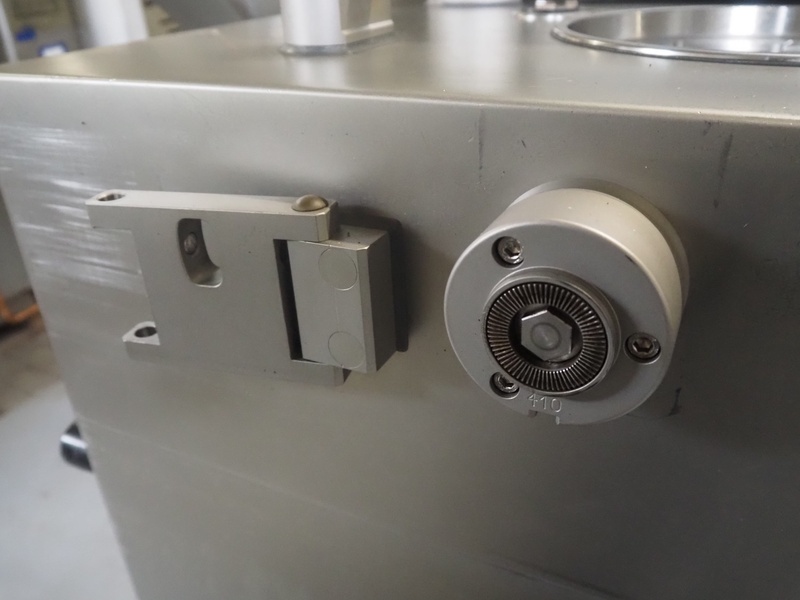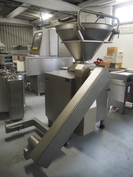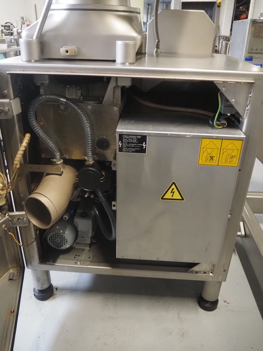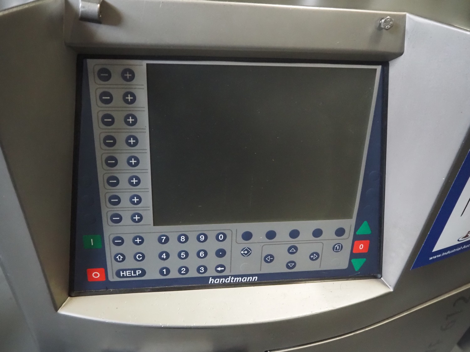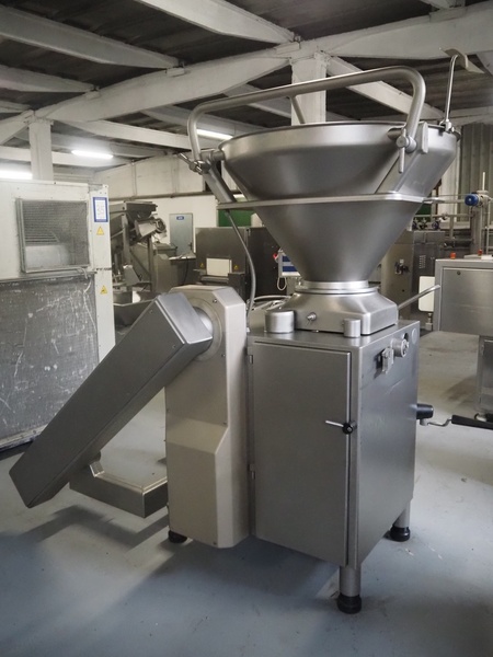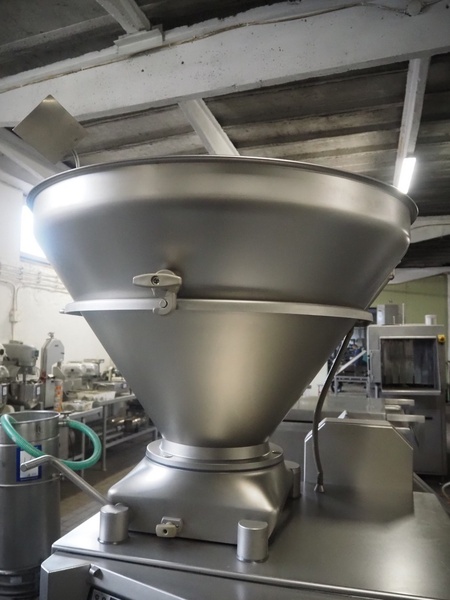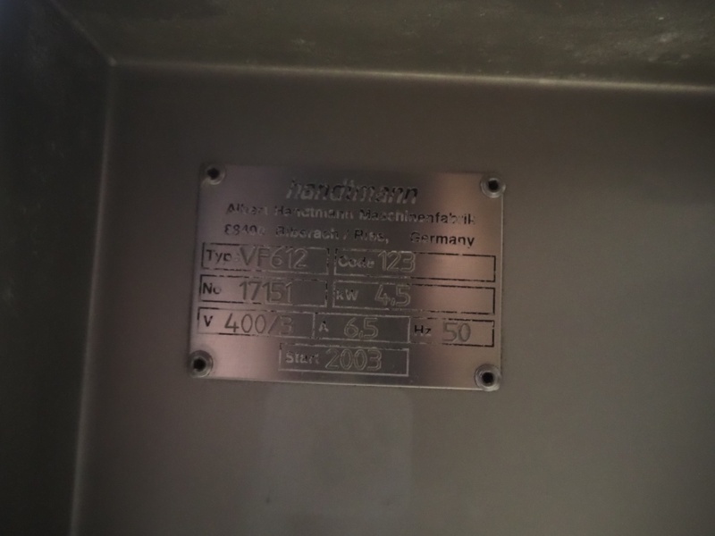 Handtmann vacuum filling machine with lifter for 200 liter meat bins, type: VF612, number: 17151, year of construction: 2003, 400 V, 3 Ph, 50 Hz, 6.5 A, dimensions: 2260 mm x 1400 mm x 2300 mm.