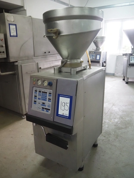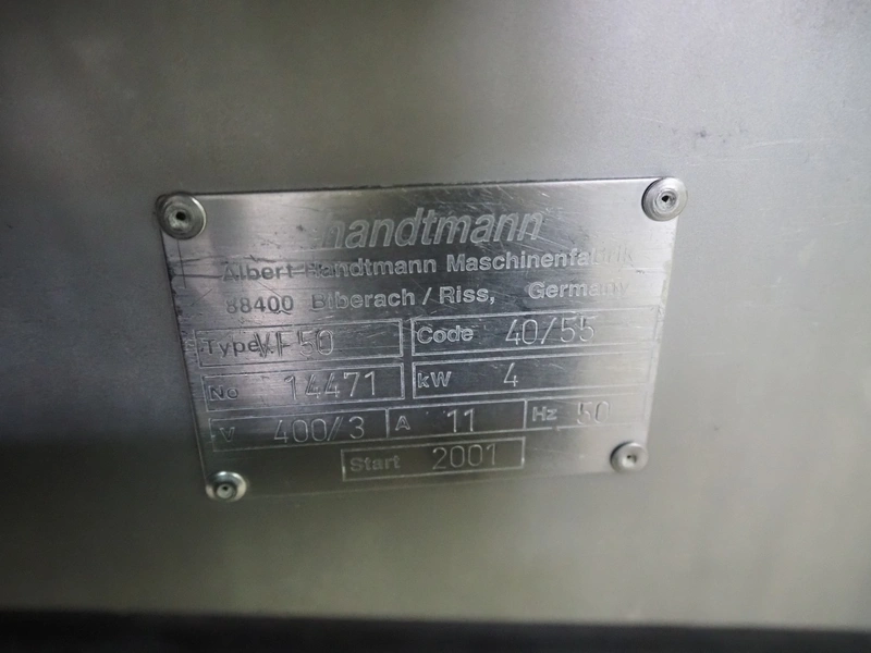 Handtmann vacuum filling machine, type: VF50, number: 14471, year of construction: 2001, 400 V, 3 Ph, 50 Hz, 11 A, 4 kW, dimensions: 850 mm x 600 mm x 1670 mm. Lot located in Skierniewice (PL), viewing and pick up in consultation with Industrial Auctions B.V.