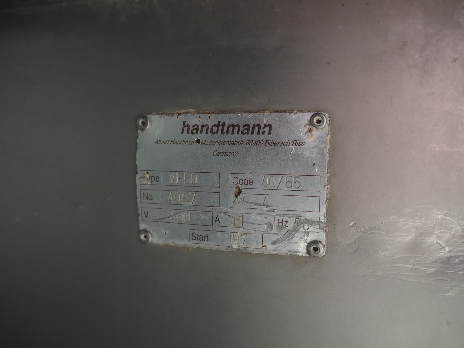 Handtmann vacuum filling machine, type: VF50, number: 4097, year of construction: 1997, 400 V, 3 Ph, 50 Hz, 11 A, 4 kW, dimensions: 850 mm x 580 mm x 1690 mm. Lot located in Skierniewice (PL), viewing and pick up in consultation with Industrial Auctions B.V.