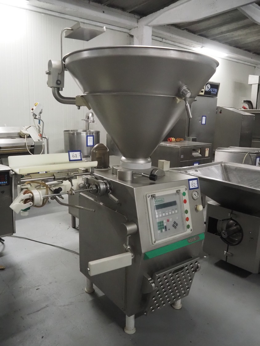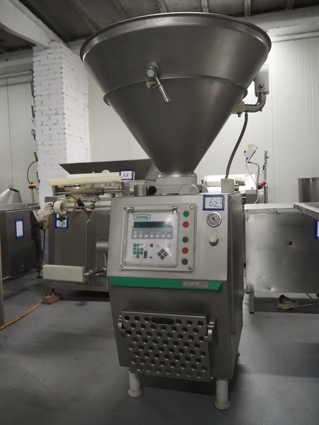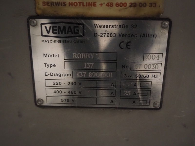 Vemag Maschinenbau GmbH vacuum filling machine, type: 137, model: ROBBY 2, number: 37 0030, year of construction: 2004, 220/240/400/460/575 V, 3 Ph, 50/60 Hz, 13/25 A, dimensions: 1100 mm x 850 mm x 2050 mm.