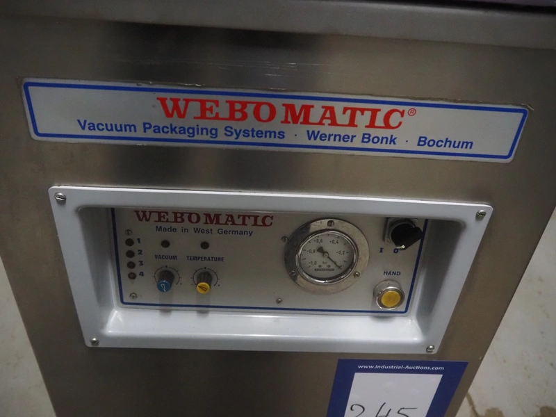 Webomatic mobile vacuum machine, seal length: 410 mm, chamber: 410 mm x 450 mm x 80 mm, total dimensions: 620 mm x 530 mm x 1100 mm. Lot located in Skierniewice (PL), viewing and pick up in consultation with Industrial Auctions B.V.