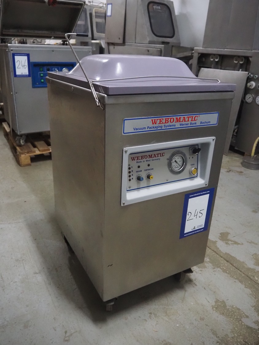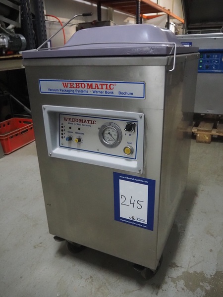 Webomatic mobile vacuum machine, seal length: 410 mm, chamber: 410 mm x 450 mm x 80 mm, total dimensions: 620 mm x 530 mm x 1100 mm. Lot located in Skierniewice (PL), viewing and pick up in consultation with Industrial Auctions B.V.