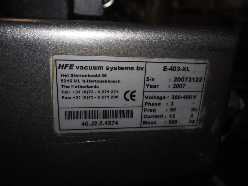 Henkovac mobile double chamber vacuum machine, model: E-403-XL, serial number: 20073122, year of construction: 2007, 380/400 V, 3 Ph, 50 Hz, 15 A, 368 kg, seal length: (4x) 700 mm, chamber: 570 mm x 700 mm x 150 mm, Busch vacuum pump, type: RA 0100 F 503, number: 070054356, capacity: 100m³ per hour, total dimensions: 1650 mm x 880 mm x 1230 mm.