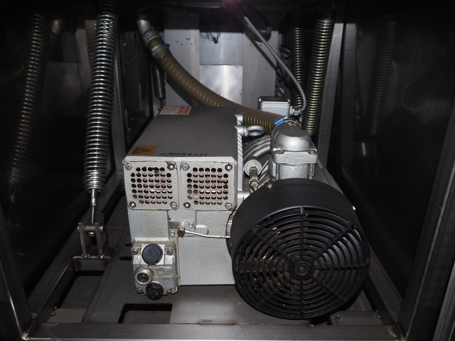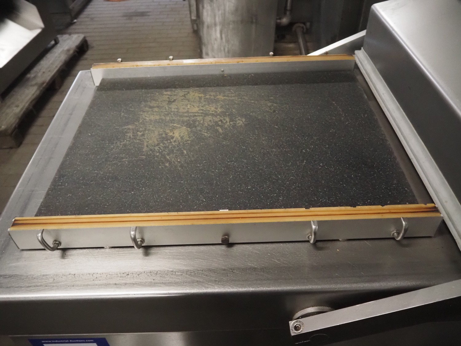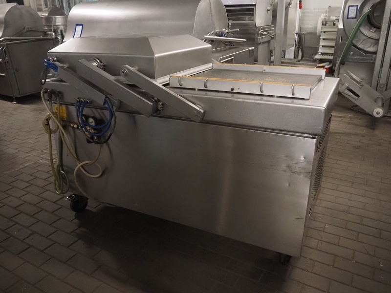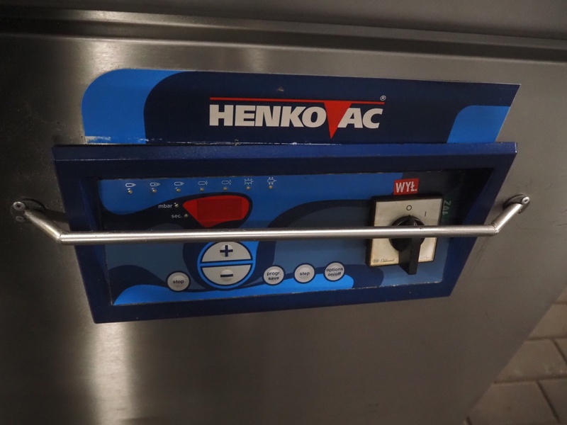 Henkovac mobile double chamber vacuum machine, model: E-403-XL, serial number: 20073122, year of construction: 2007, 380/400 V, 3 Ph, 50 Hz, 15 A, 368 kg, seal length: (4x) 700 mm, chamber: 570 mm x 700 mm x 150 mm, Busch vacuum pump, type: RA 0100 F 503, number: 070054356, capacity: 100m³ per hour, total dimensions: 1650 mm x 880 mm x 1230 mm.