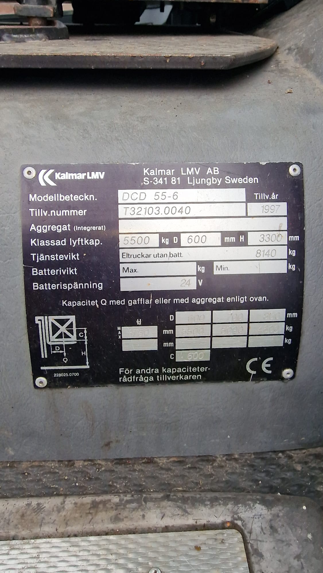 Kalmar LMV forklifter, model: DCD 55-6, number: T32103.0040, year of construction: 1997, 24 V, machine weight: 8140 kg, lifting capacity: 5500 kg, lifting height: 3760 mm, fork length: 1200 mm, total dimensions: 3500 mm x 1500 mm x 3500 mm. Lot located in Sławogóra (PL), viewing and pick up in consultation with Industrial Auctions B.V.