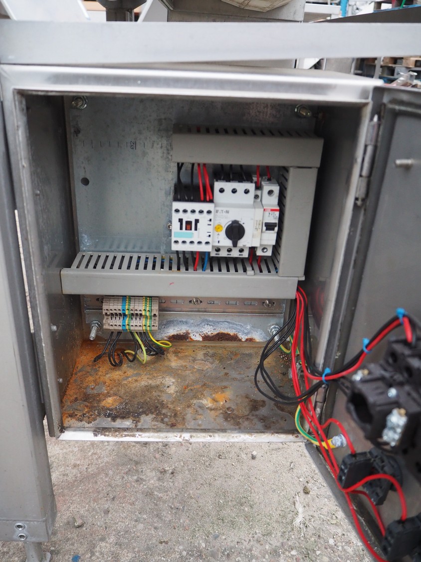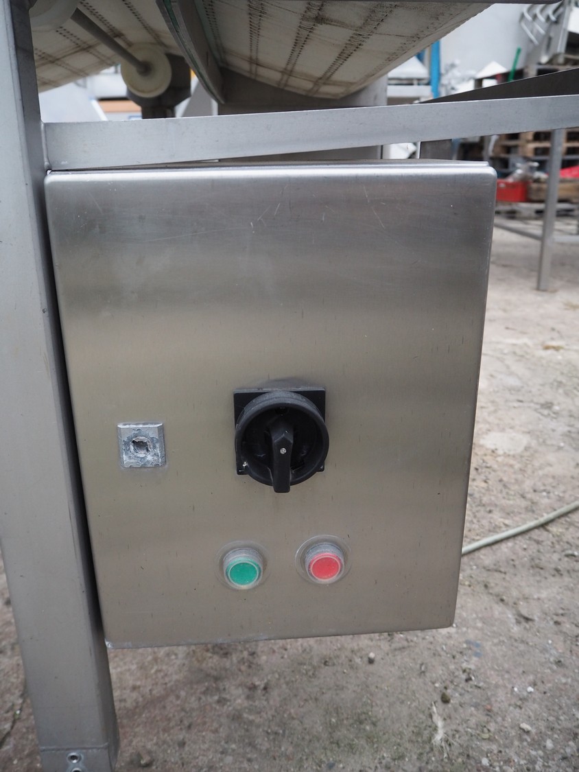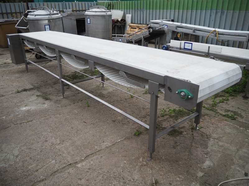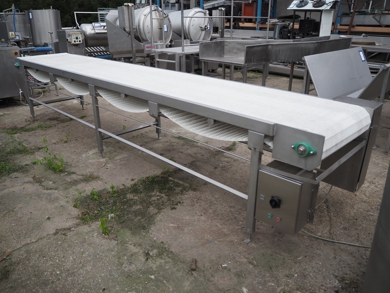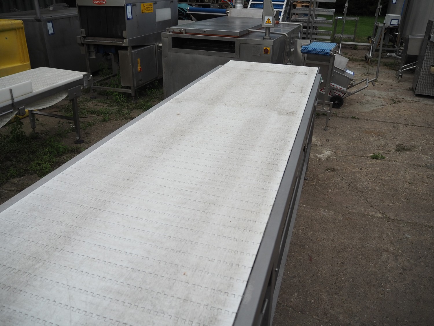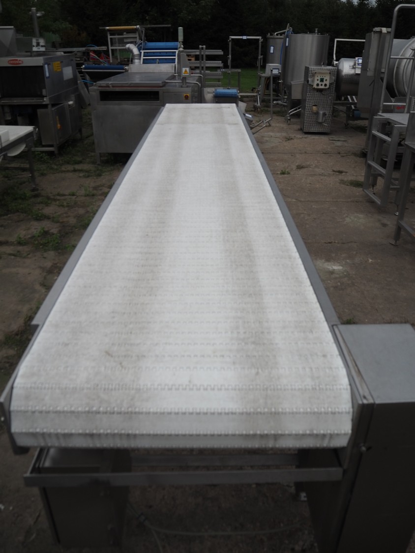 Transport belt, s/s frame, plastic belt, belt width: 800 mm, total dimensions: 5000 mm x 1100 mm x 900 mm.