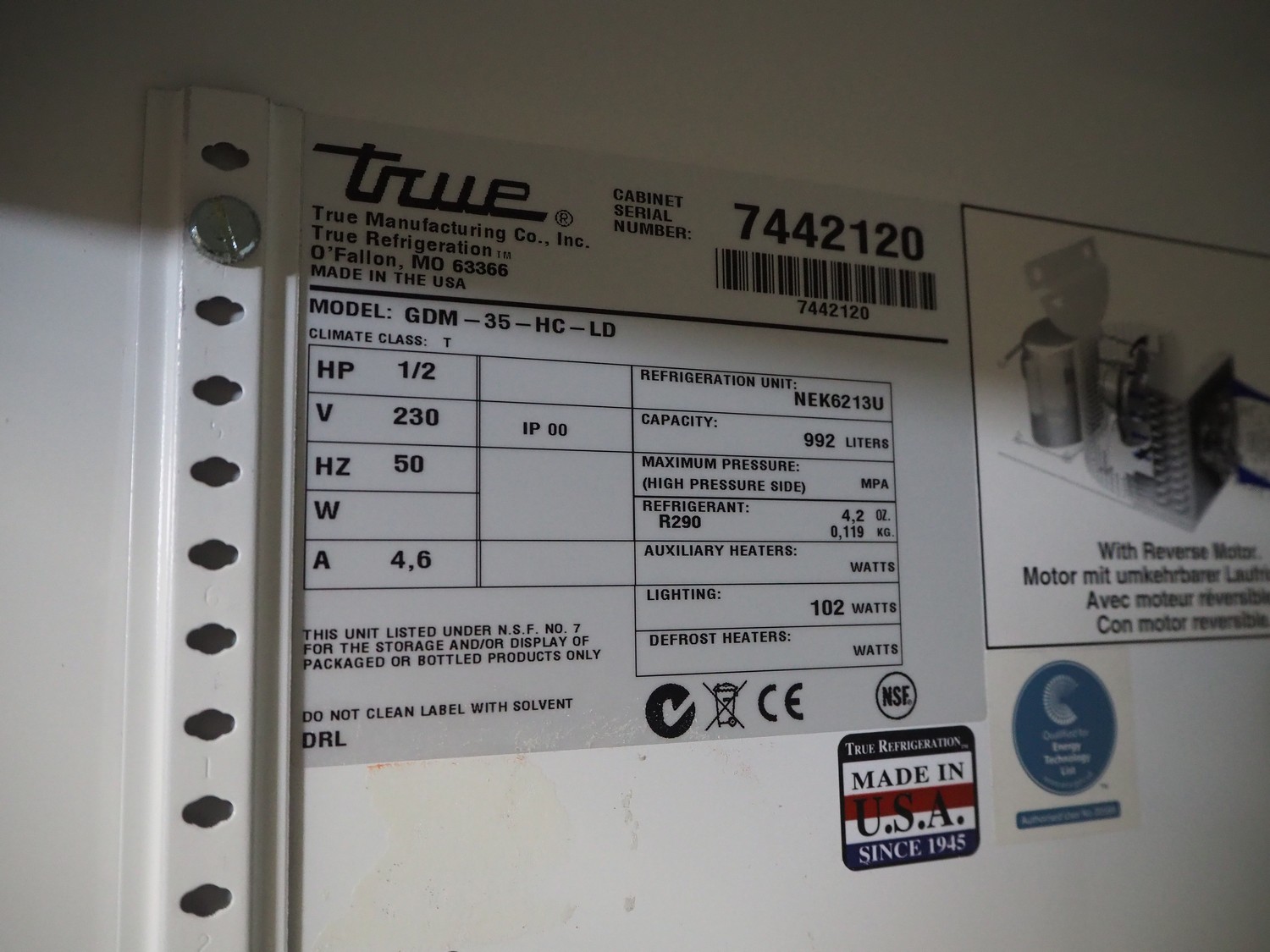 True refrigerator, model: GDM-35-HC-LD, serial number: 7442120, 230 V, 1 Ph, 50 Hz, 4.6 A, capacity: 992 liter, refrigerant: R290,