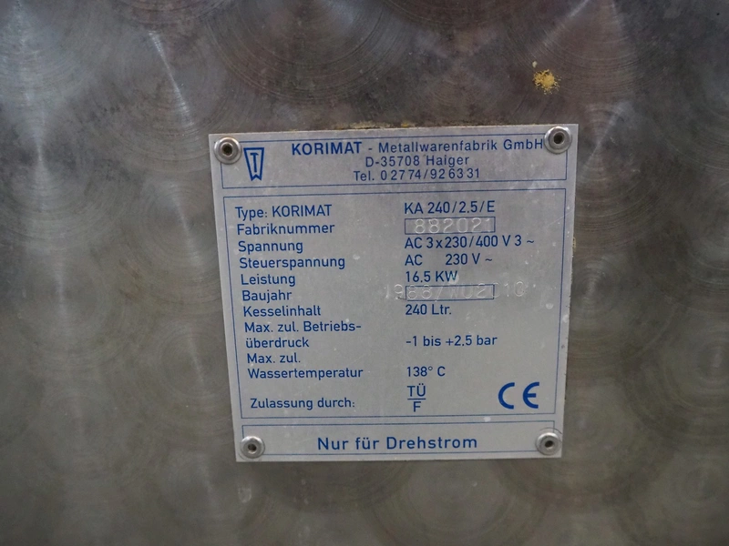 Korimat mobile autoclave, type: KA 240/2.5/E, number: 882021, year of construction: 1988, 230/400 V, 3 Ph, 50 Hz, 16.5 kW, capacity: 240 liter, dimensions: 1500 mm x 900 mm x 1400 mm.