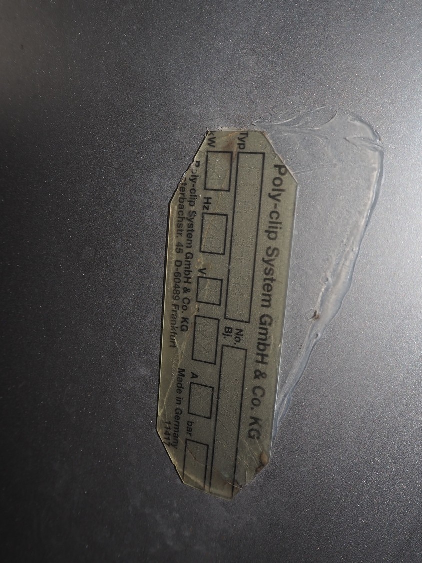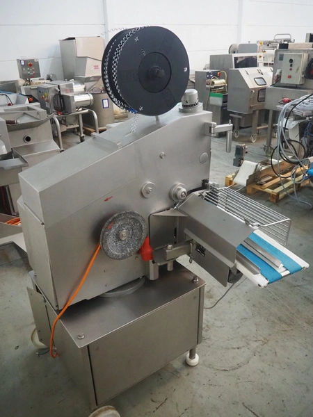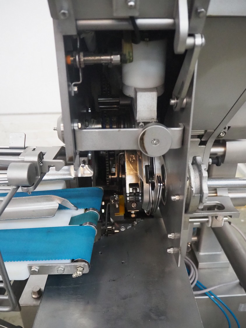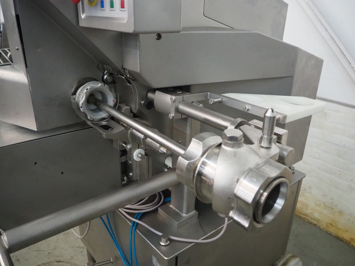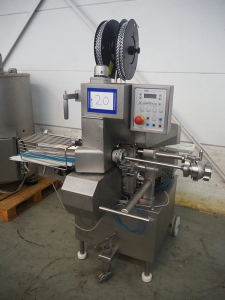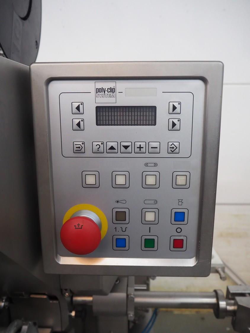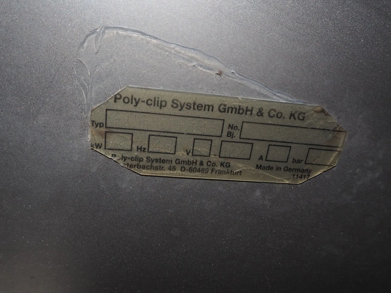 Poly-clip System GmbH & Co.KG mobile double clipper, type: 3430, number: 123, year of construction: 2005, 400 V, 3 Ph, 50 Hz, 5 A, 1 kW, plastic outfeed belt, belt width: (2x) 75 mm, total dimensions: 1550 mm x 1200 mm x 1950 mm.