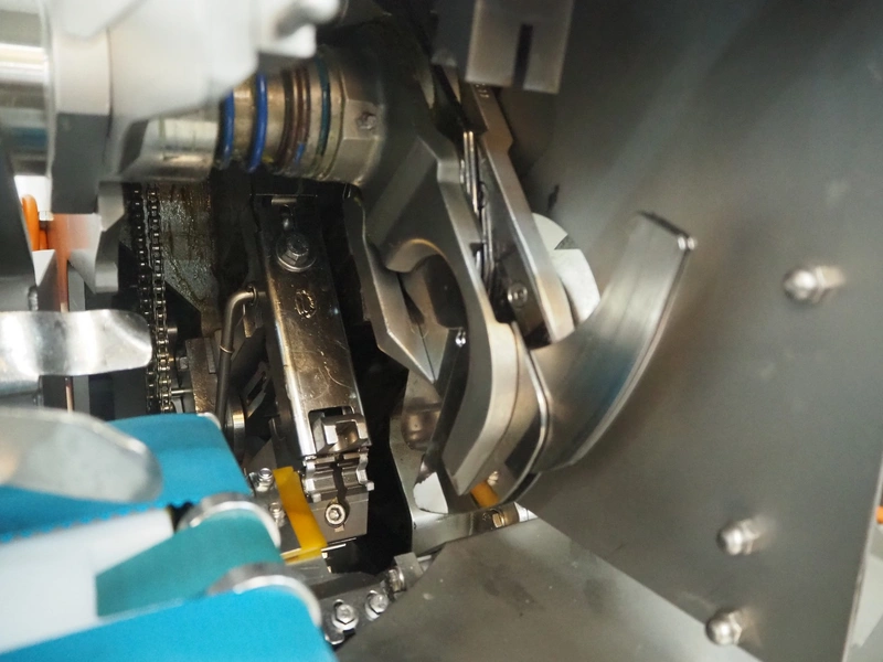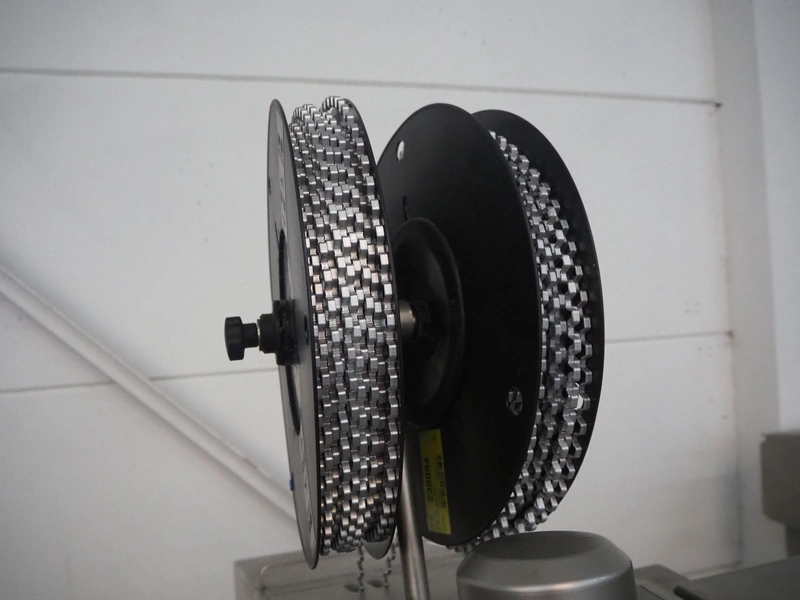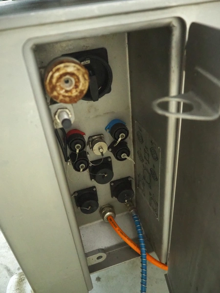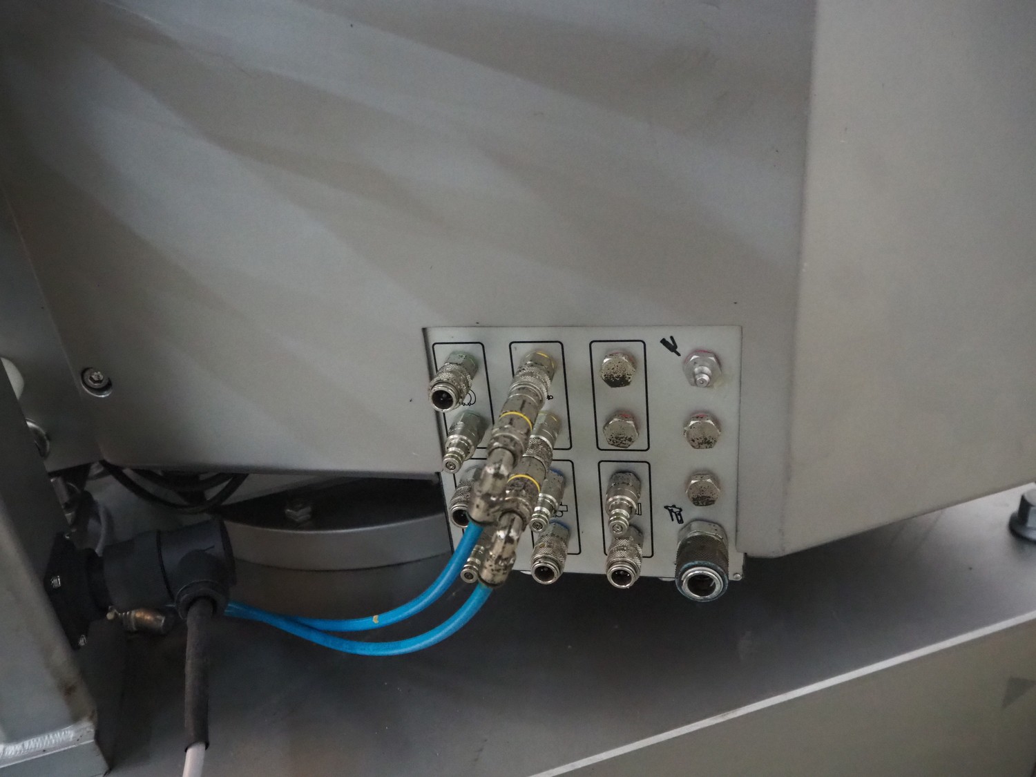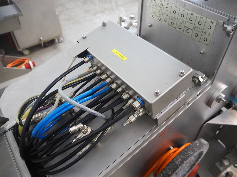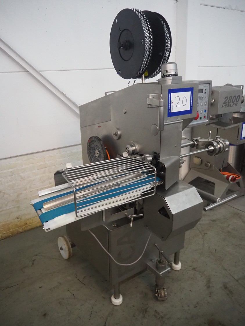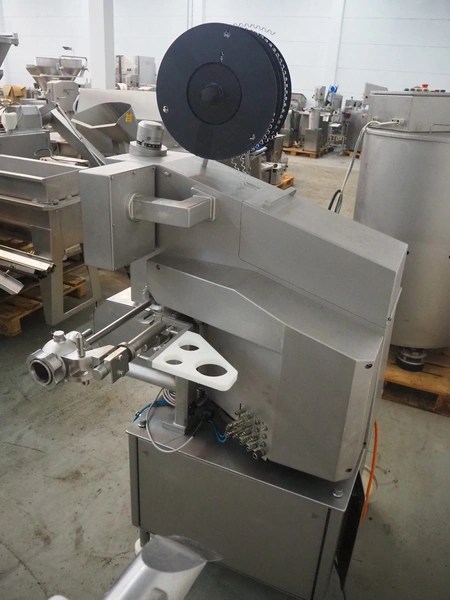 Poly-clip System GmbH & Co.KG mobile double clipper, type: 3430, number: 123, year of construction: 2005, 400 V, 3 Ph, 50 Hz, 5 A, 1 kW, plastic outfeed belt, belt width: (2x) 75 mm, total dimensions: 1550 mm x 1200 mm x 1950 mm.