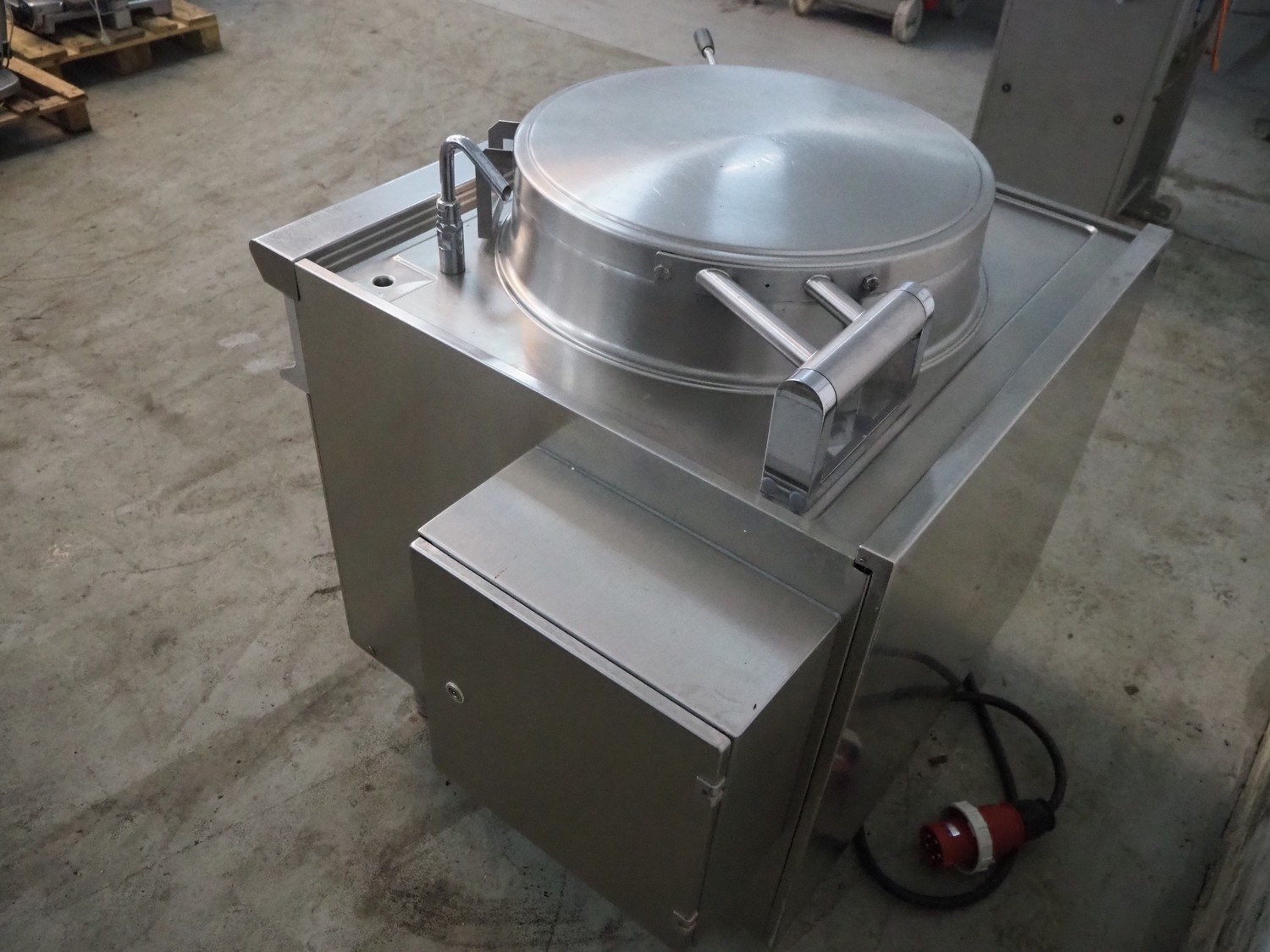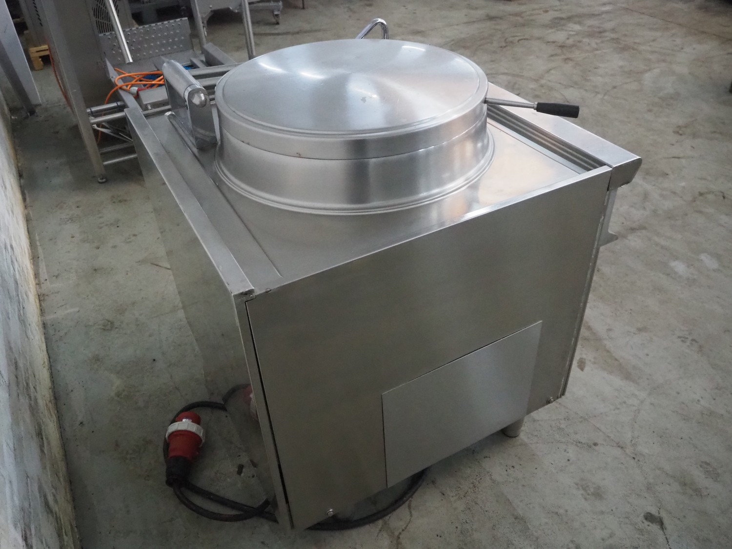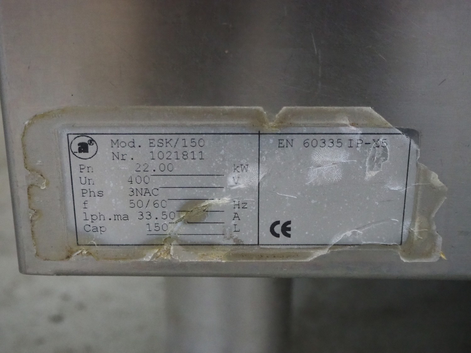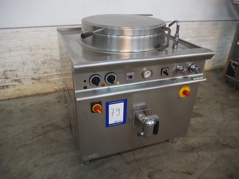 Ambach cooking vessel, model: ESK/150, number: 1021811, 400 V, 3 Ph, 50/60 Hz, 33.5 A, 22 kW, capacity: 150 liter, dimensions: 1120 mm x 1000 mm x 1050 mm.