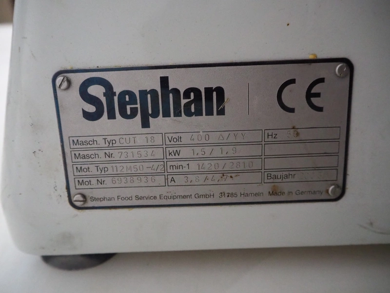 Stephan universal machine, type: Cut 18, machine number: 731534, year of construction: 2006, 400 V, 50 Hz, 3.8/4.7 A, 1.5/1.9 kW, 1420 / 2810 min-1, volume: 18 liter, dimensions: 500 mm x 350 mm x 670 mm.