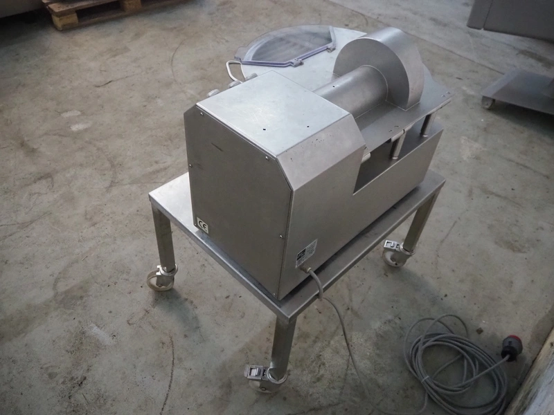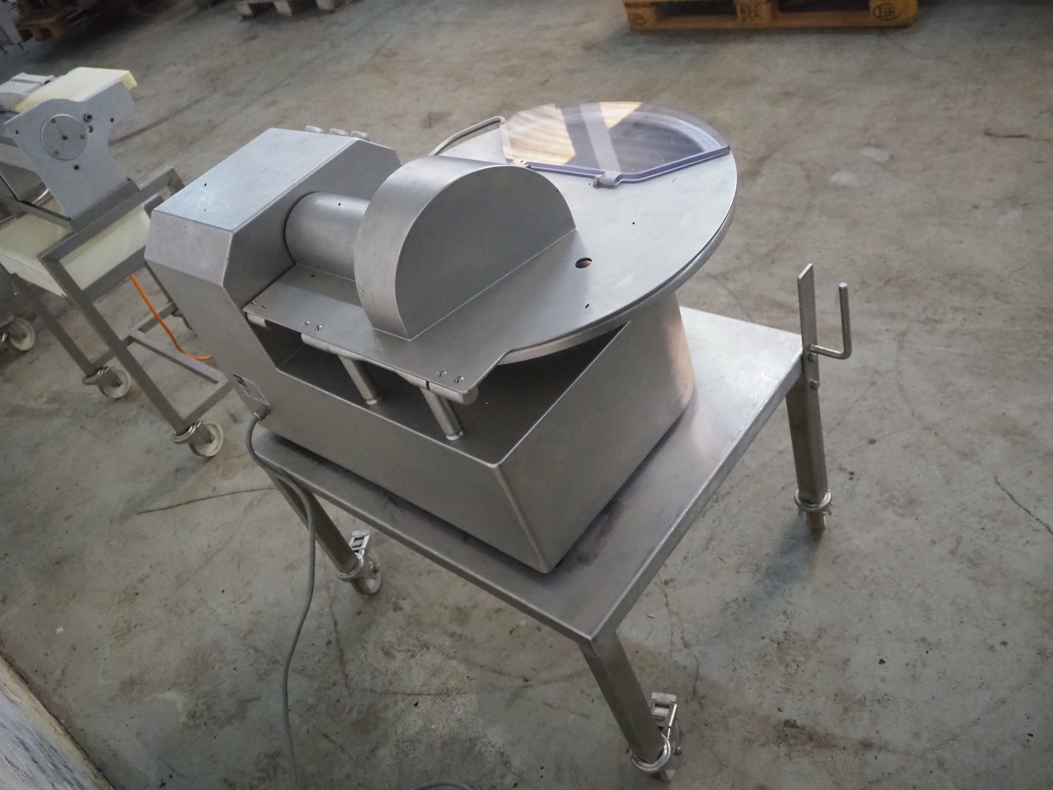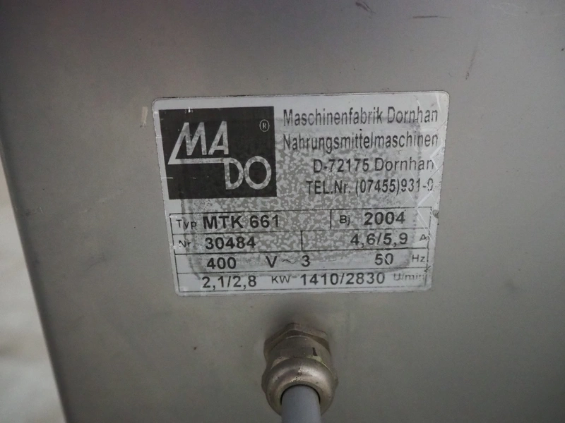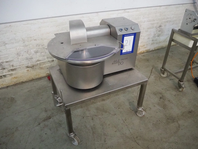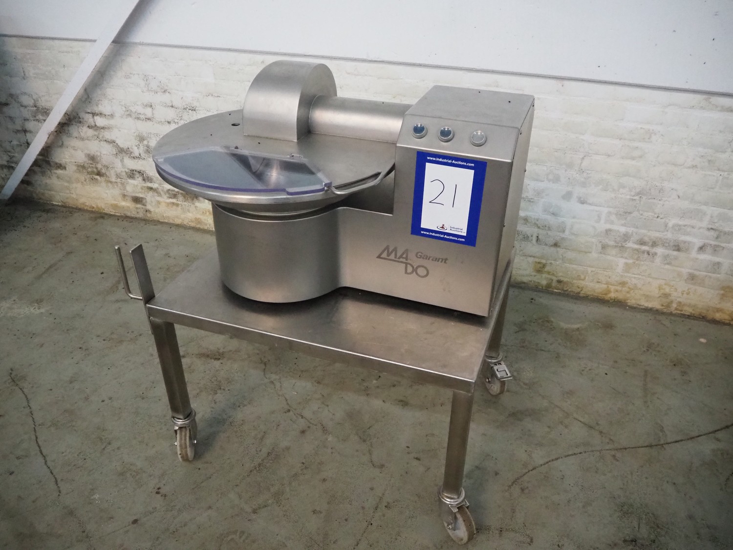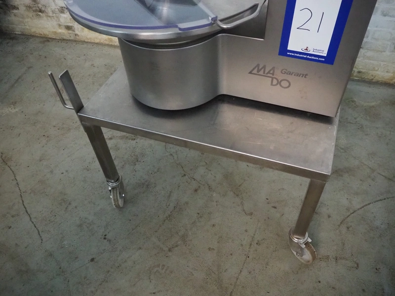 Mado cutter on s/s mobile table, type: MTK 661, number: 30484, year of construction: 2004, 400 V, 3 Ph, 50 Hz, 4.6/5.9 A, 2.1/2.8 kW, s/s bowl, diameter bowl: 500 mm, total dimensions: 900 mm x 600 mm x 1050 mm.