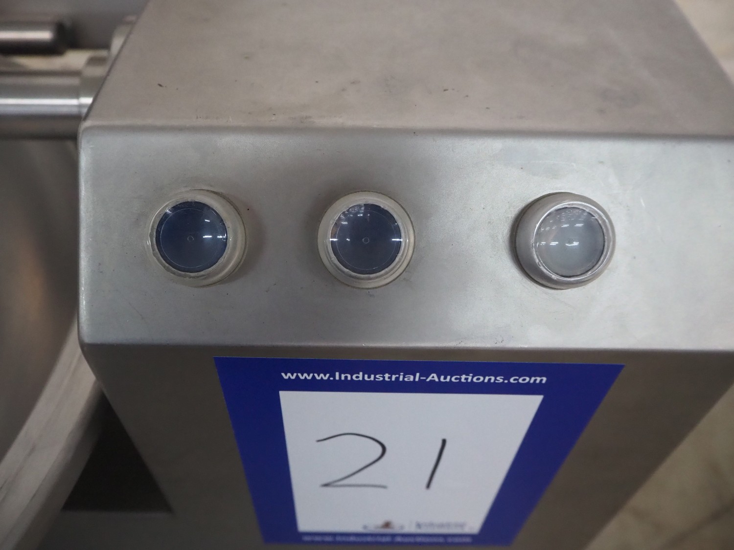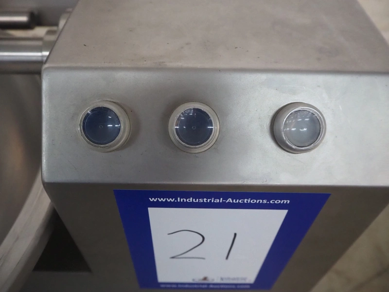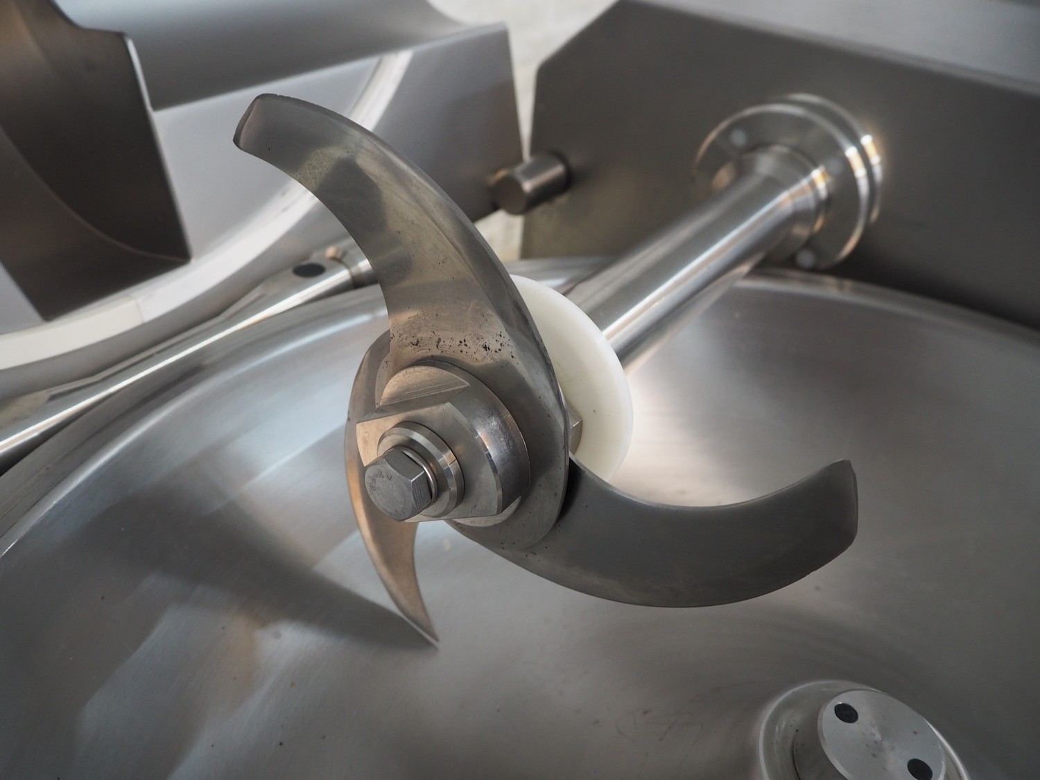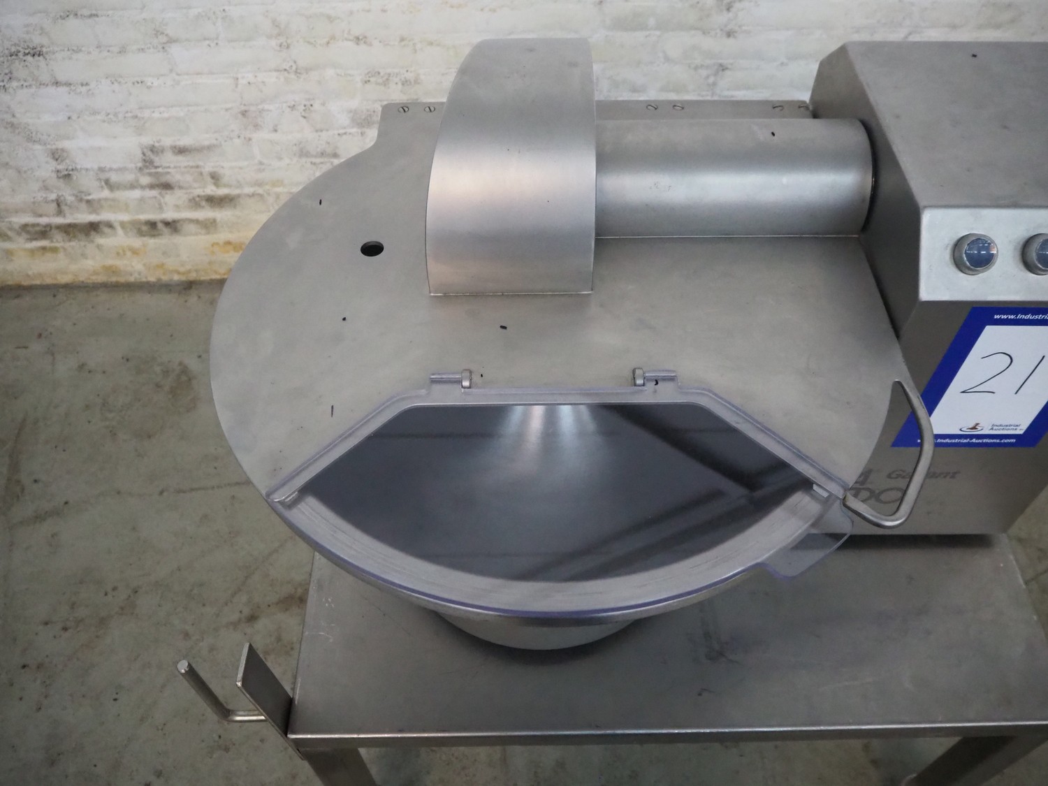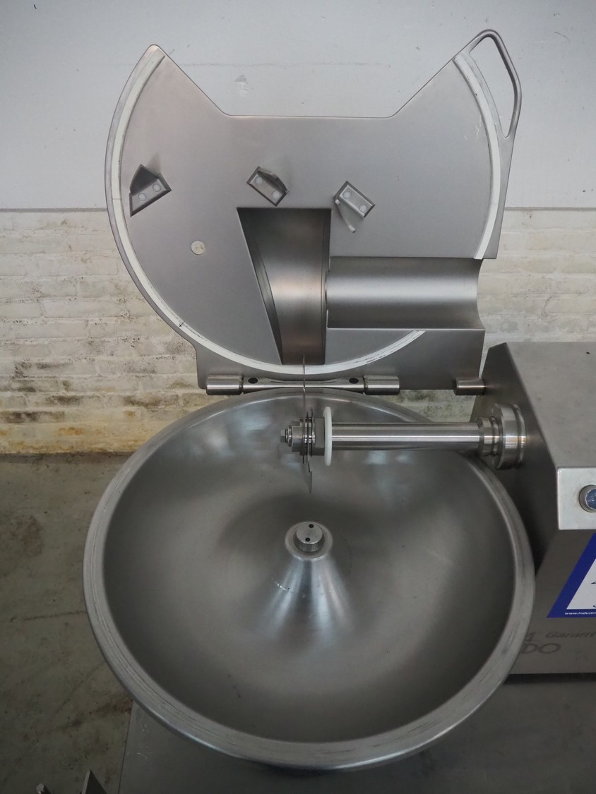 Mado cutter on s/s mobile table, type: MTK 661, number: 30484, year of construction: 2004, 400 V, 3 Ph, 50 Hz, 4.6/5.9 A, 2.1/2.8 kW, s/s bowl, diameter bowl: 500 mm, total dimensions: 900 mm x 600 mm x 1050 mm.