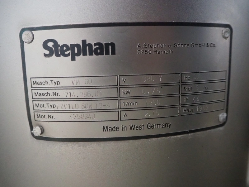 Stephan mobile universal machine, type: VM 60, machine number: 714.286.01, year of construction: 1989, 380 V, 3 Ph, 50 Hz, 0.75 kW, 2.15 A, volume: 60 liter, 1350 rpm, dimensions: 900 mm x 600 mm x 1150 mm.