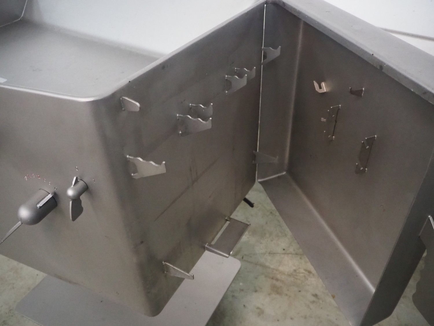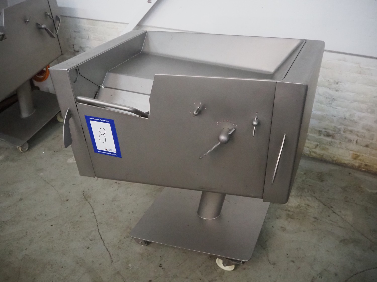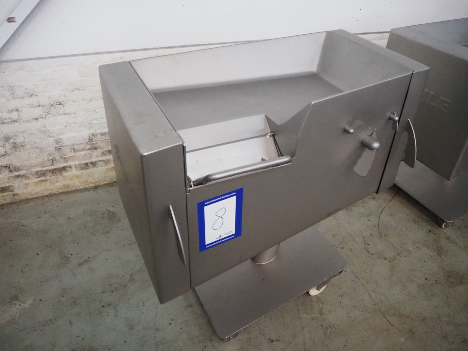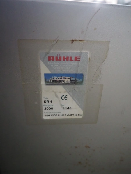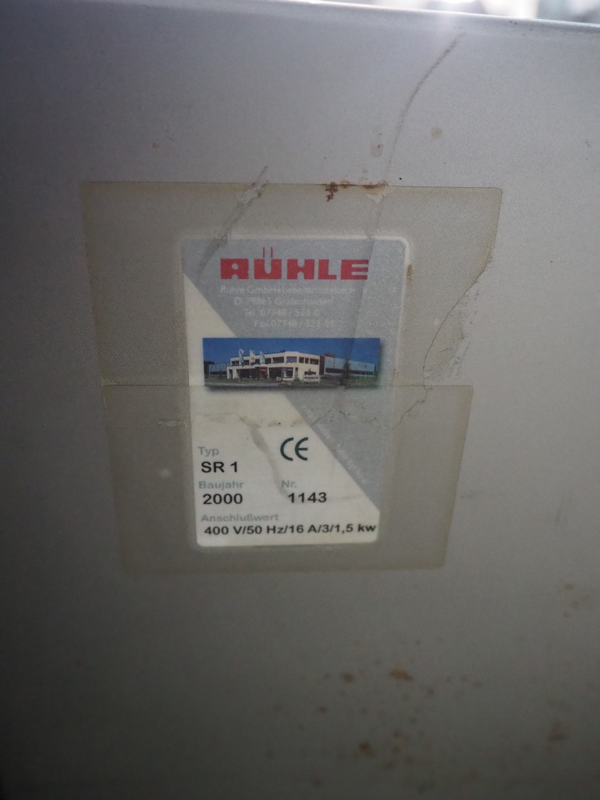 Rühle mobile dicer, type: SR 1, number: 1143, year of construction: 2000, 400 V, 50 Hz, 16 A, 3/1.5 kW, dimensions chamber: 100 mm x 100 mm, total dimensions: 1000 mm x 660 mm x 1100 mm.