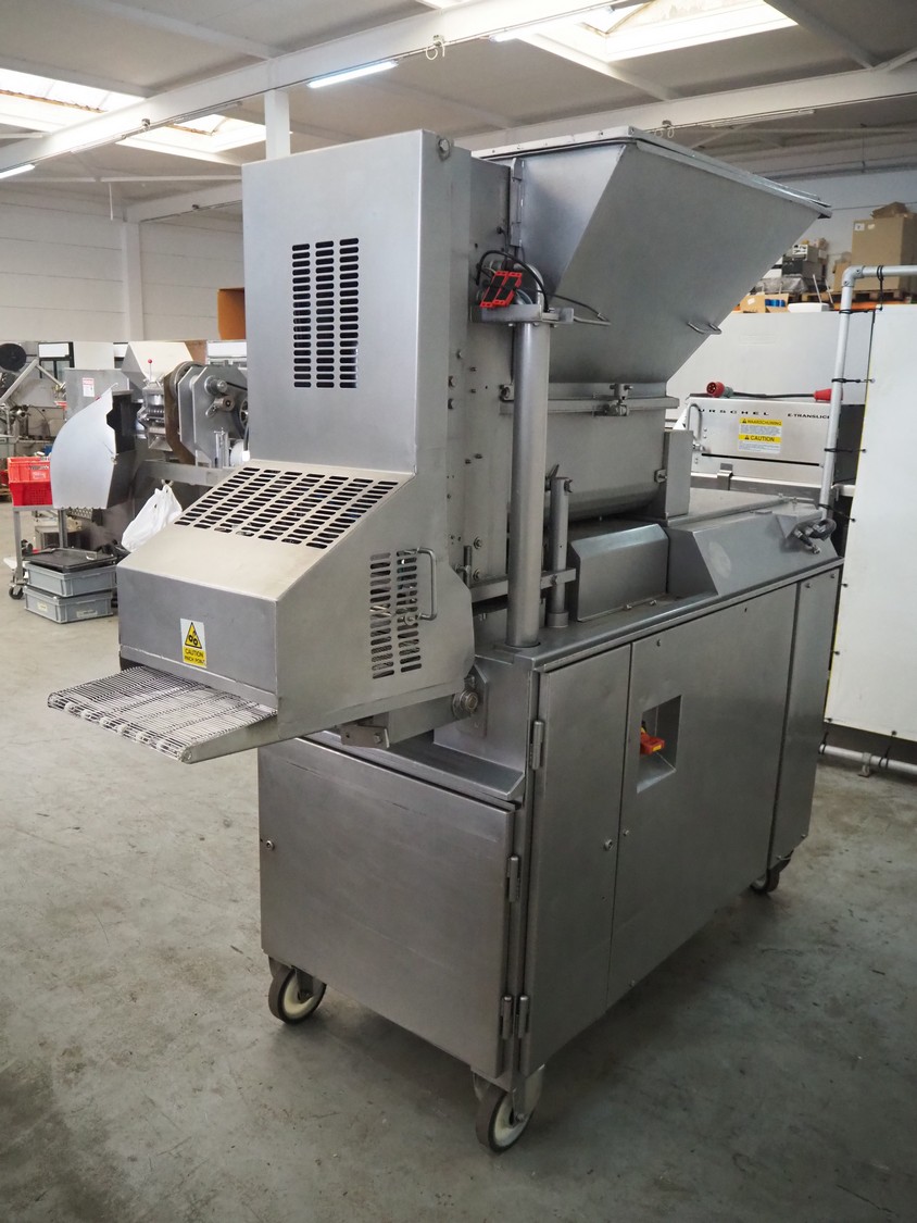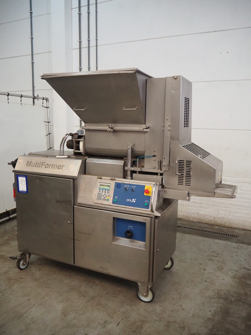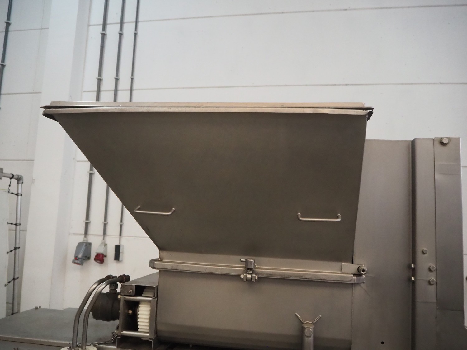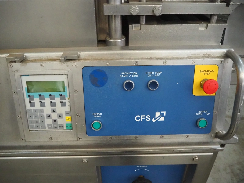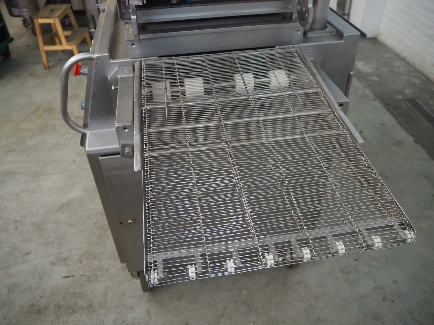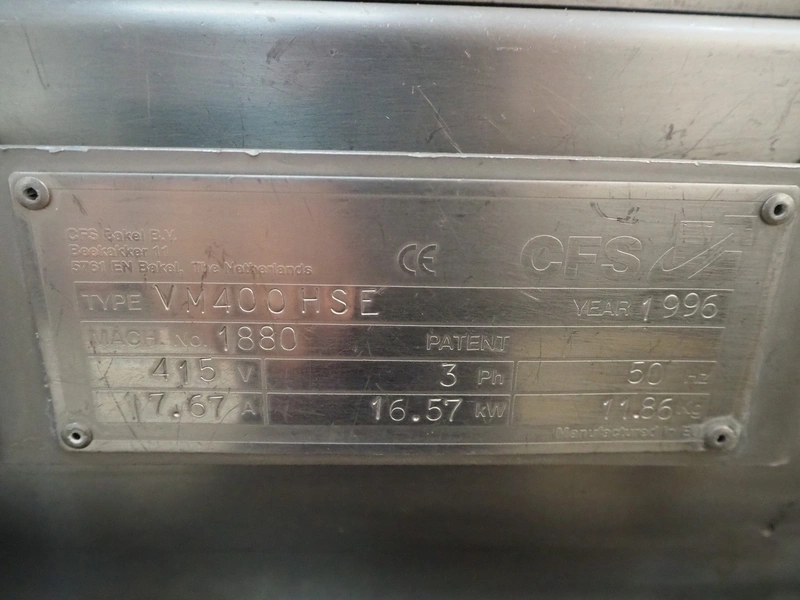 CFS mobile forming machine, type: VM400HSE, machine number: 1880, year of construction: 1996, 415 V, 3 Ph, 50 Hz, 17.67 A, 16.57 kW, weight: 1186 kg, inside dimensions hopper: 600 mm x 200 mm x 700 mm, s/s mesh belt, belt width: 400 mm, total dimensions: 2500 mm x 900 mm x 2100 mm.