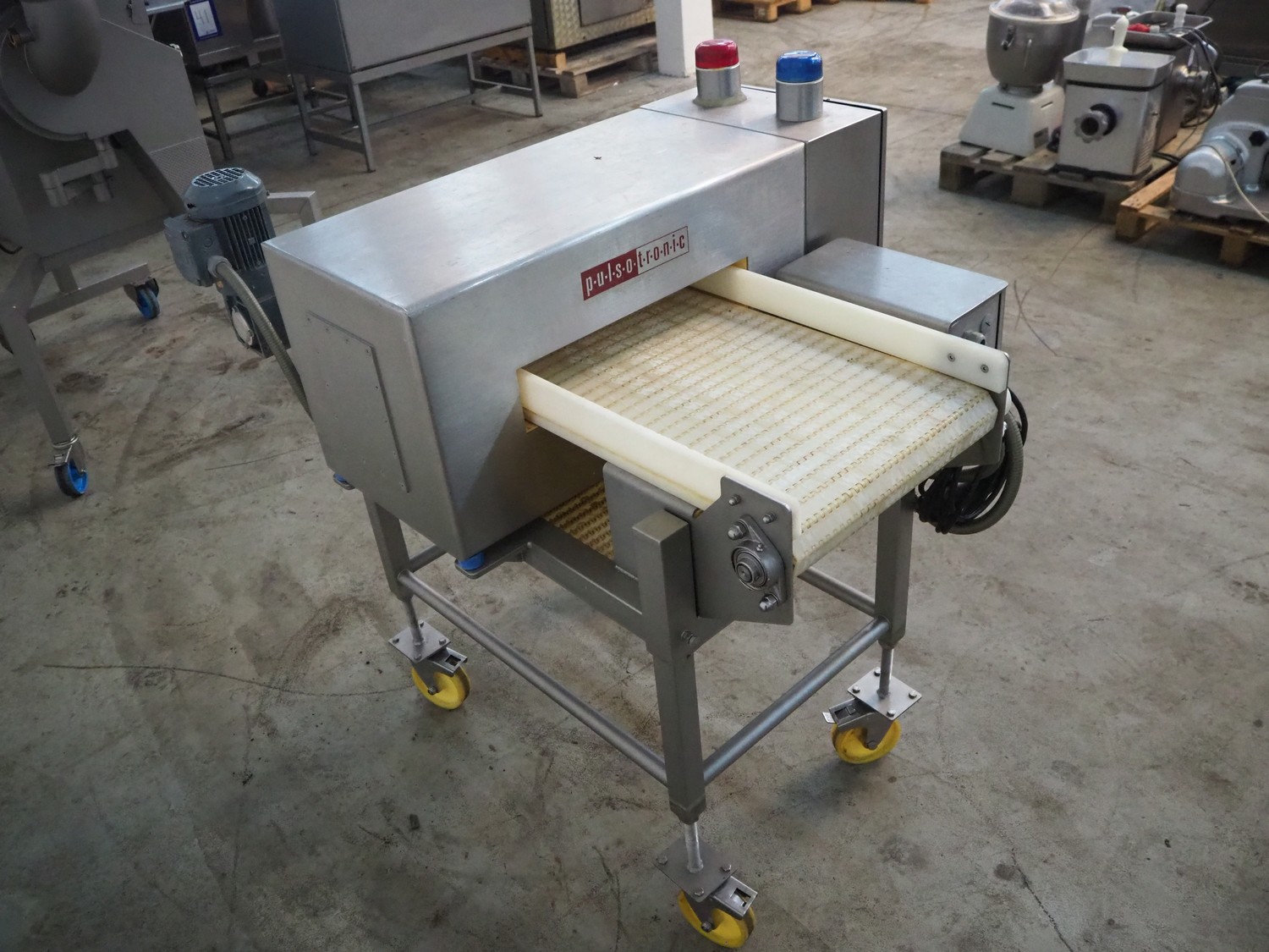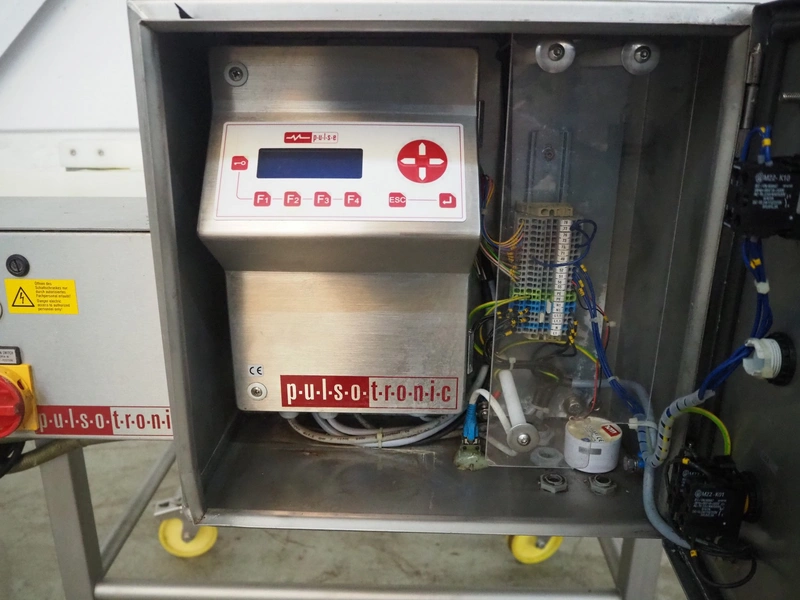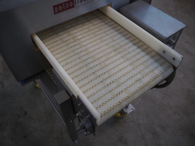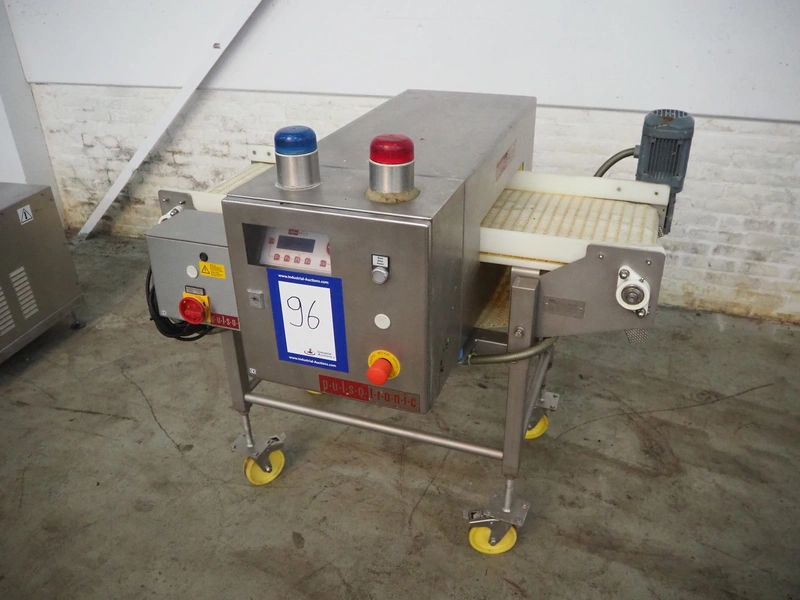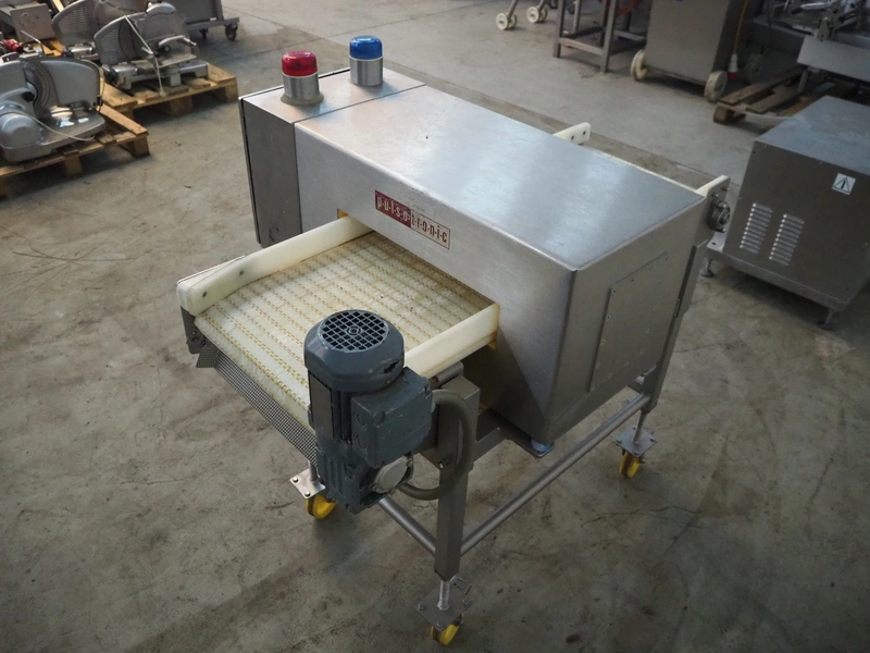 Pulsotronic mobile metal detector, type: M-Pulse BD 450x100 LPW, serial number: 90002719, year of construction: 2010, 230 V, 1 Ph, 50-60 Hz, 350 W, plastic belt, belt width: 405 mm, clearance: 450 mm x 70 mm, total dimensions: 1200 mm x 940 mm x 1160 mm.