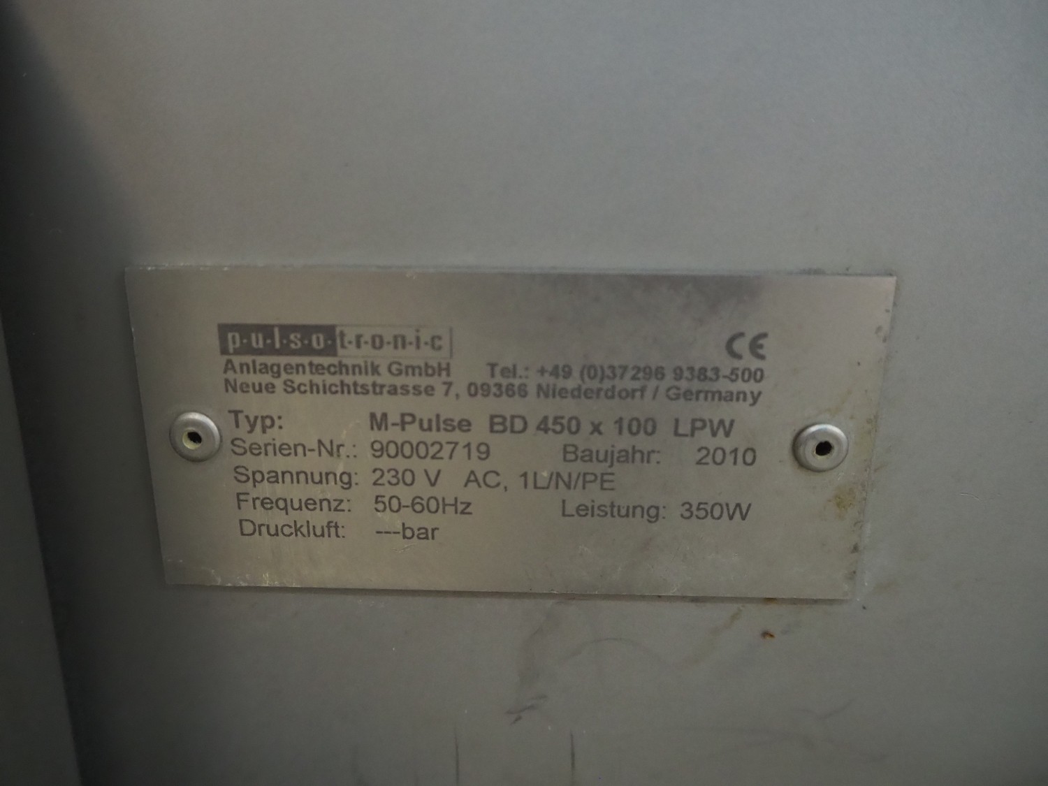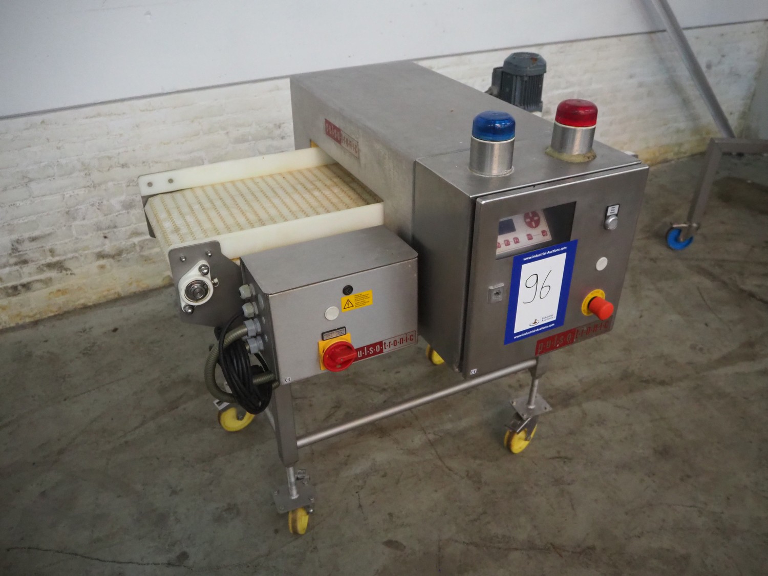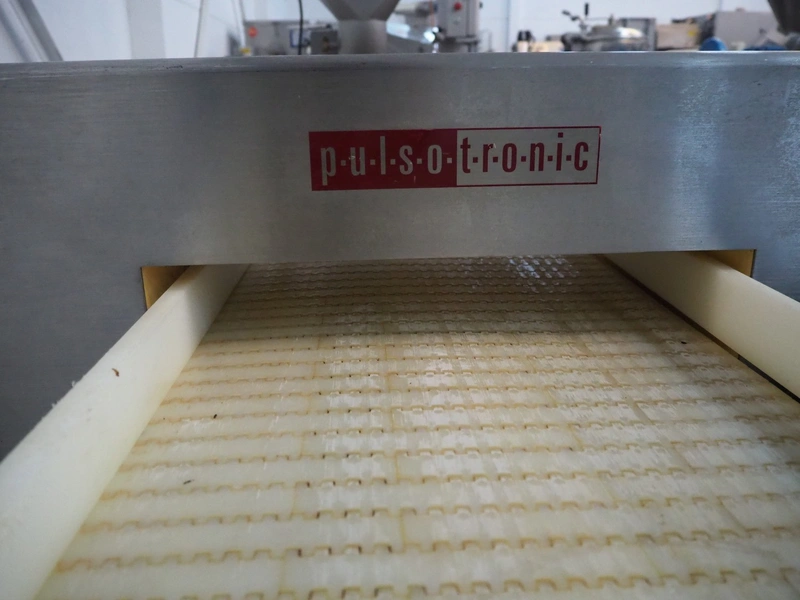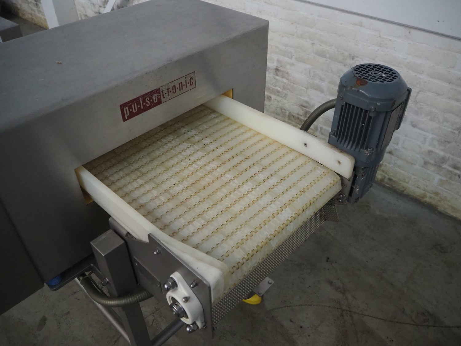 Pulsotronic mobile metal detector, type: M-Pulse BD 450x100 LPW, serial number: 90002719, year of construction: 2010, 230 V, 1 Ph, 50-60 Hz, 350 W, plastic belt, belt width: 405 mm, clearance: 450 mm x 70 mm, total dimensions: 1200 mm x 940 mm x 1160 mm.