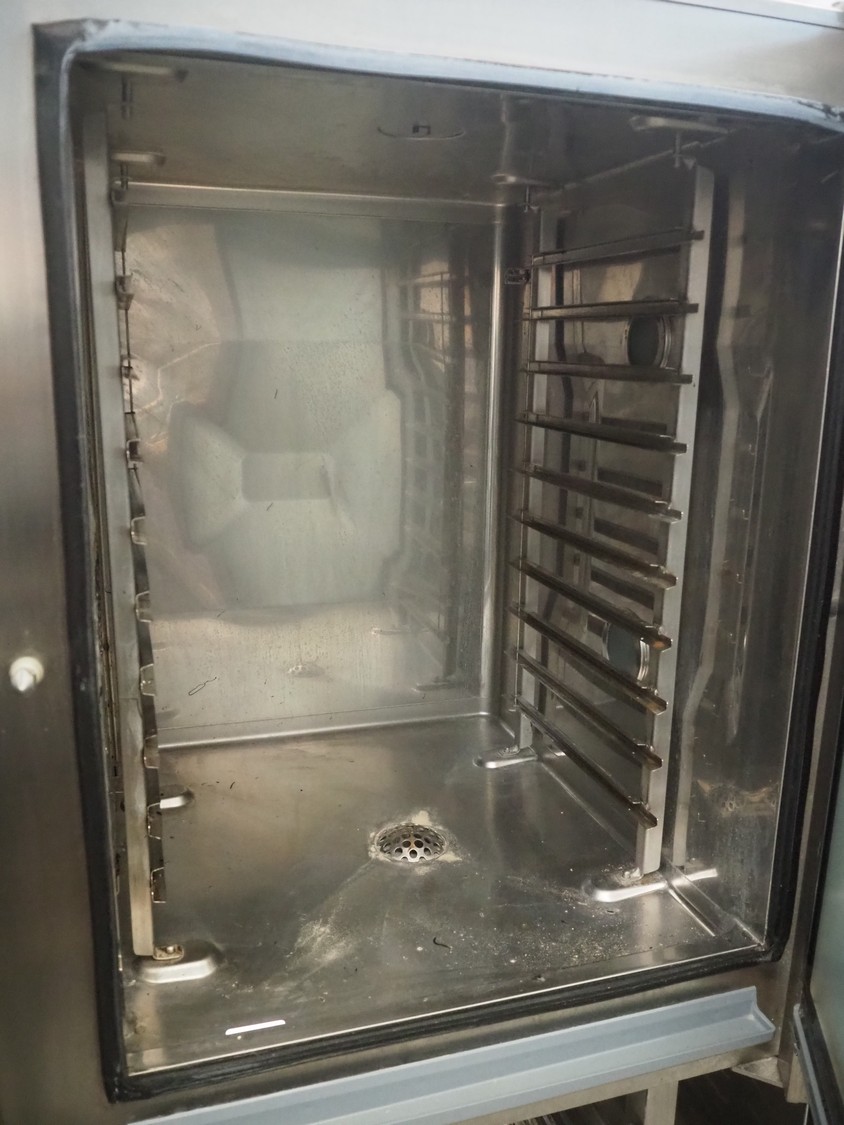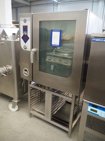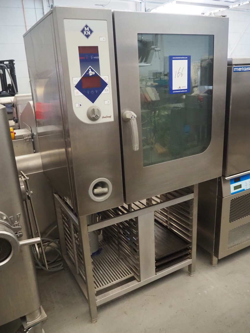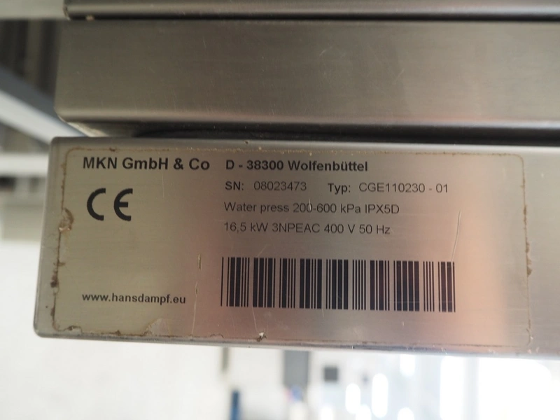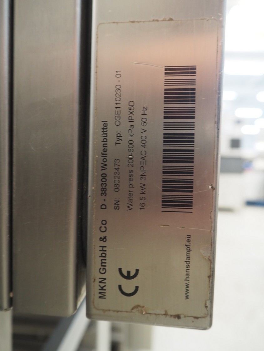 MKN combi steamer, type: CGE110230-01, serial number: 08023473, 400 V,3 Ph, 50 Hz, 16.5 kW, 10 floors, dimensions each floor: 530 mm x 400 mm, total dimensions: 1000 mm x 840 mm x 1820 mm.
