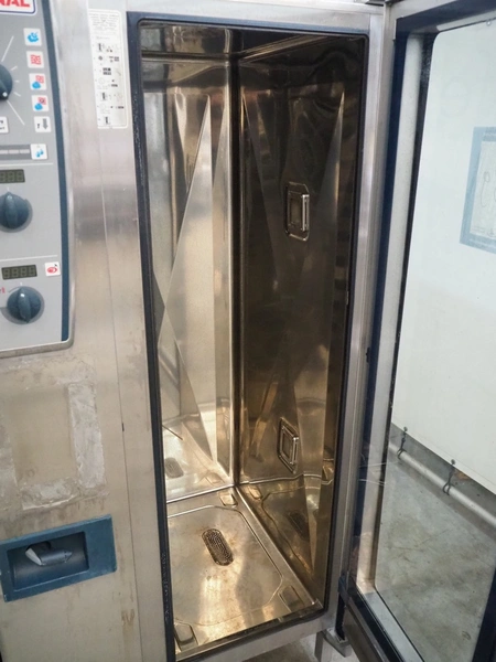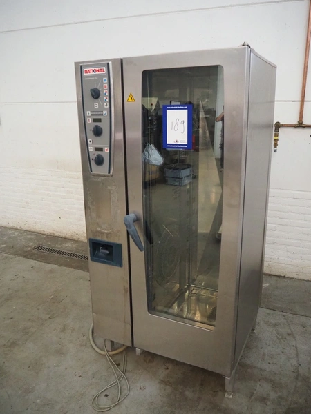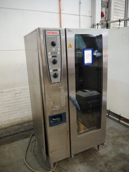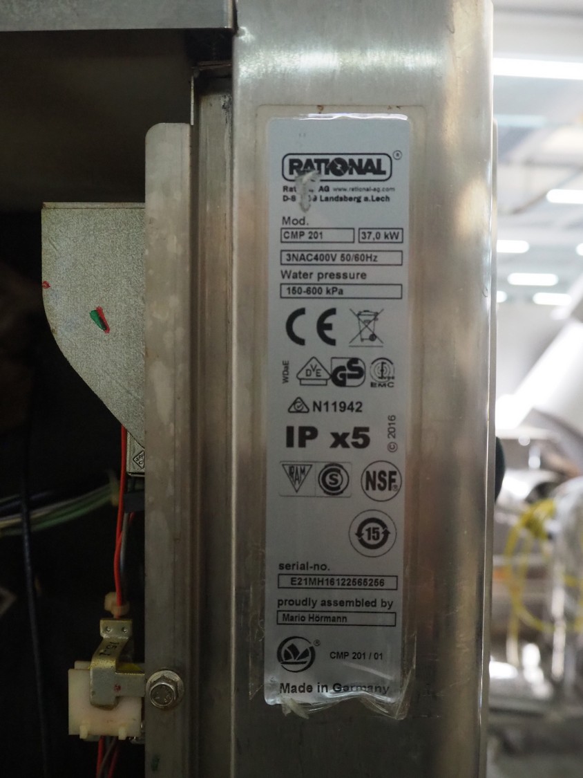 Rational combi steamer, model: CMP 201, serial number: E21MH18122666266, year of construction: 2016, 400 V, 3 Ph, 50/60 Hz, 37 kW, 150-600 kPa, inside dimensions: 700 mm x 450 mm x 1500 mm, total dimensions: 900 mm x 800 mm x 1800 mm.