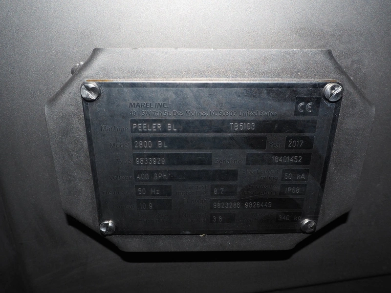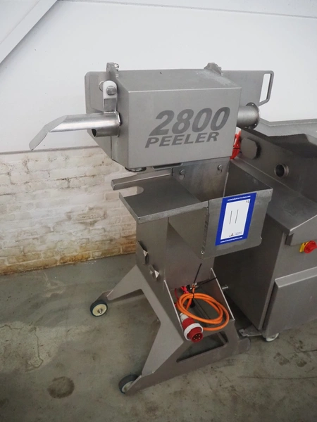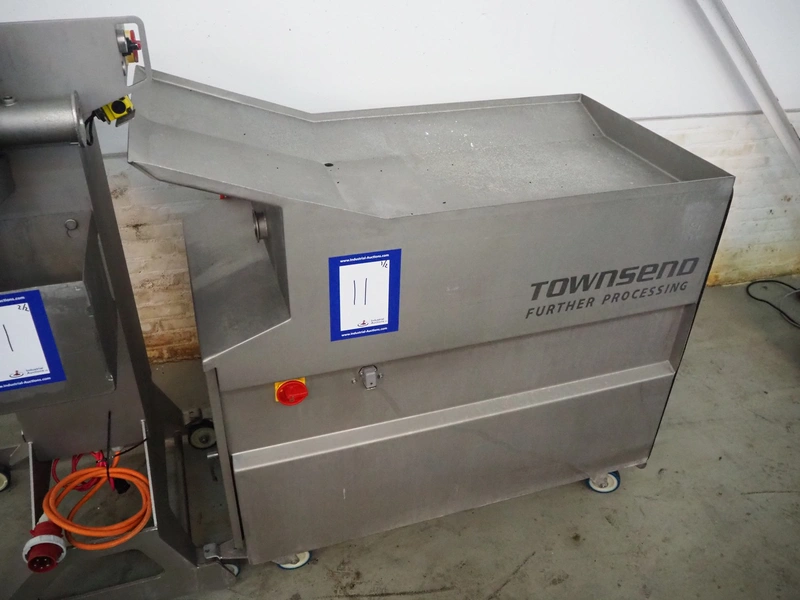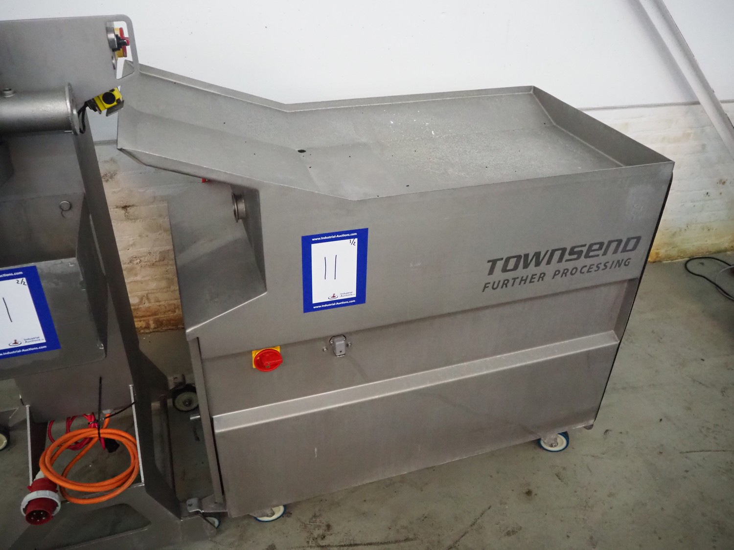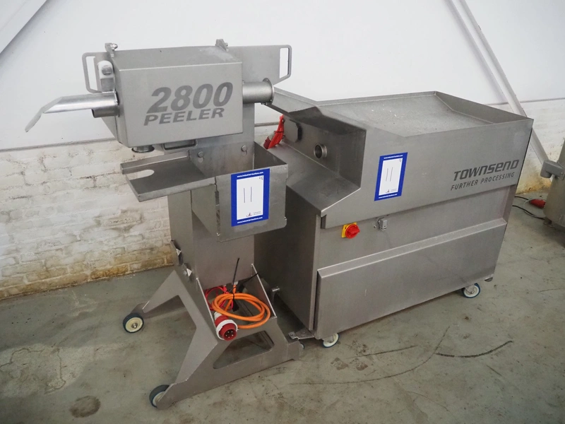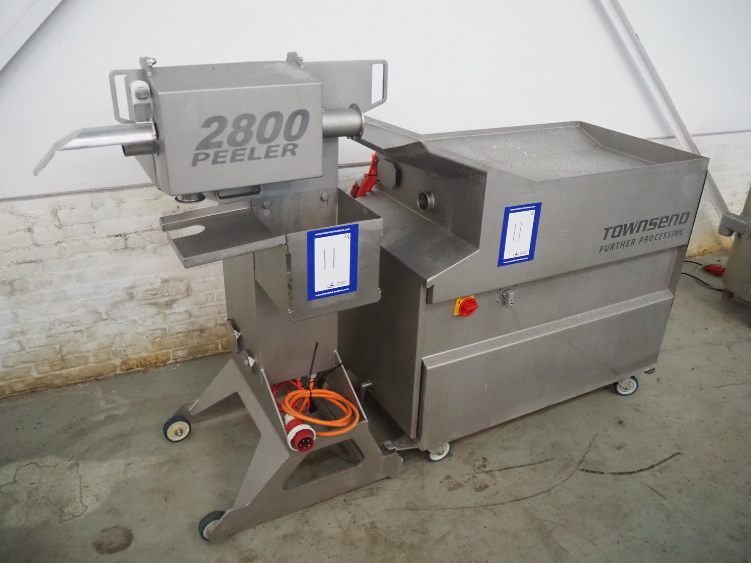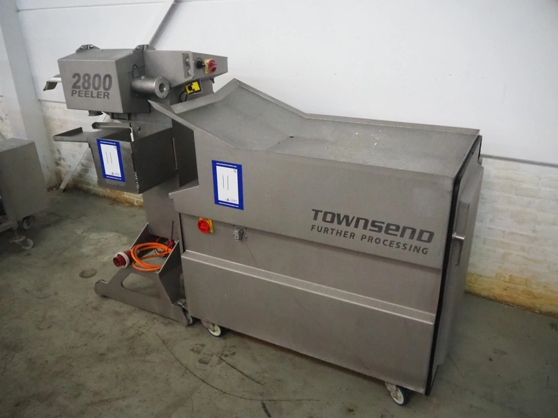 Townsend mobile sausage peeler with infeed table, model: 2800 BL, type: 9833929, serial number: 10401452, year of construction: 2017, 400 V, 3 Ph, 50 Hz, weight: 340 kg, dimensions: 700 mm x 950 mm x 1440 mm and 670 mm x 1350 mm x 1200 mm.