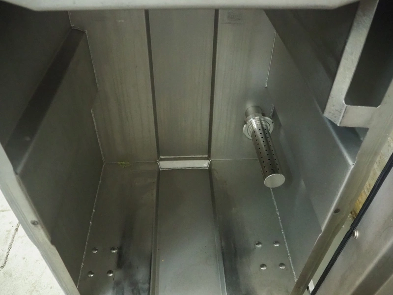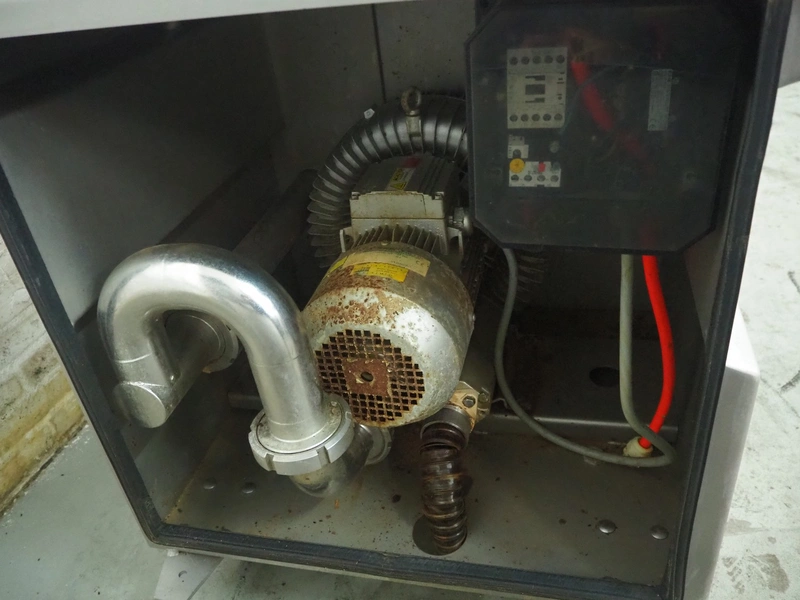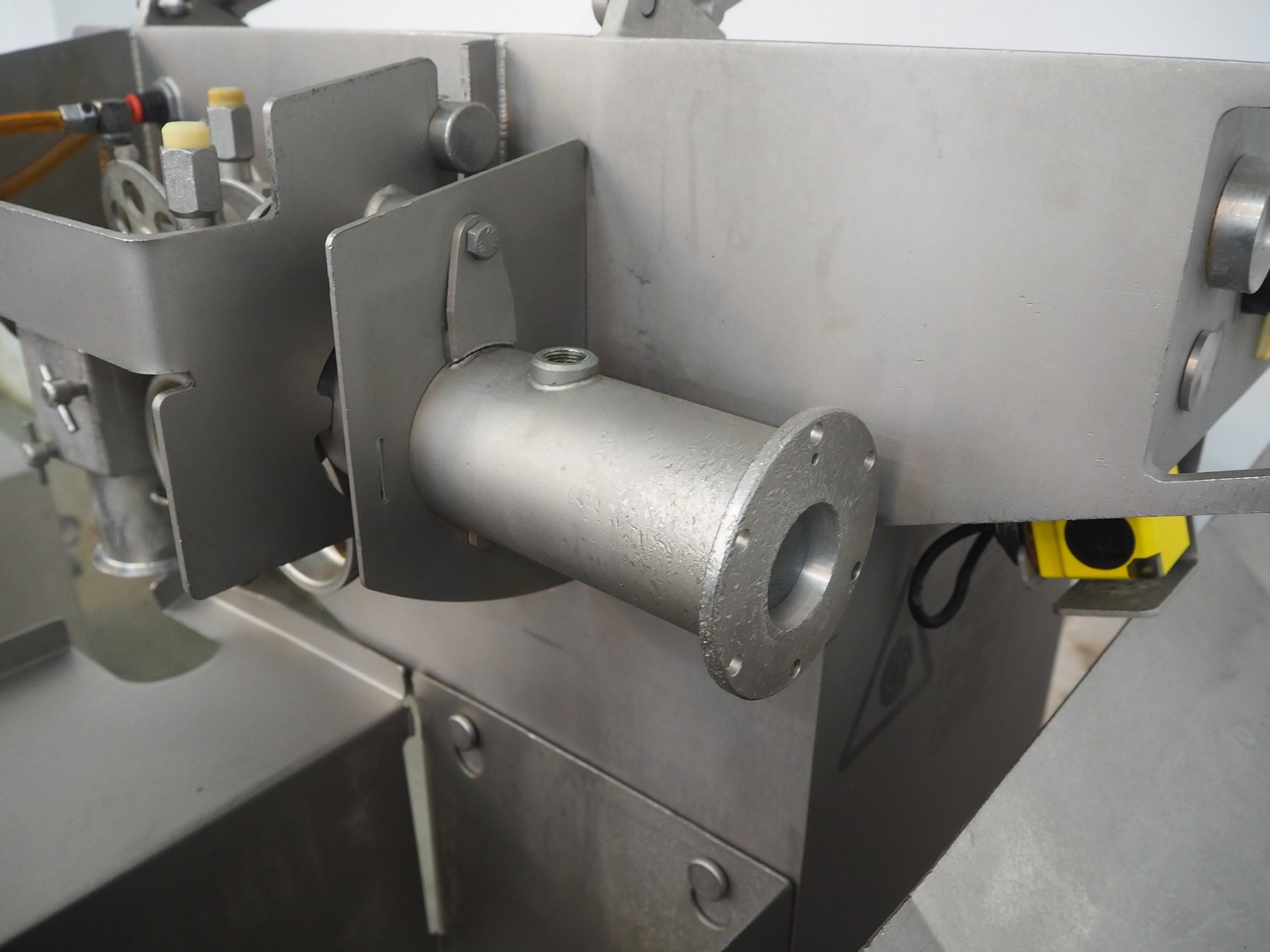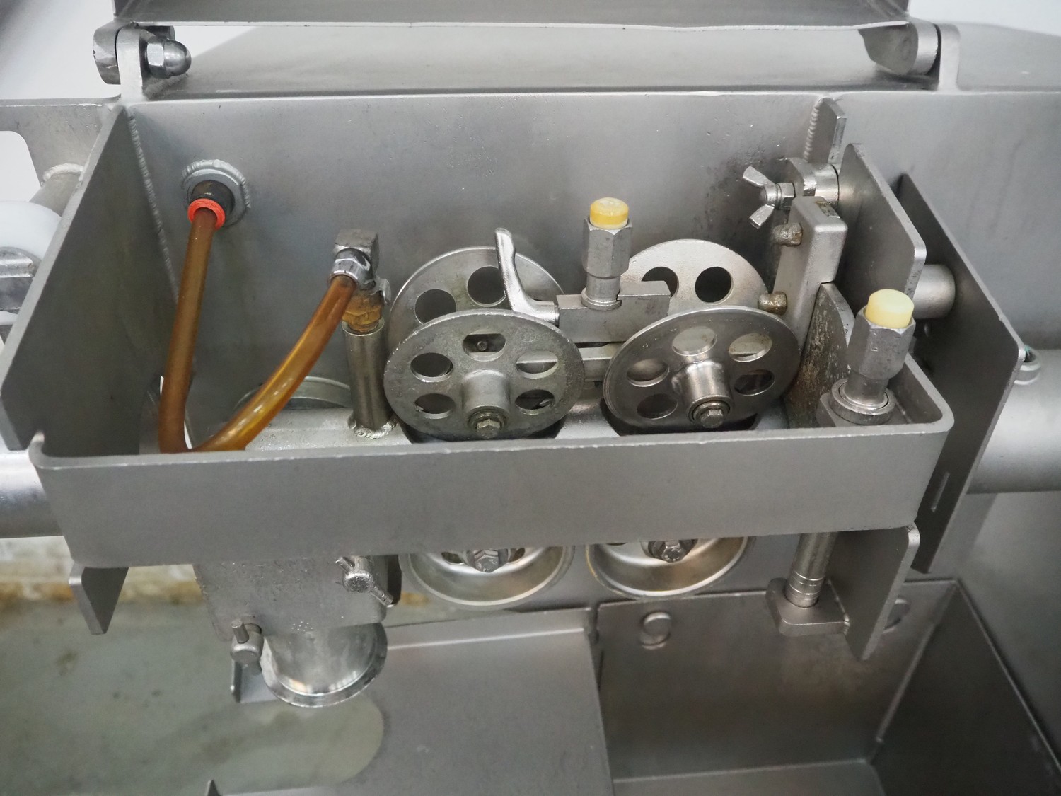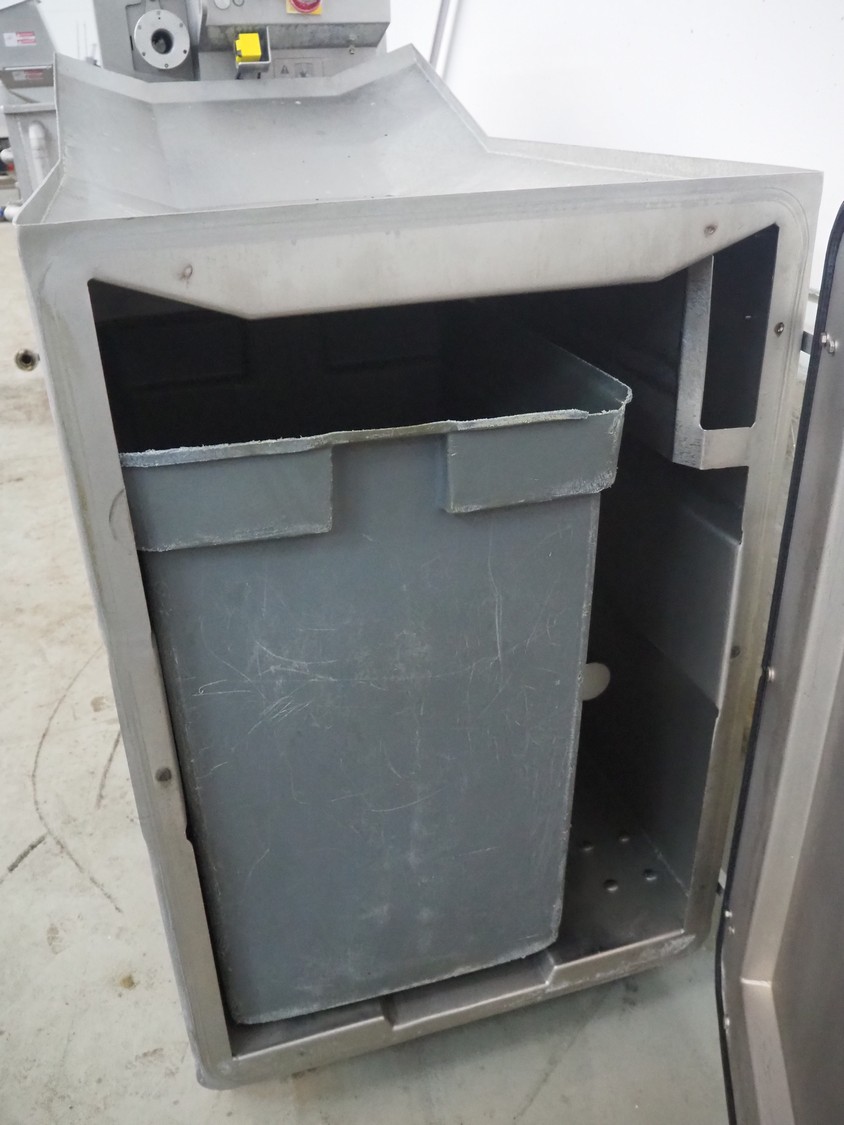 Townsend mobile sausage peeler with infeed table, model: 2800 BL, type: 9833929, serial number: 10401452, year of construction: 2017, 400 V, 3 Ph, 50 Hz, weight: 340 kg, dimensions: 700 mm x 950 mm x 1440 mm and 670 mm x 1350 mm x 1200 mm.