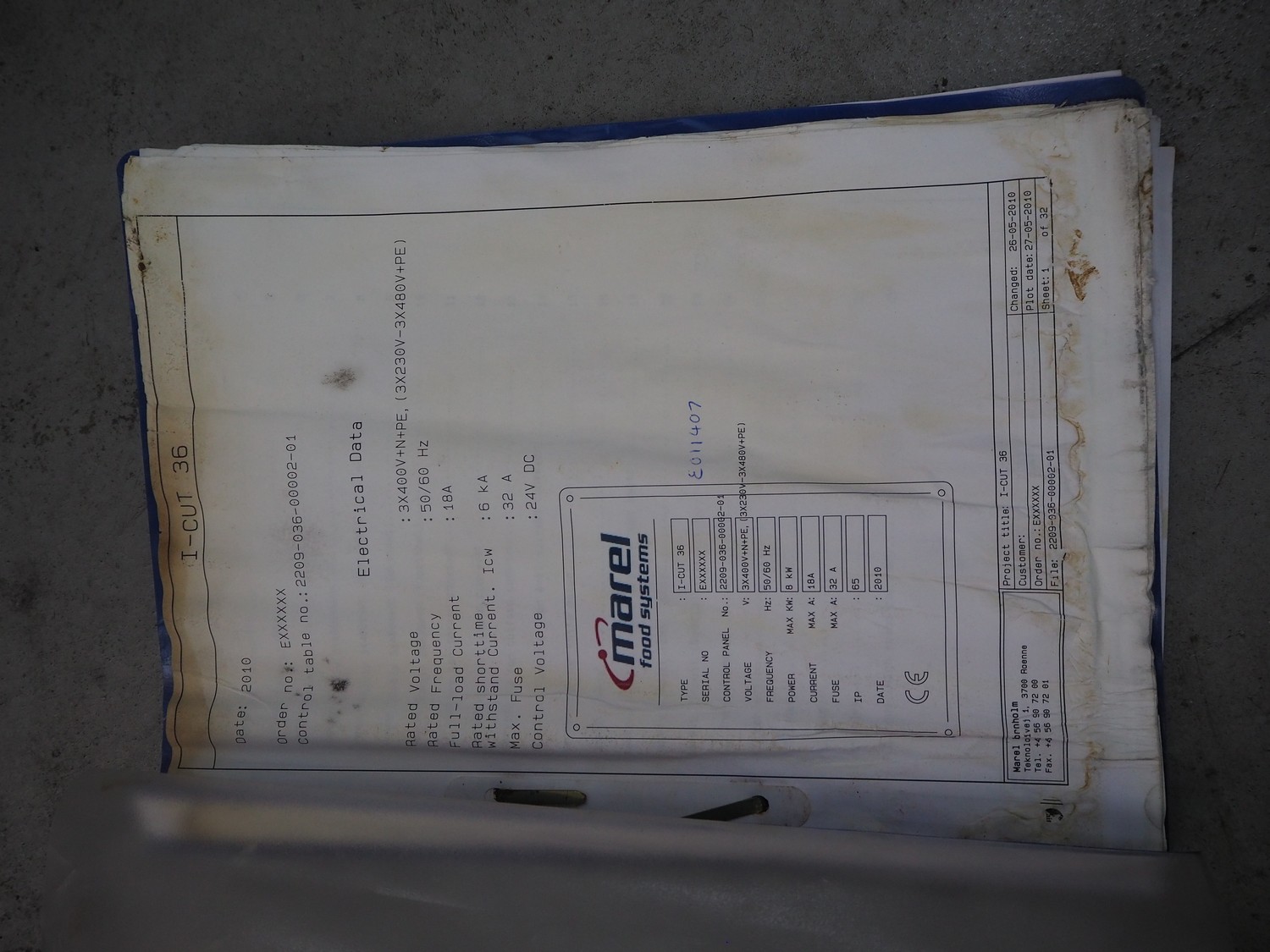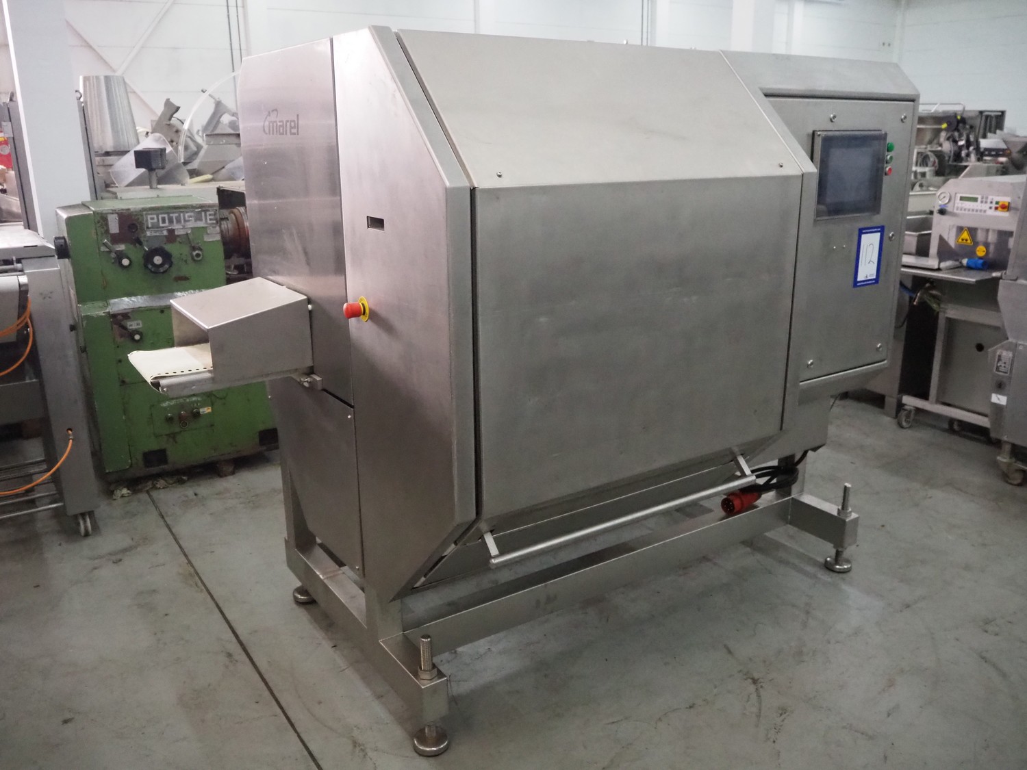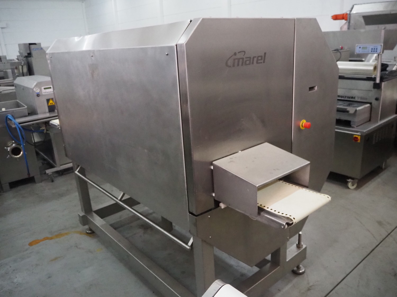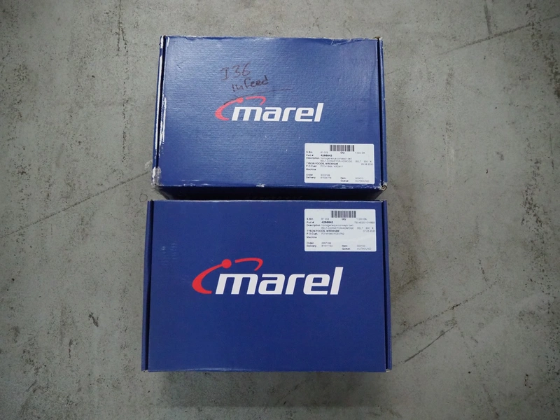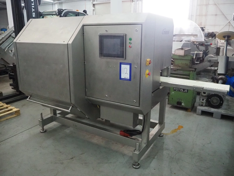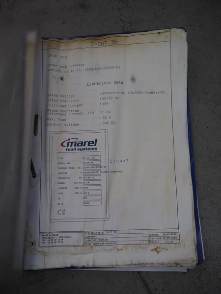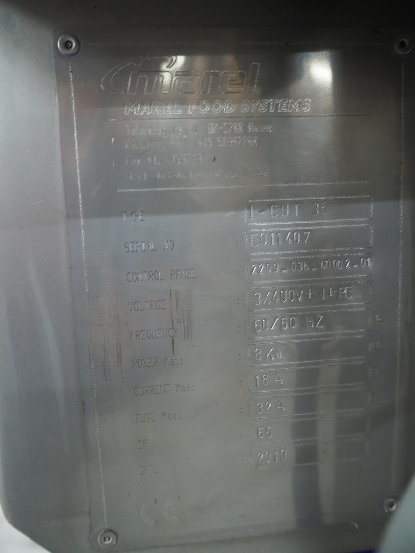 Marel portion cutter, type: I-CUT 36, serial number: E011407, year of construction: 2010, 400 V, 3 Ph, 50/60 Hz, 18 A, 8 kW, plastic belt, belt width: 300 mm, total dimensions: 3100 mm x 1300 mm x 1830 mm.