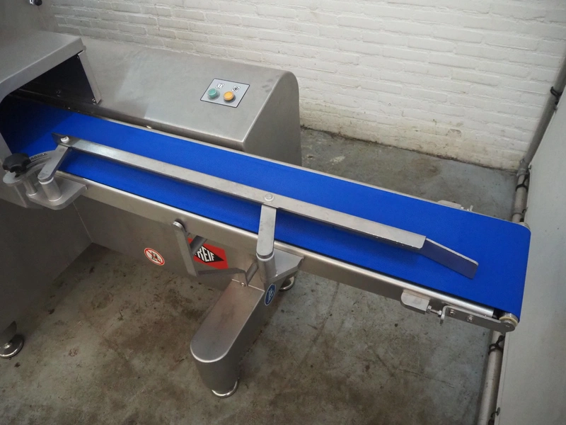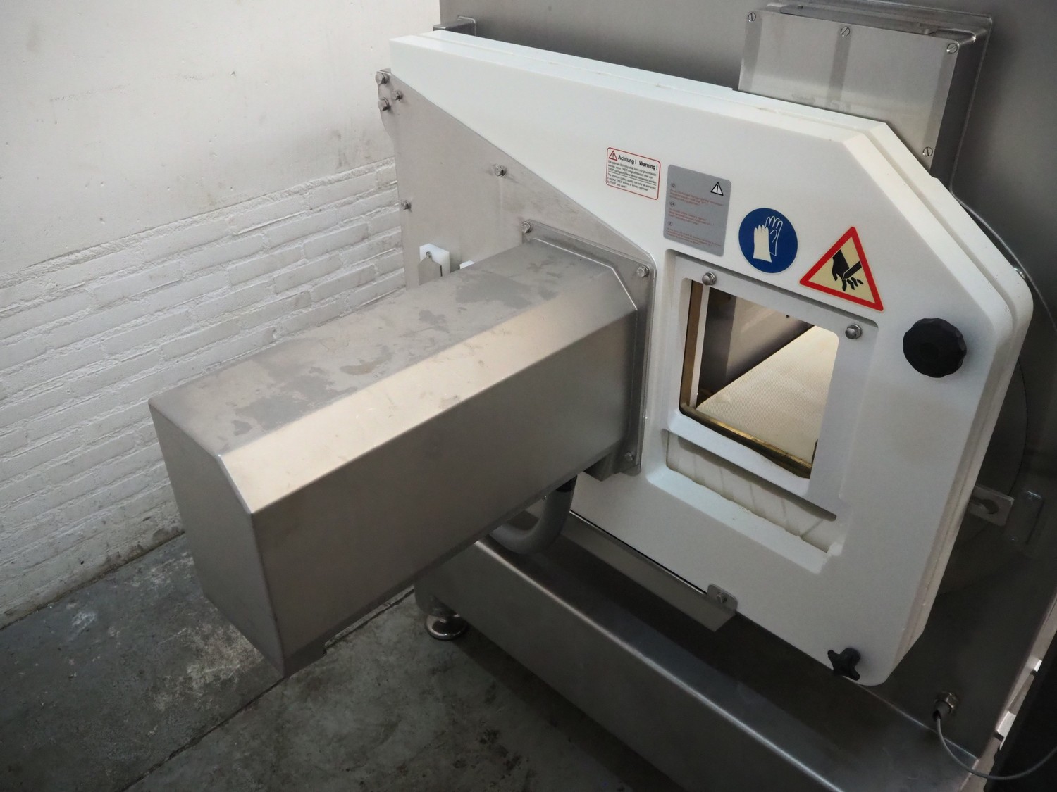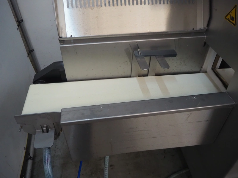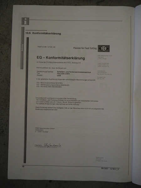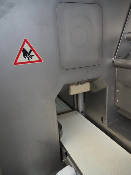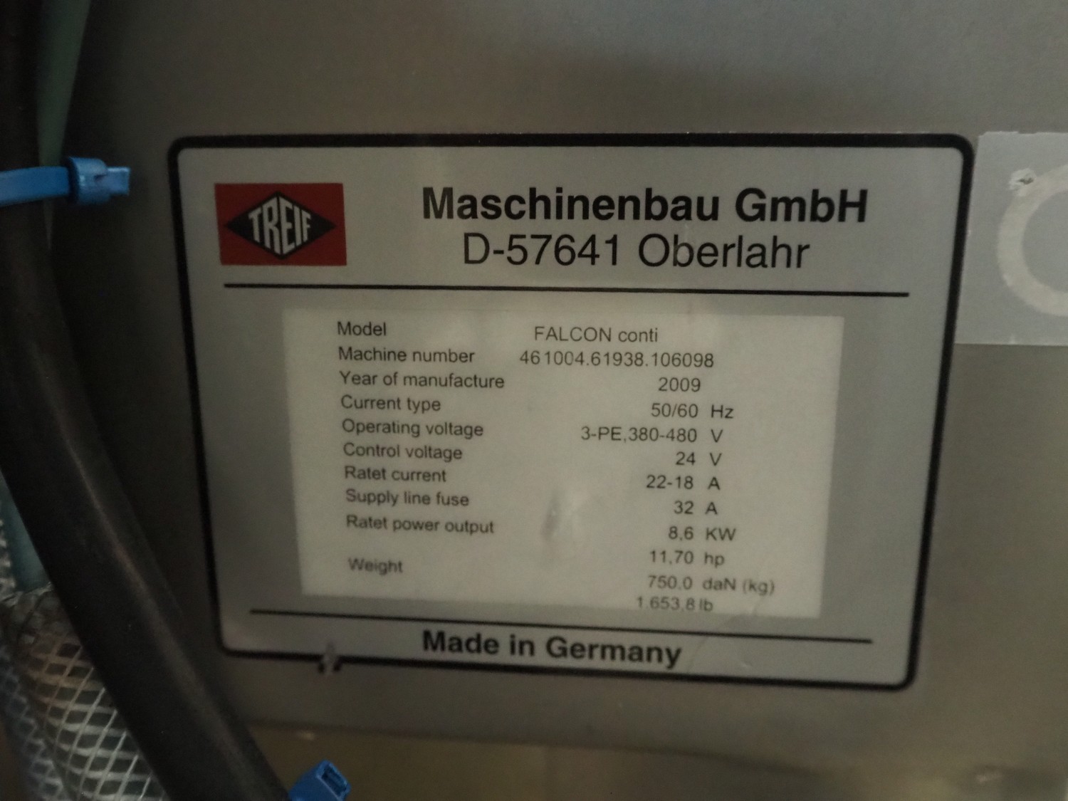 Treif Machinenbau GmbH portion slicer, model: FALCON conti, machine number: 461004.61938.106098, year of construction: 2009, 380-480 V, 3 Ph, 50/60 Hz, 22-18 A, 8.6 kW, weight: 750 kg, plastic belt, belt width: 222 mm, total dimensions: 2850 mm x 1300 mm x 1850 mm, 1650 mm x 830 mm x 1450 mm.