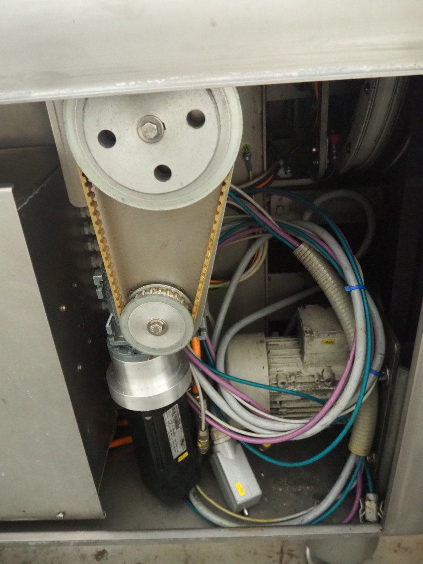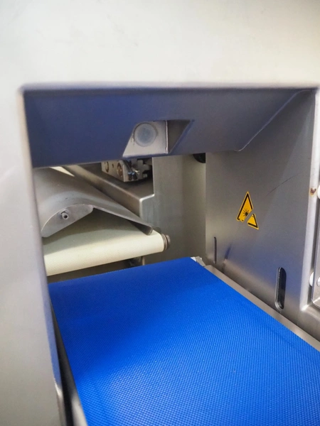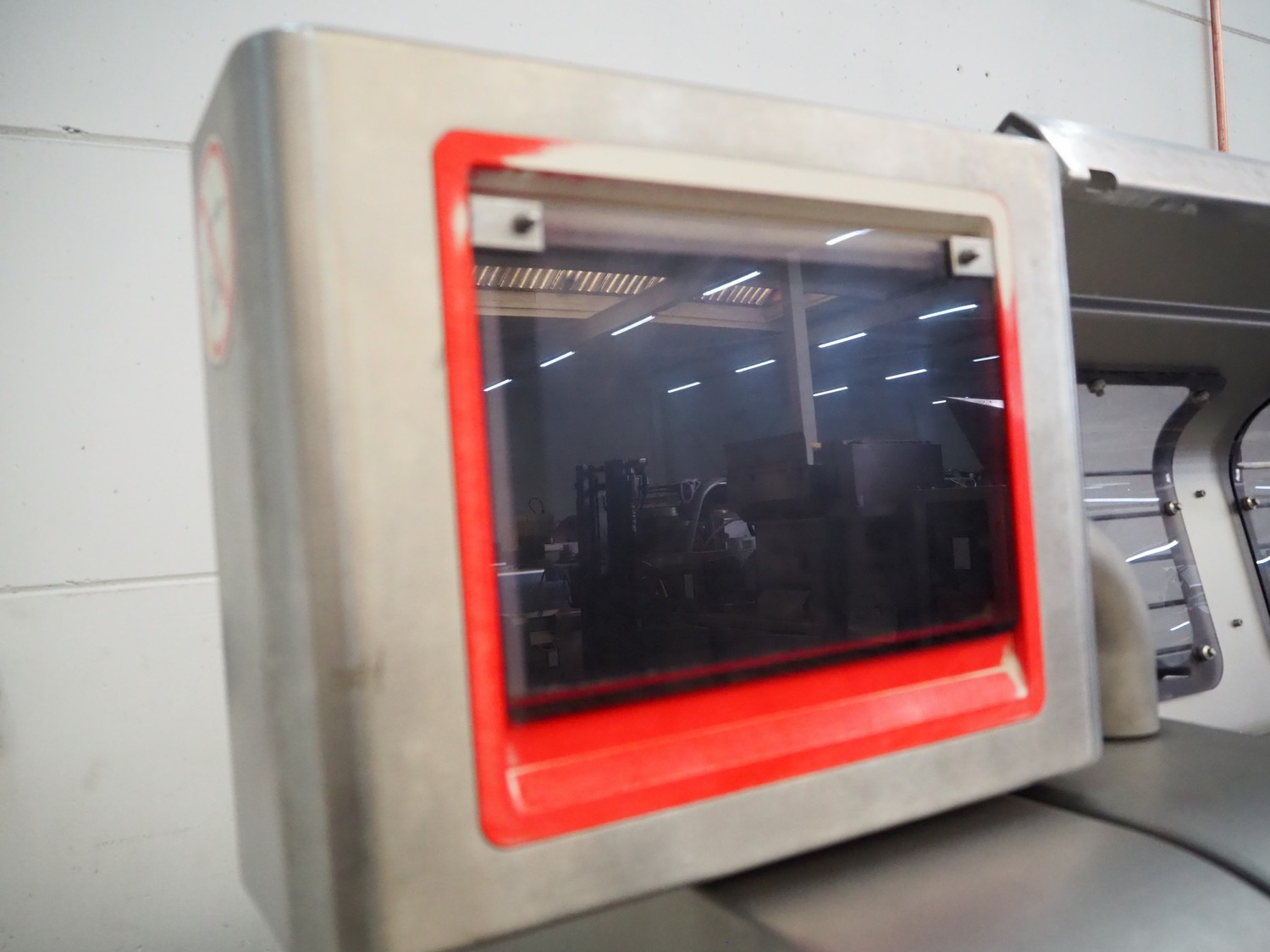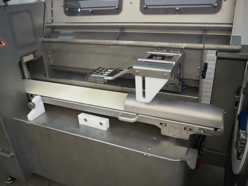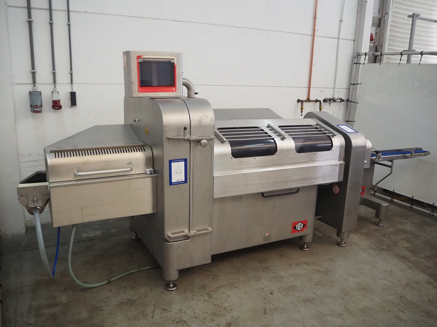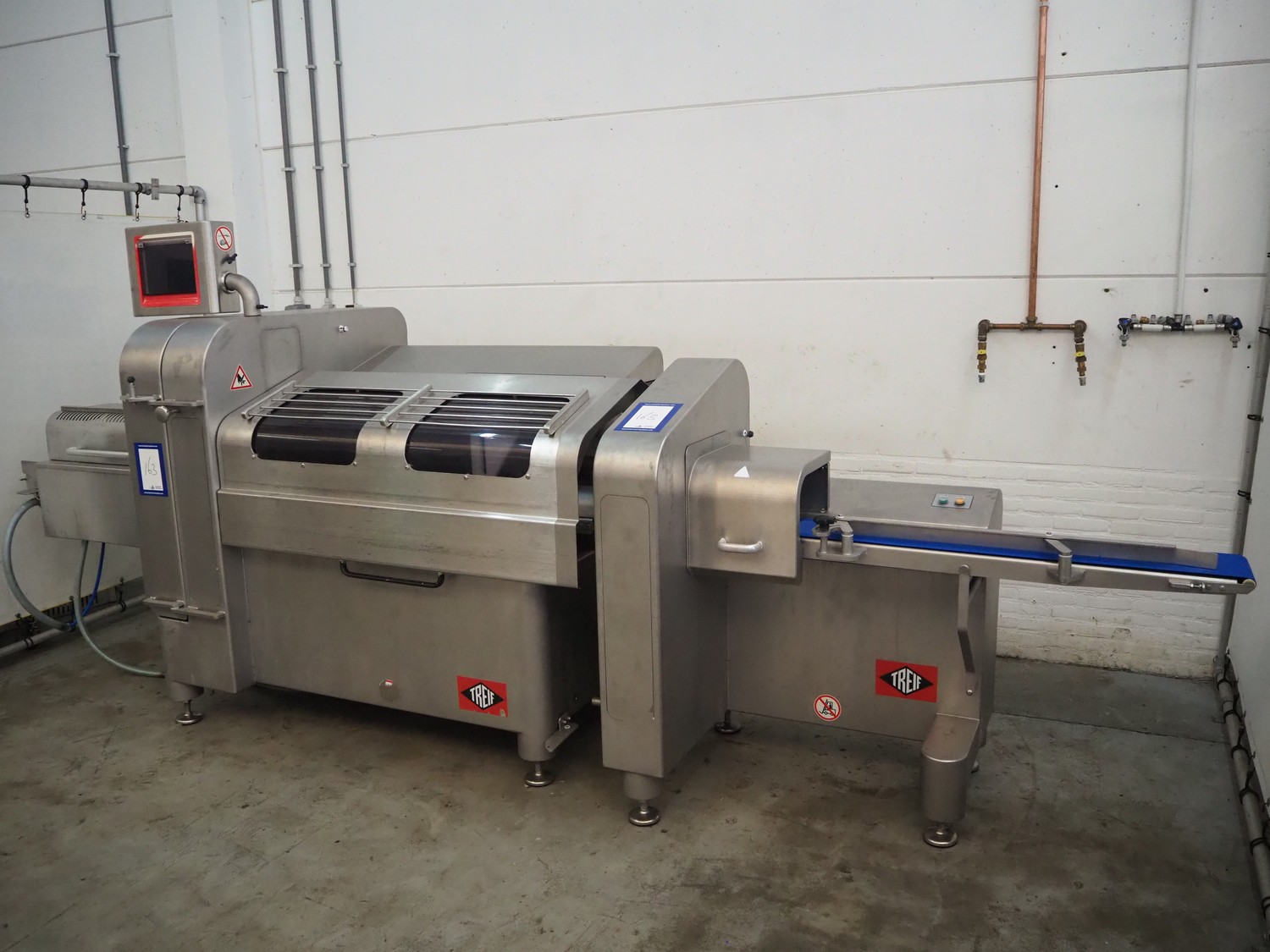 Treif Machinenbau GmbH portion slicer, model: FALCON conti, machine number: 461004.61938.106098, year of construction: 2009, 380-480 V, 3 Ph, 50/60 Hz, 22-18 A, 8.6 kW, weight: 750 kg, plastic belt, belt width: 222 mm, total dimensions: 2850 mm x 1300 mm x 1850 mm, 1650 mm x 830 mm x 1450 mm.
