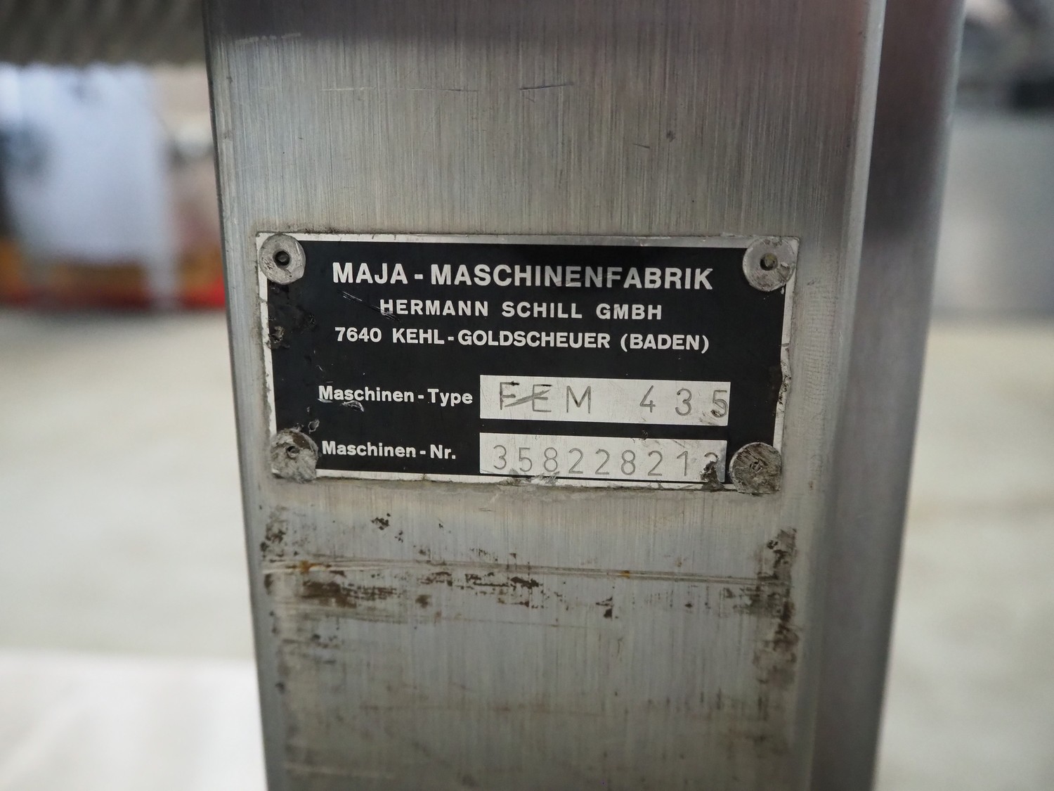 Maja-Maschinenfabrik mobile skinning machine, type: FEM 435, machine number: 358228212, working width: 430 mm, total dimensions: 680 mm x 570 mm x 900 mm.