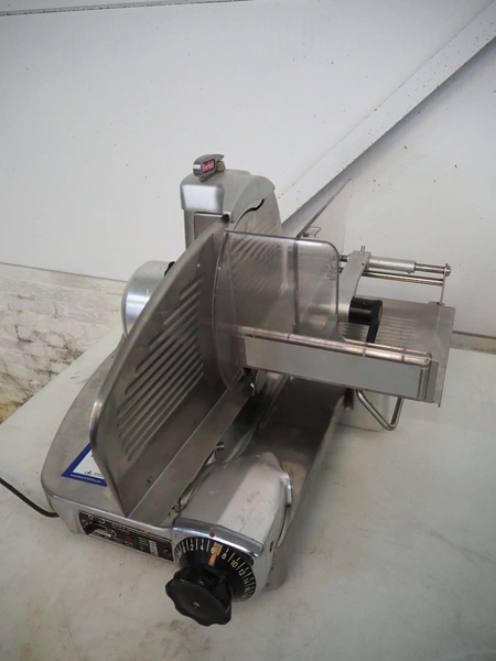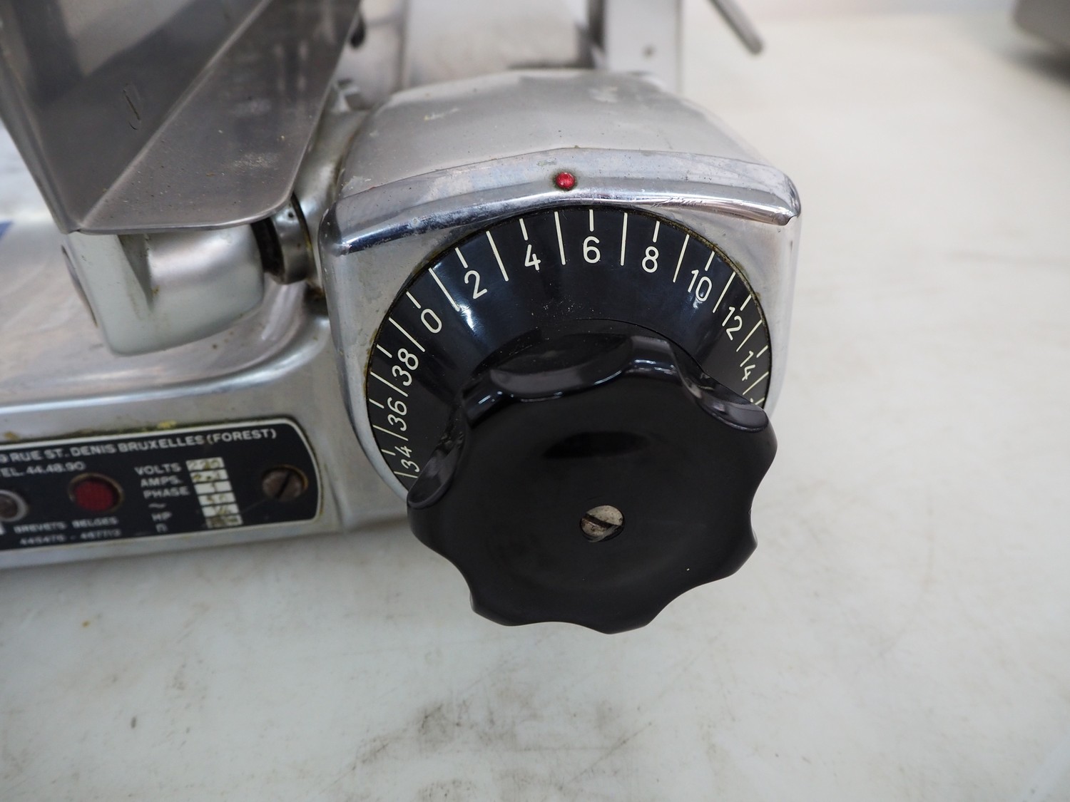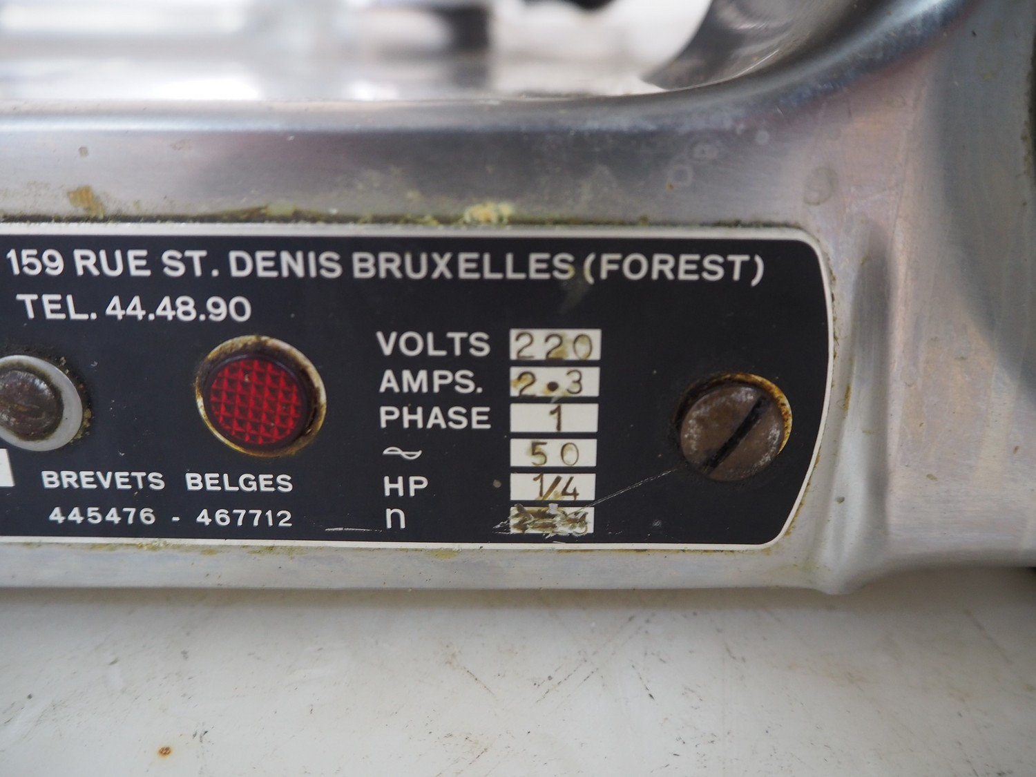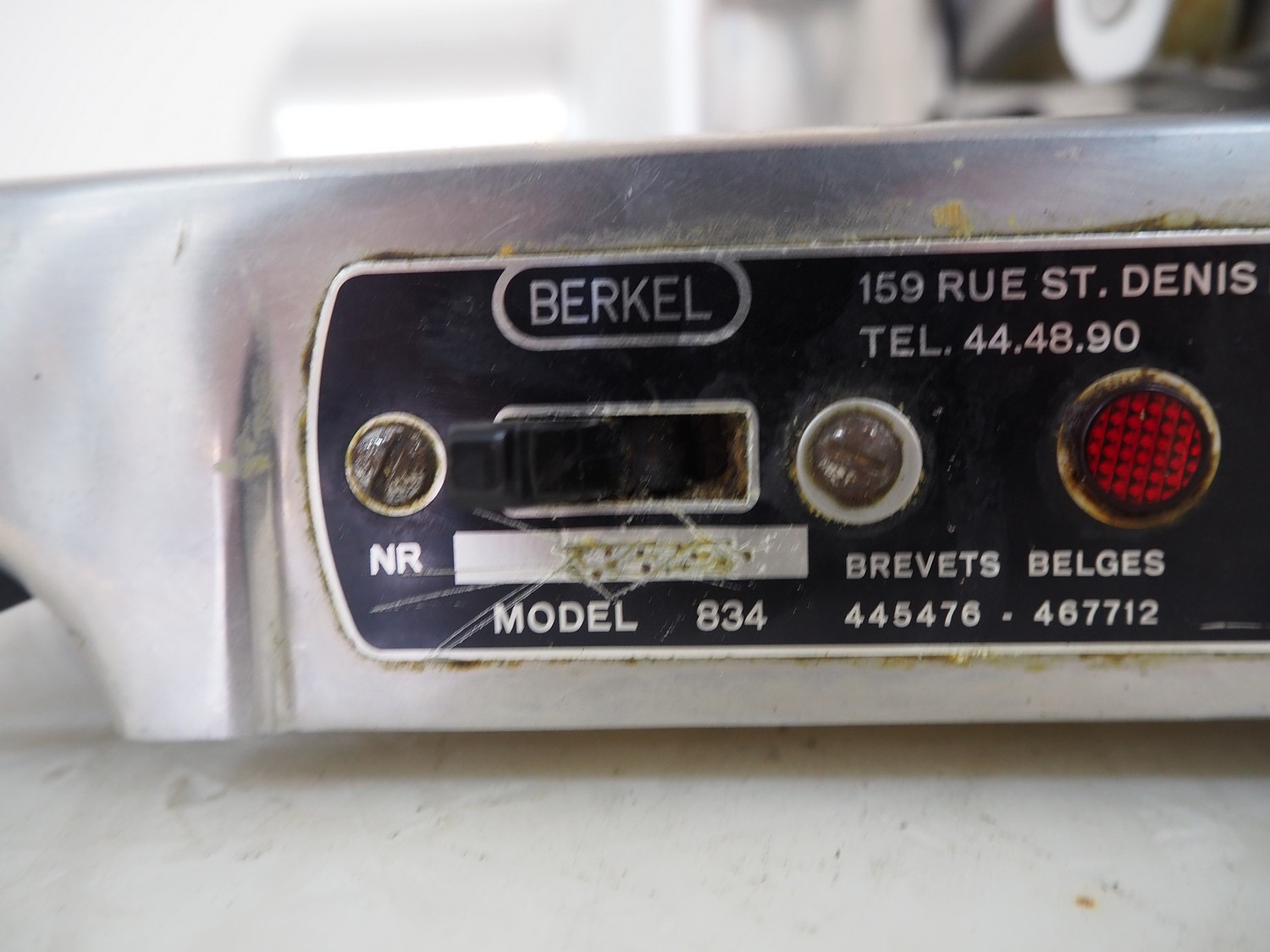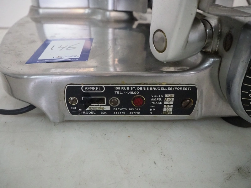 Berkel slicer, model: 834, 220 V, 1 Ph, 50 Hz, 2.3 A, dimensions: 600 mm x 600 mm x 450 mm.