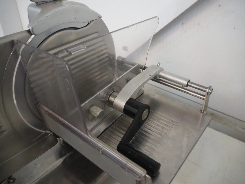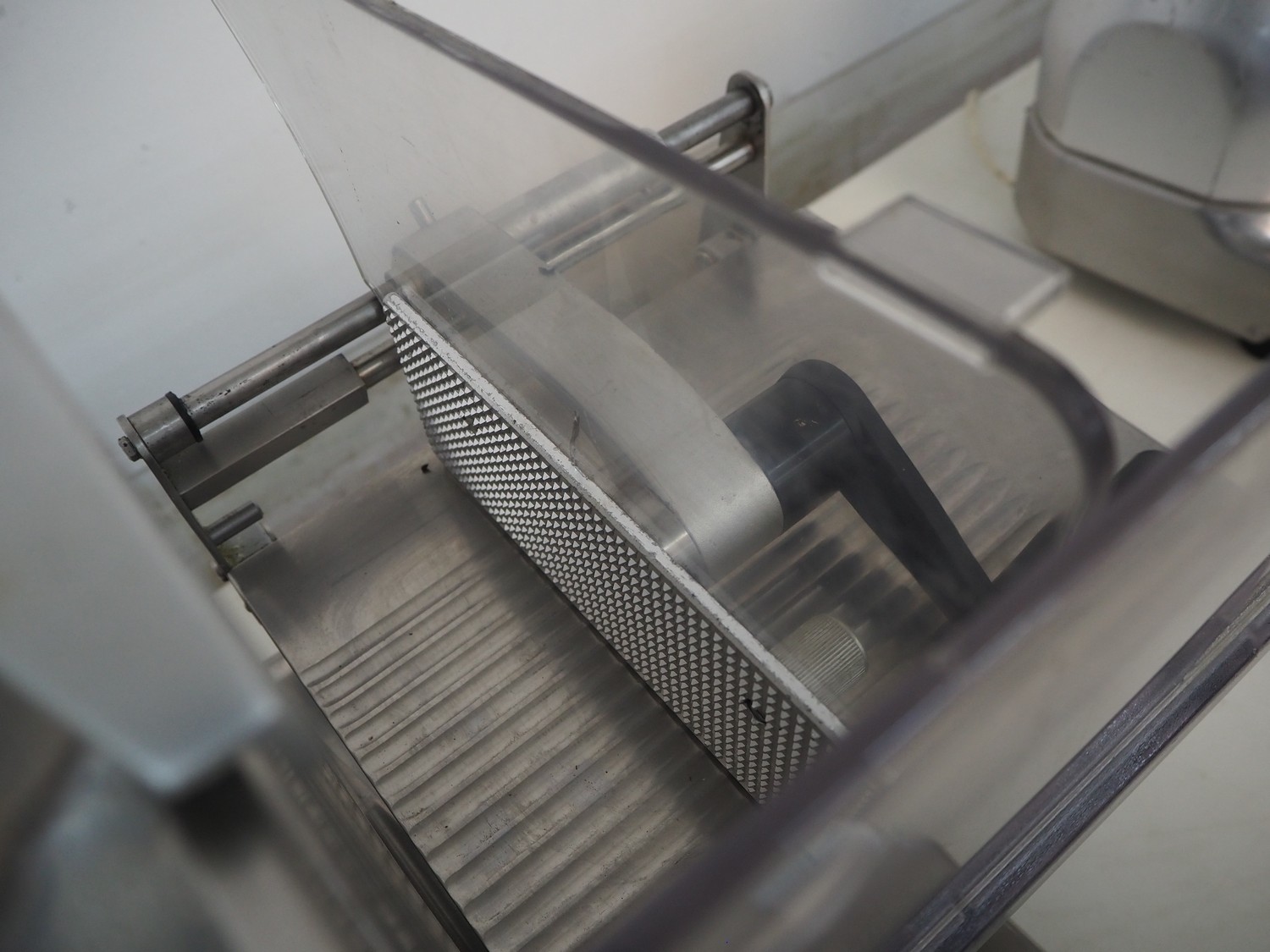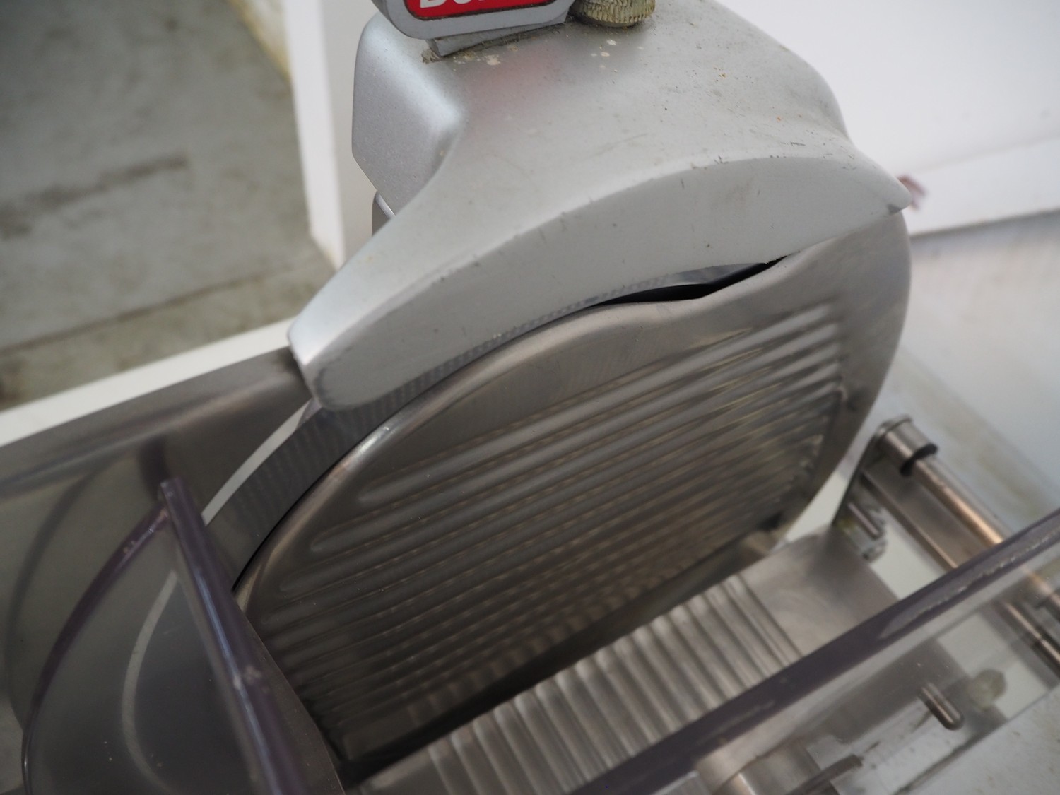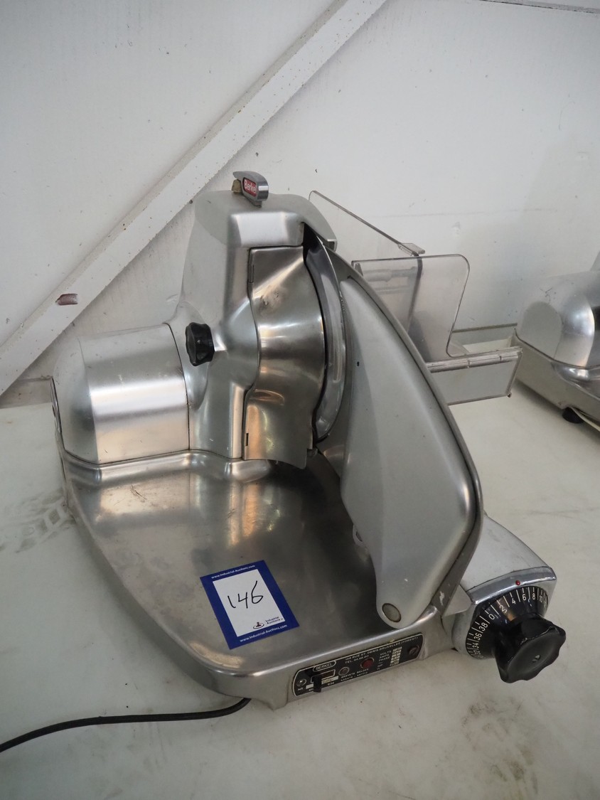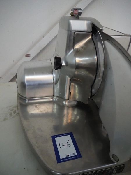 Berkel slicer, model: 834, 220 V, 1 Ph, 50 Hz, 2.3 A, dimensions: 600 mm x 600 mm x 450 mm.