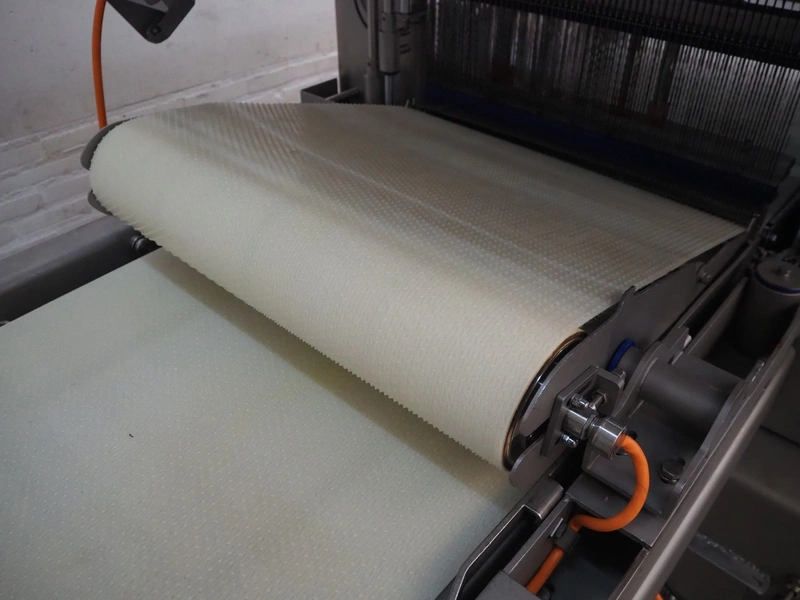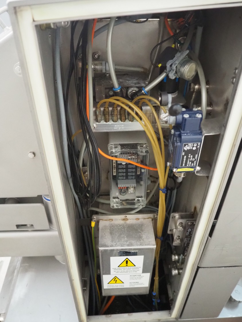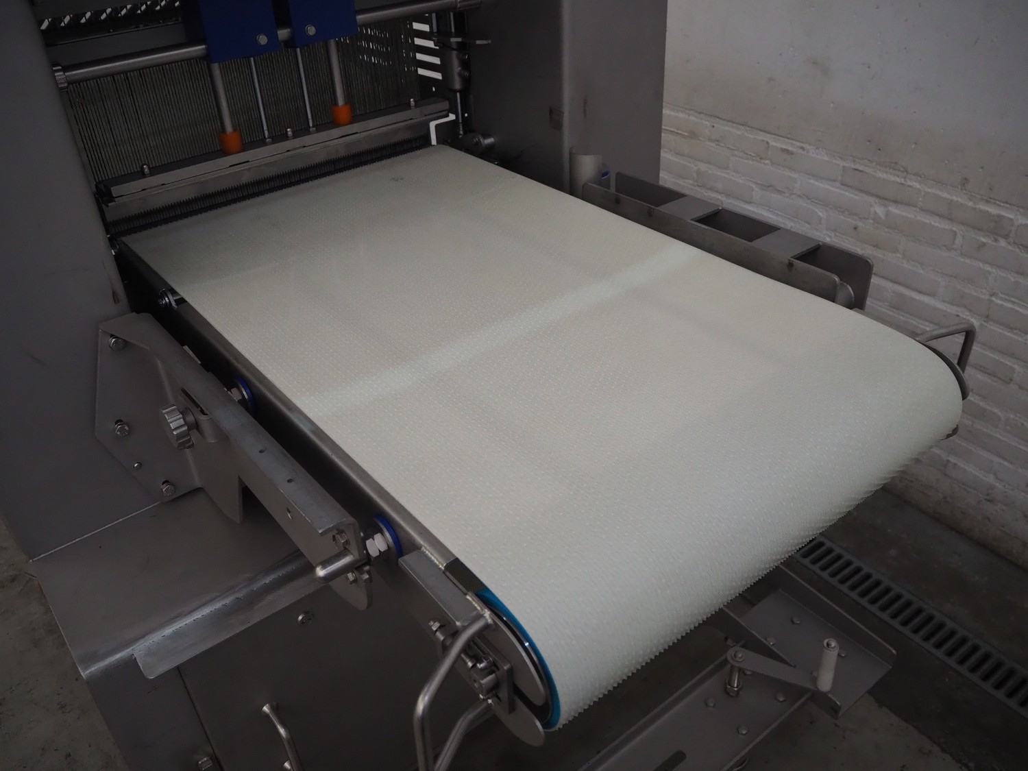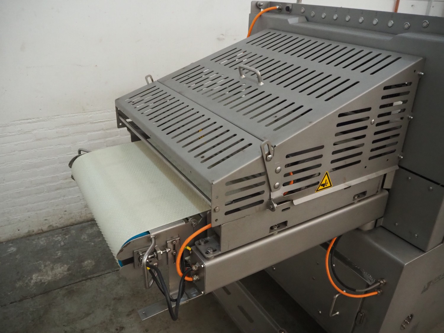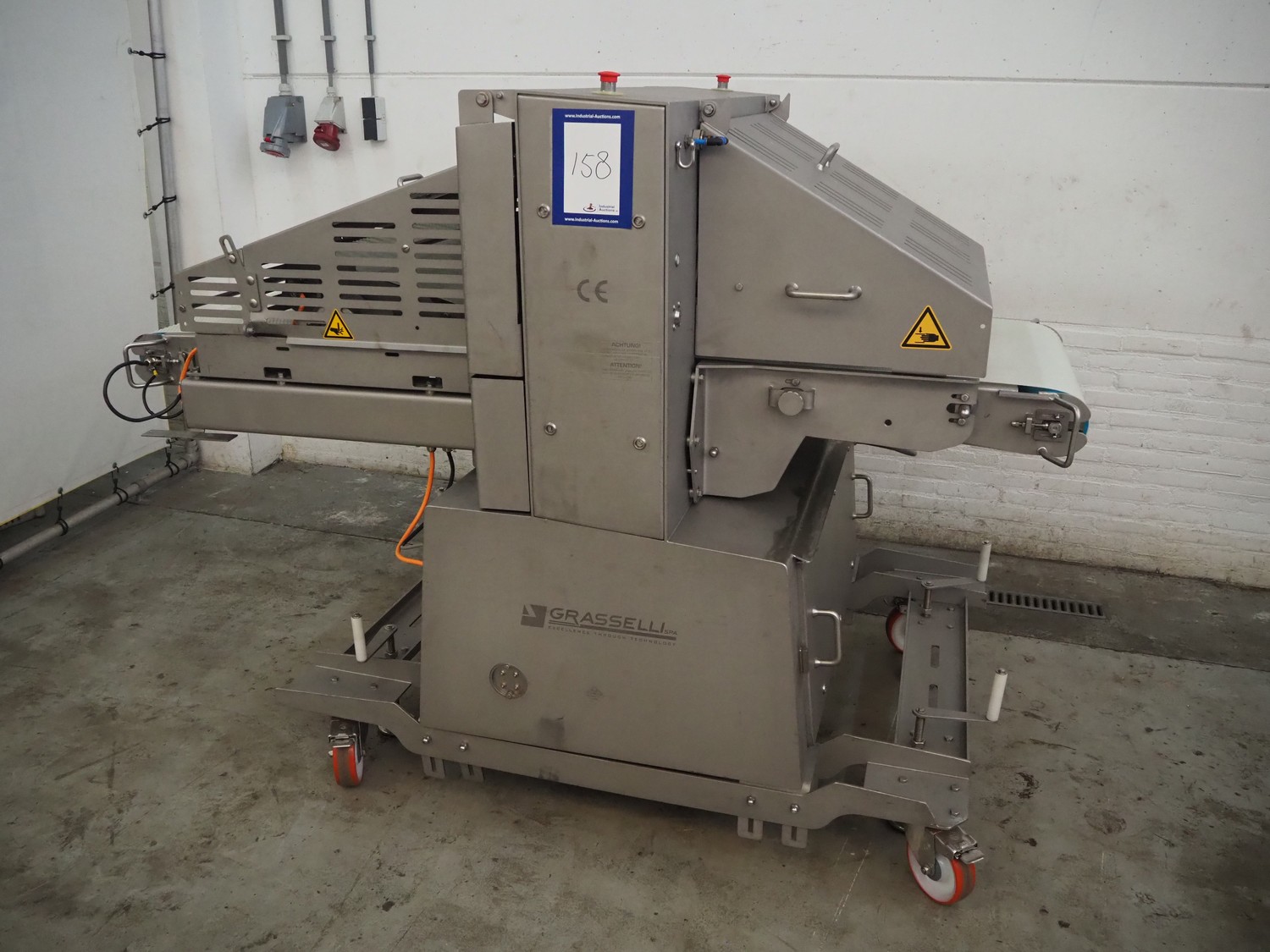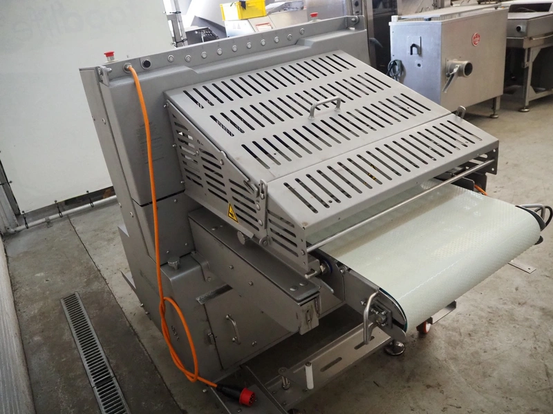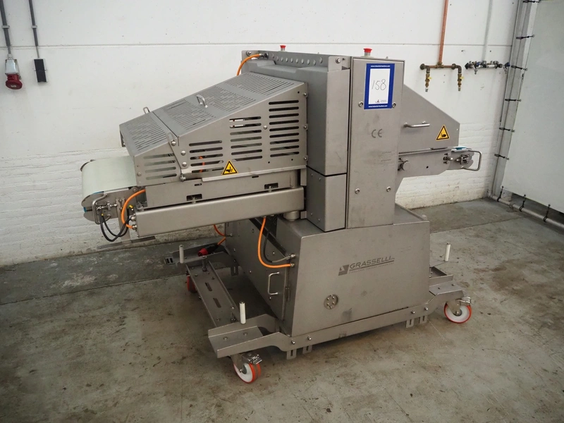 Grasselli S.p.A. mobile slicer, model: NSA600, serial number: S23R03/1043, year of construction: 2012, 400 V, 3 Ph, 50 Hz, 9.4 A, 4 kW, plastic belt, belt width: 600 mm, distance between knives: 5 mm, total dimensions: 2200 mm x 1300 mm x 1600 mm.