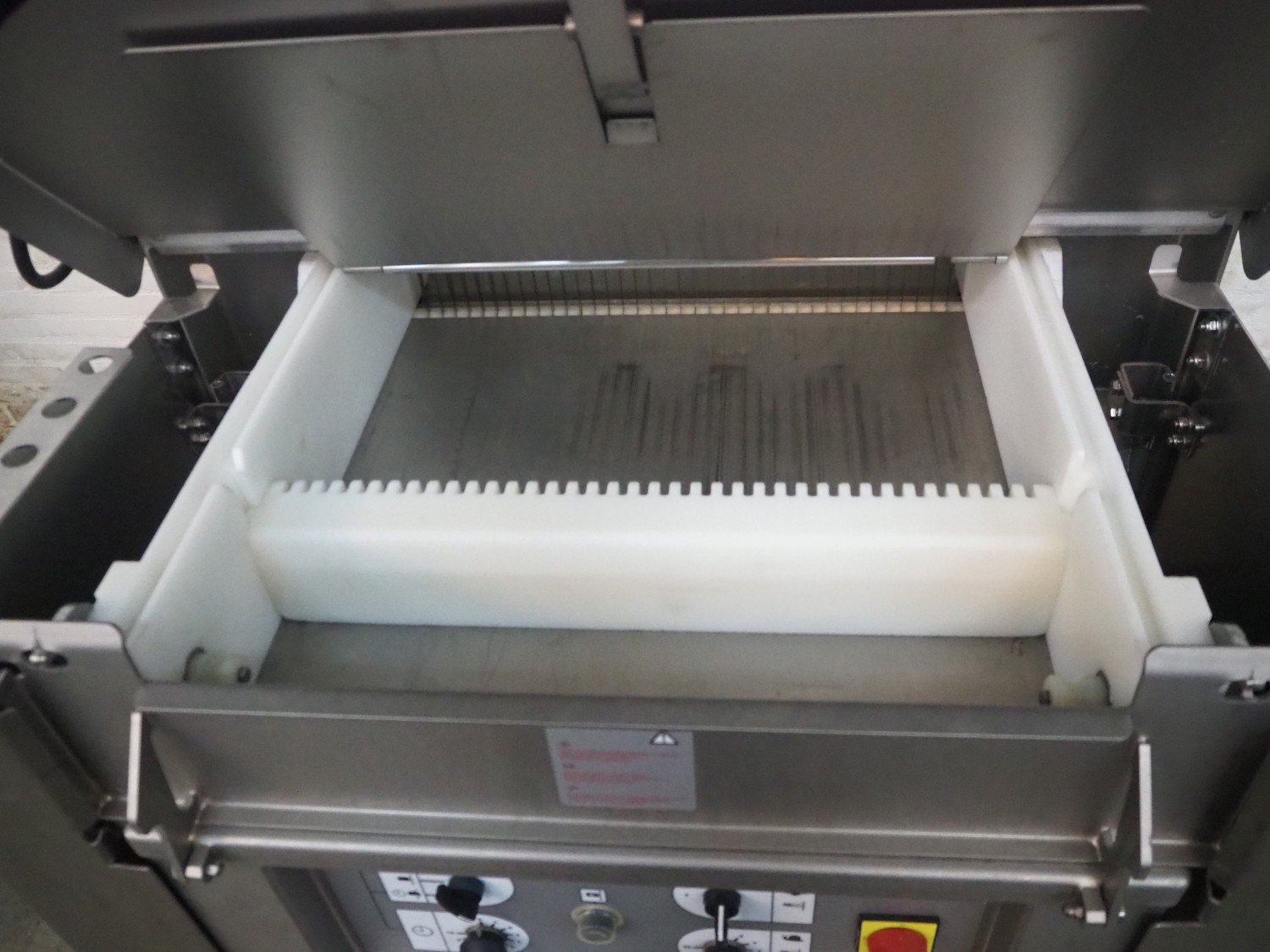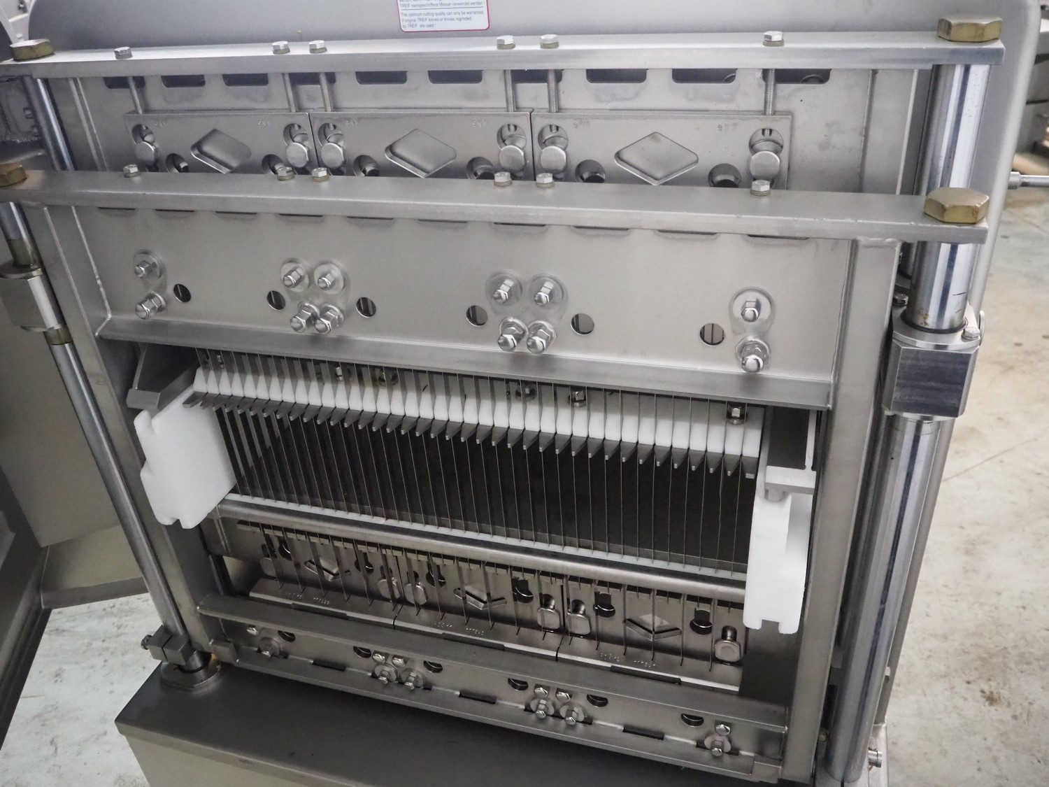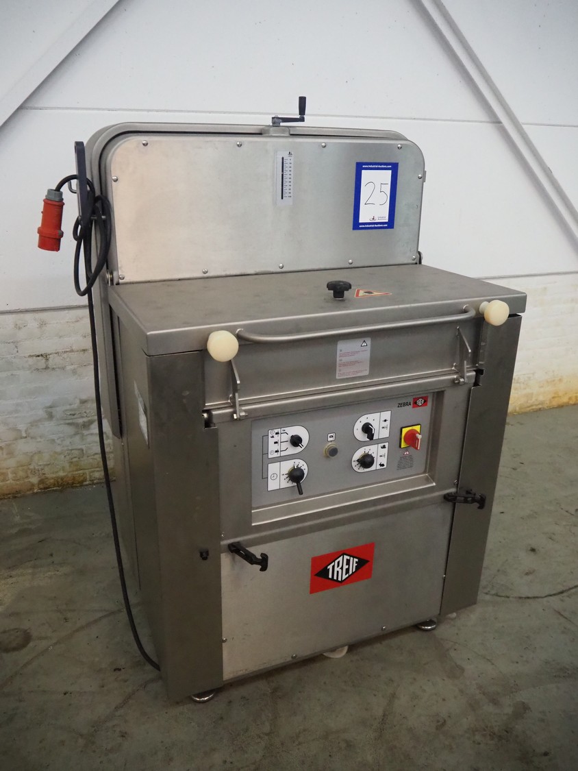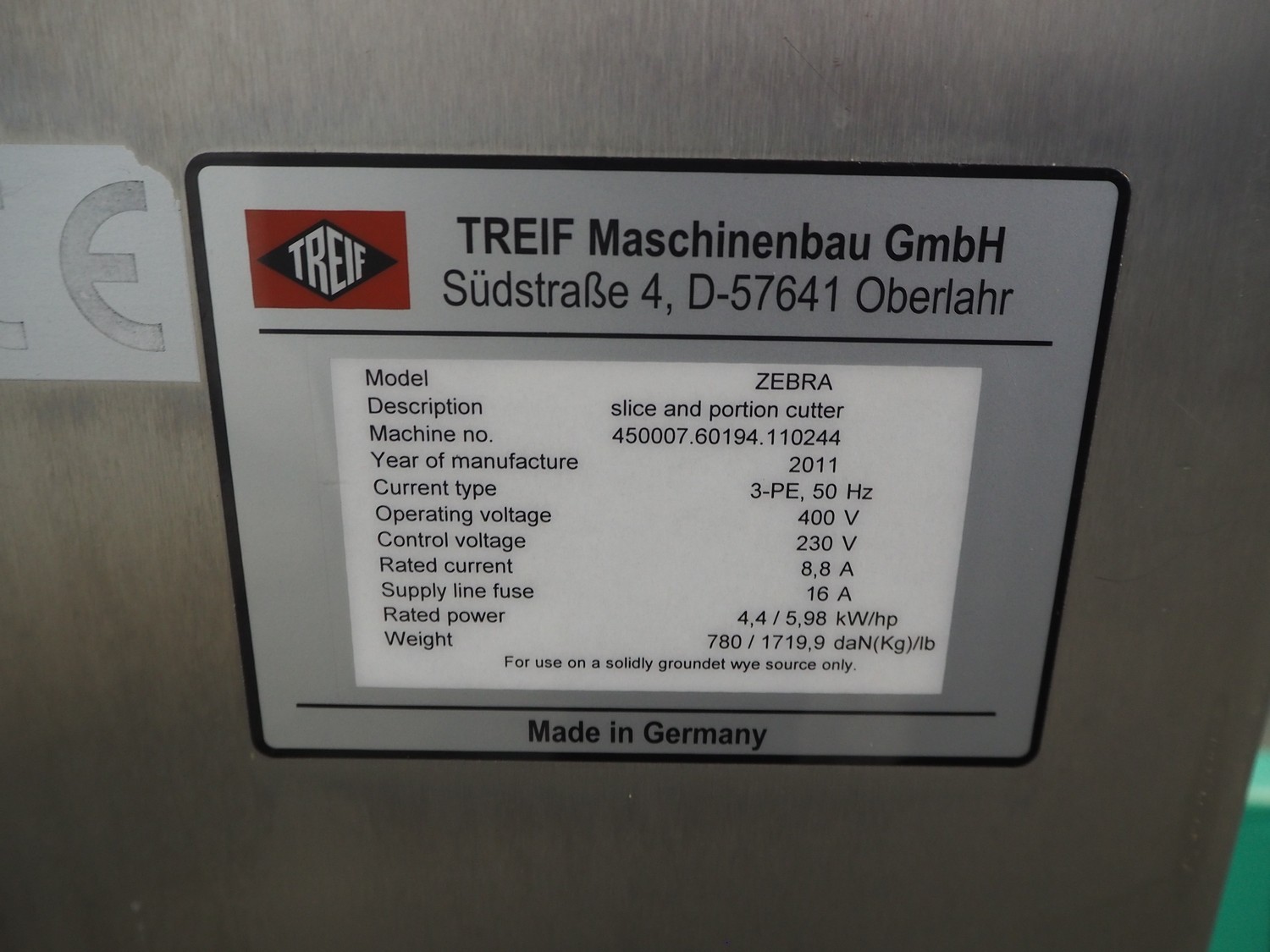 Treif Maschinenbau GmbH mobile slice and portion cutter, model: ZEBRA, machine number: 450007.60194.110244, year of construction: 2011, 230/400 V, 3 Ph, 50 Hz, 8.8 A, 4.4/5.98 kW, weight: 790 kg, 38 knives, distance between knives: 16 mm, total dimensions: 1250 mm x 1000 mm x 1600 mm.