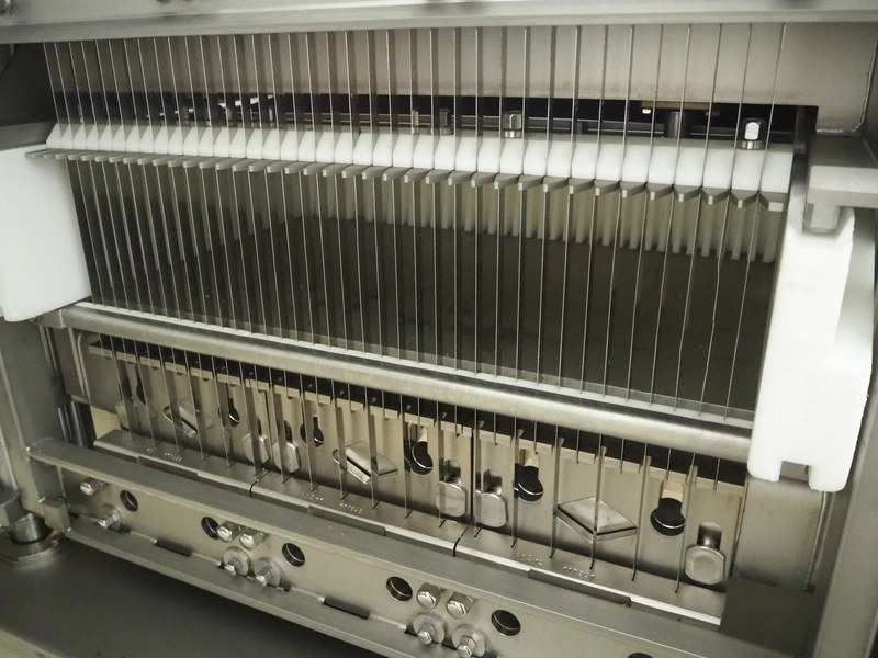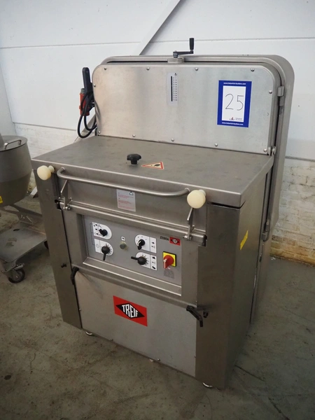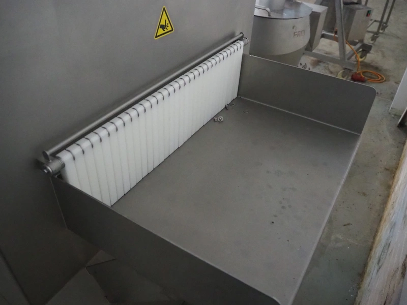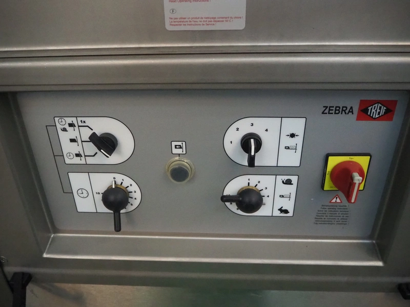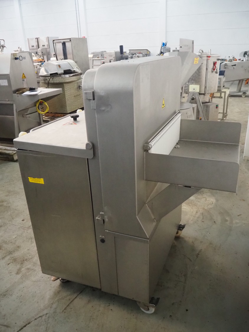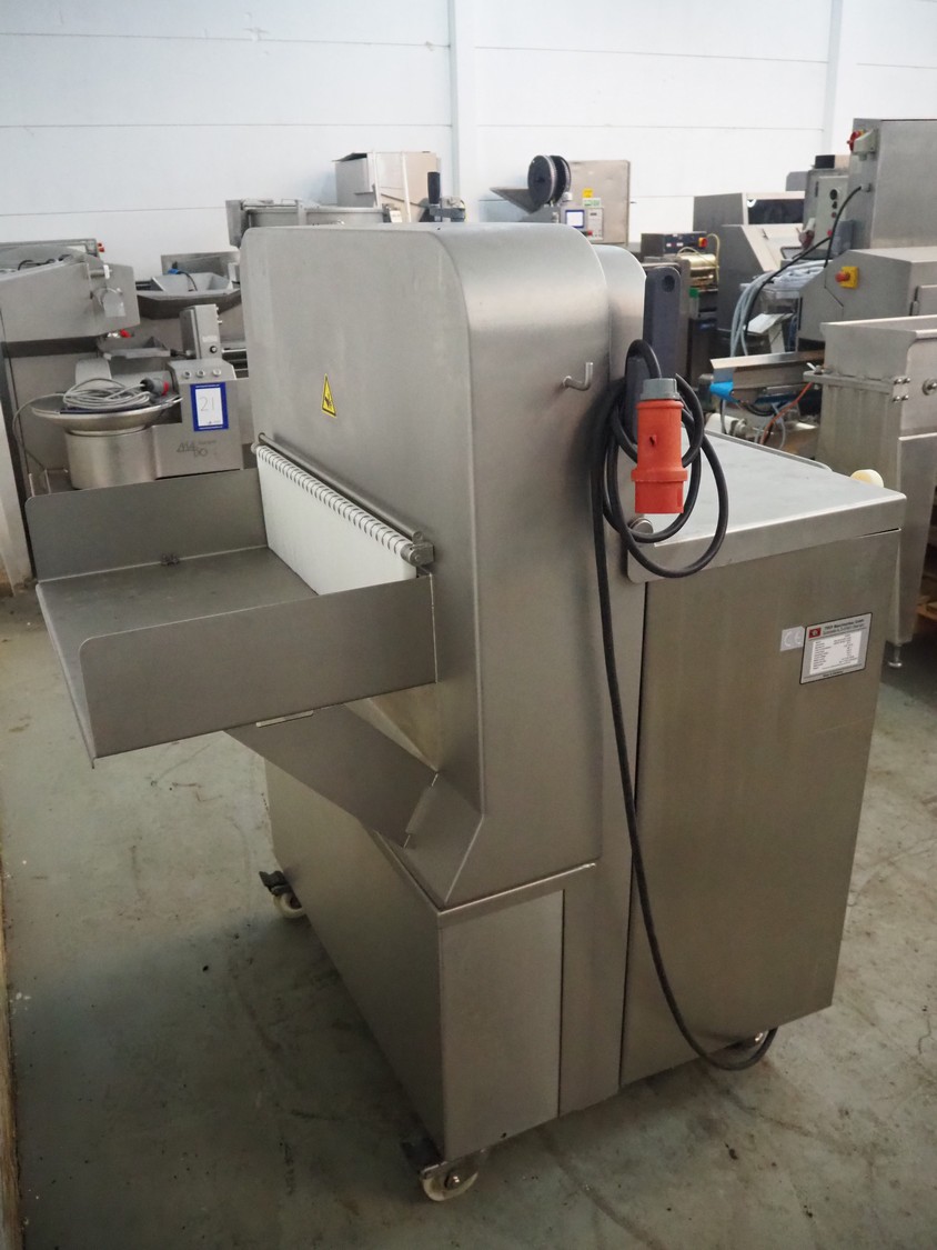 Treif Maschinenbau GmbH mobile slice and portion cutter, model: ZEBRA, machine number: 450007.60194.110244, year of construction: 2011, 230/400 V, 3 Ph, 50 Hz, 8.8 A, 4.4/5.98 kW, weight: 790 kg, 38 knives, distance between knives: 16 mm, total dimensions: 1250 mm x 1000 mm x 1600 mm.