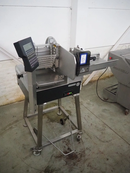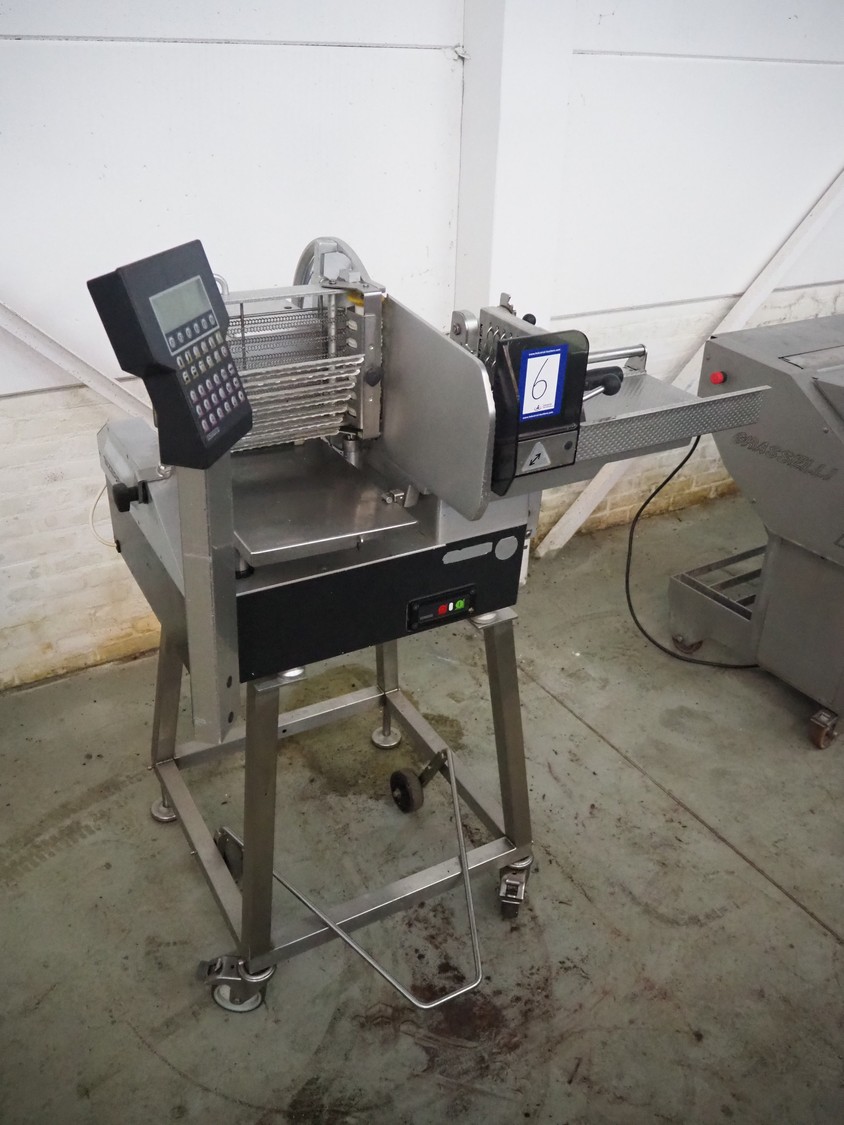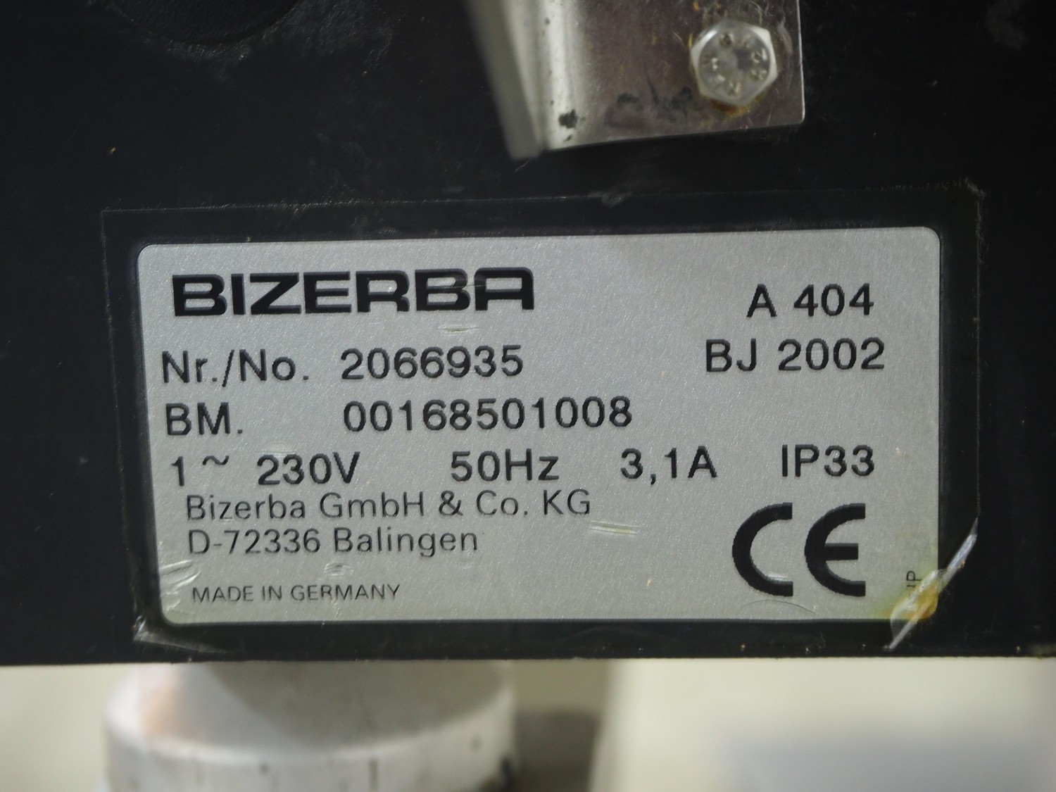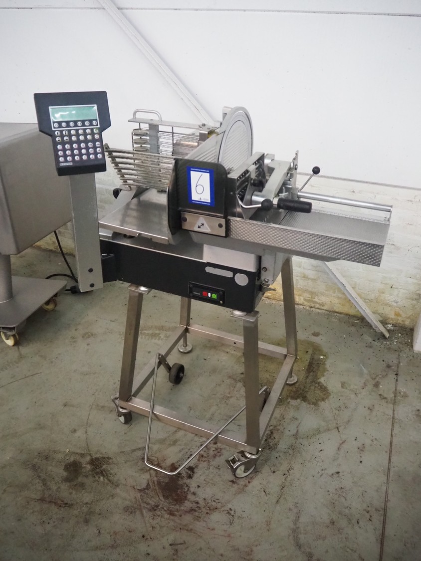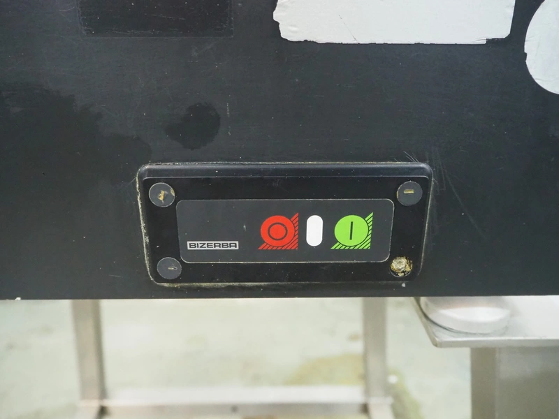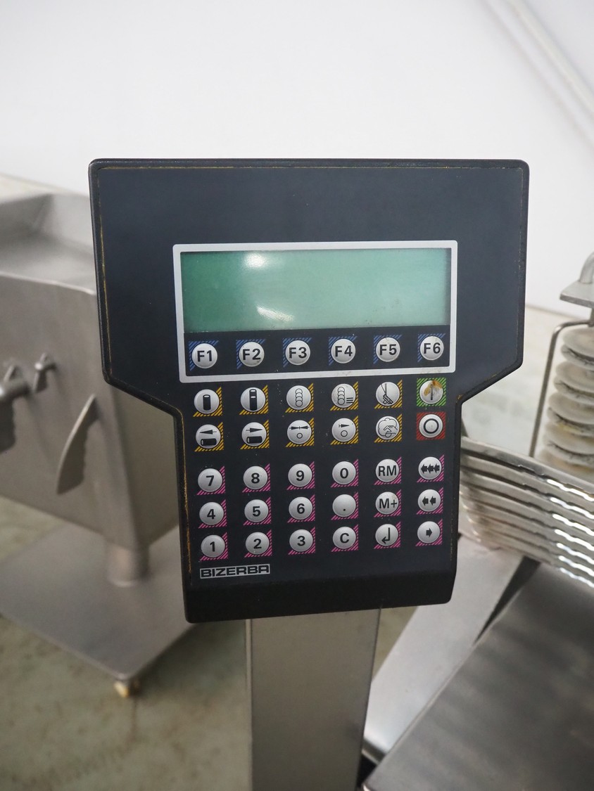 Bizerba automatic slicer, type: A 404, number: 2066935, year of construction: 2002, 230 V, 1 Ph, 50 Hz, 3.1 A, dimensions: 1000 mm x 800 mm x 1370 mm.
