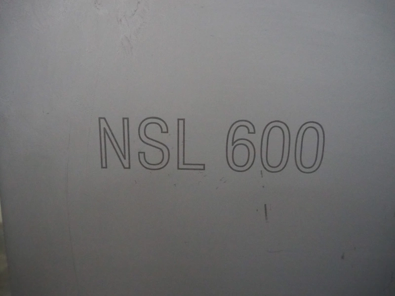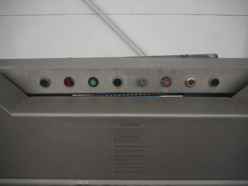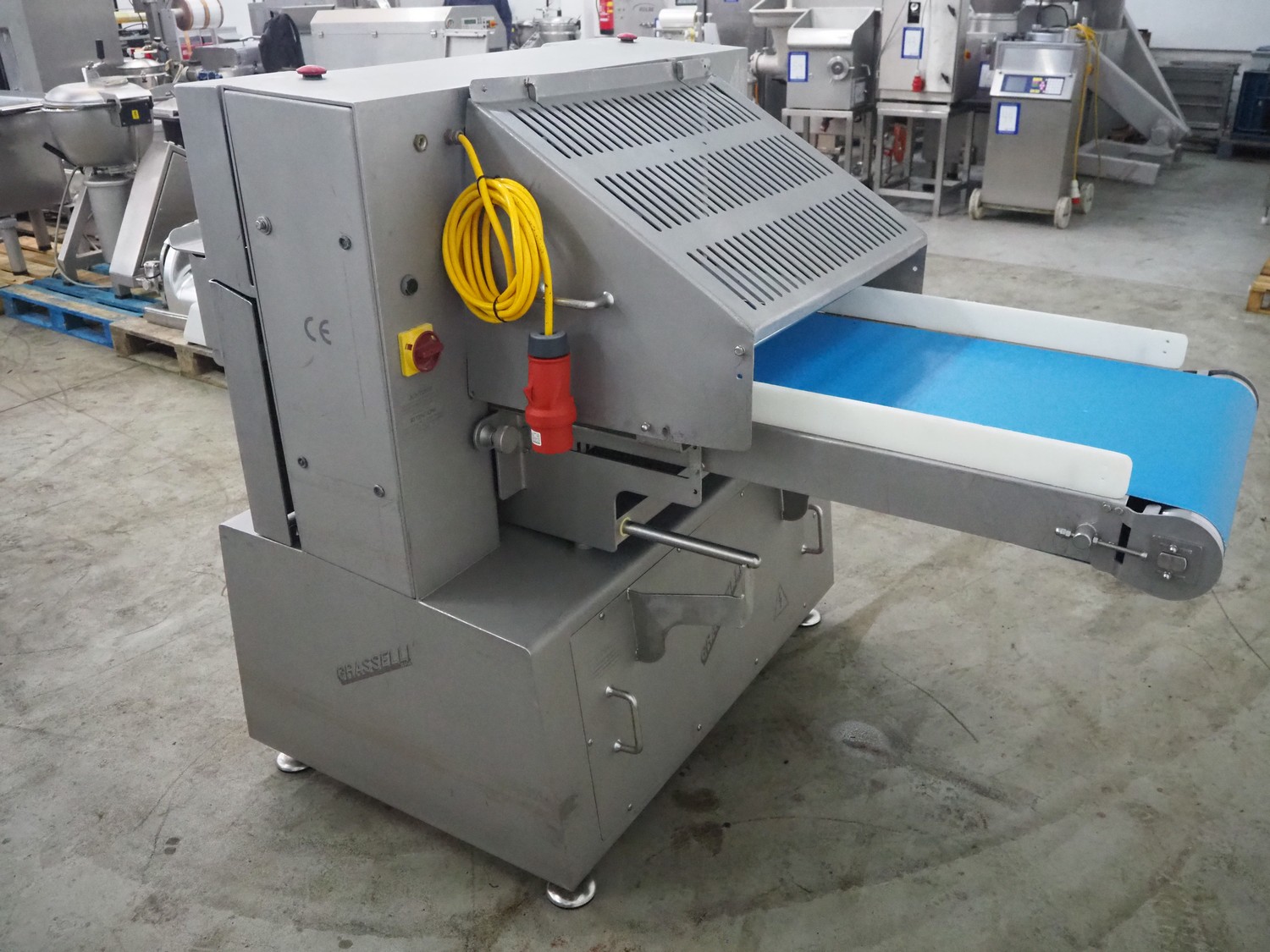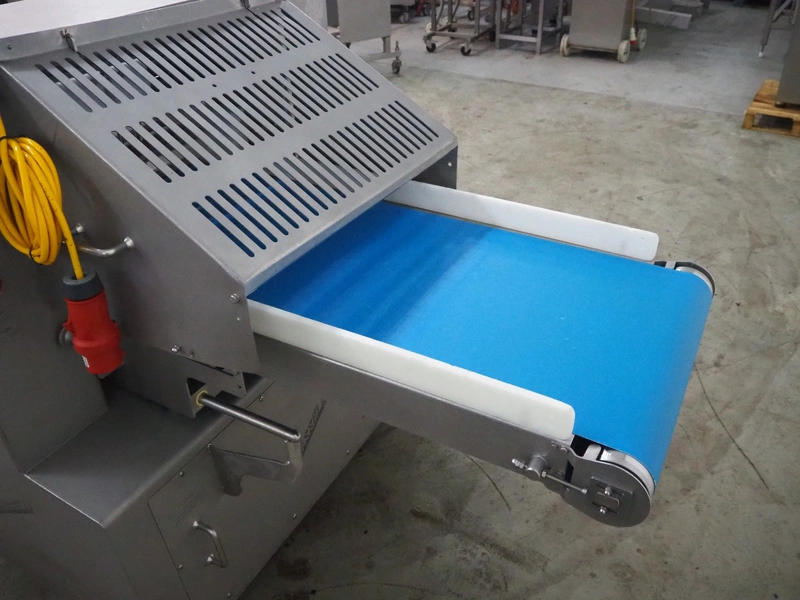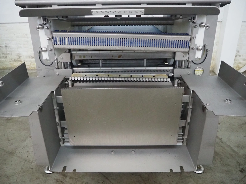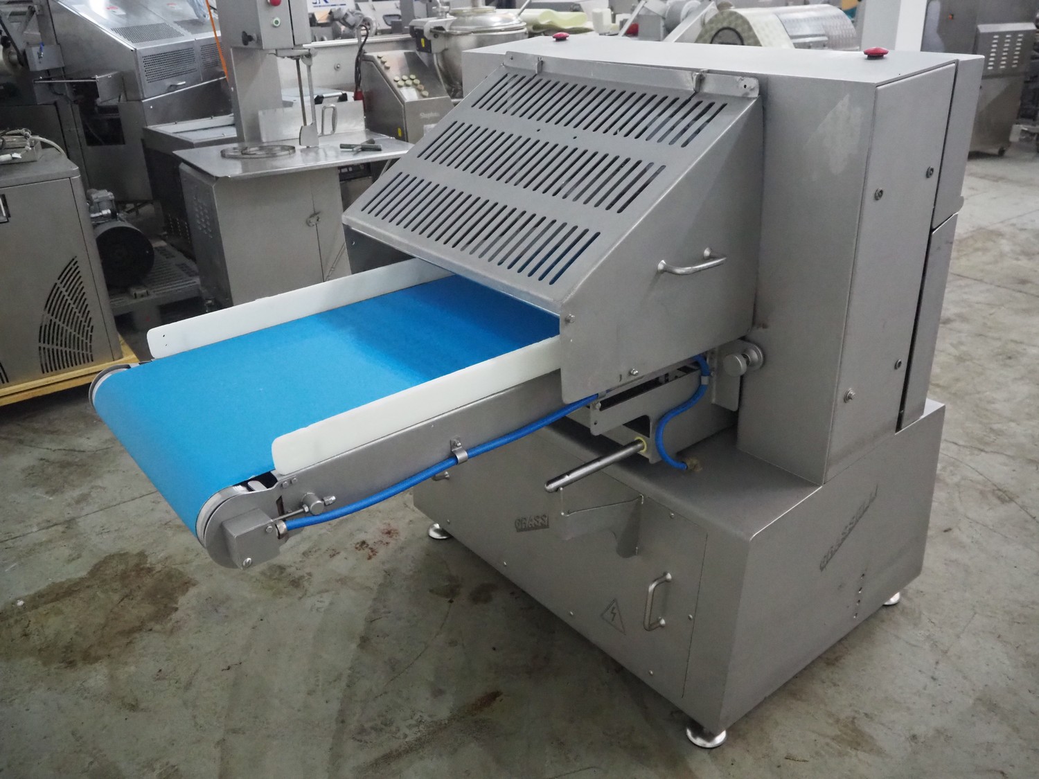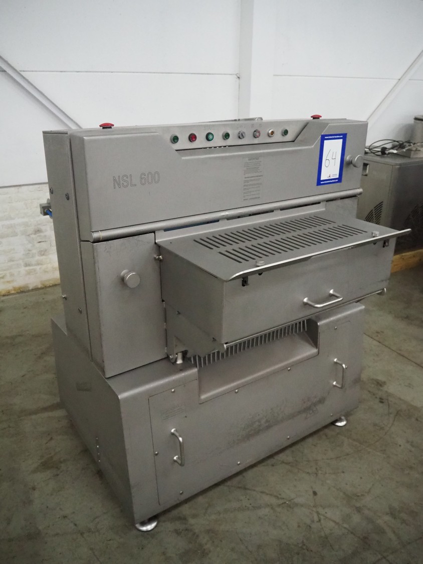 Grasselli slicer, type: NSL 600, number: T10016/457, plastic belt, belt width: 560 mm, distance between knives: 20 mm, total dimensions: 2000 mm x 1200 mm x 1500 mm.