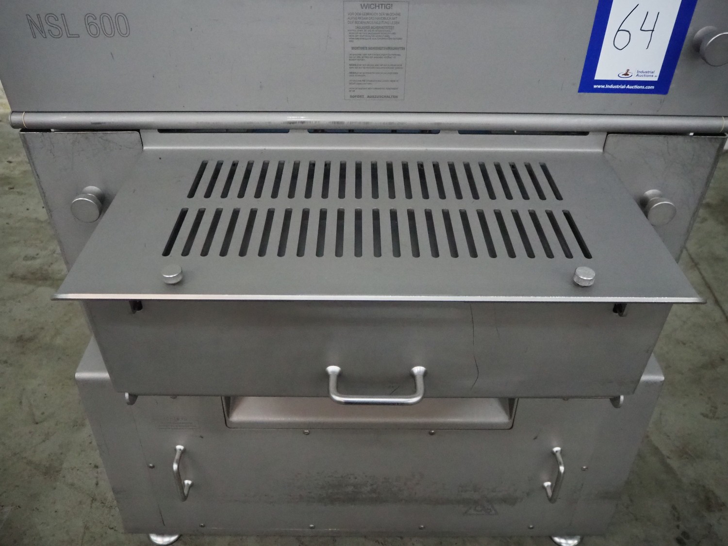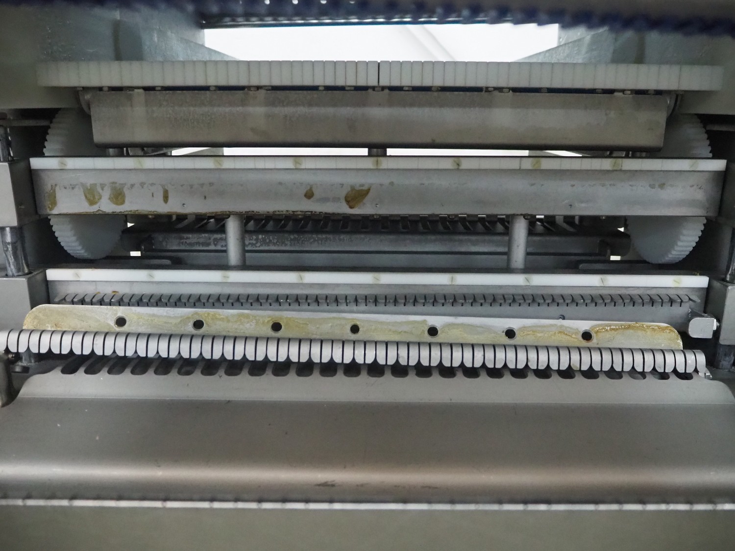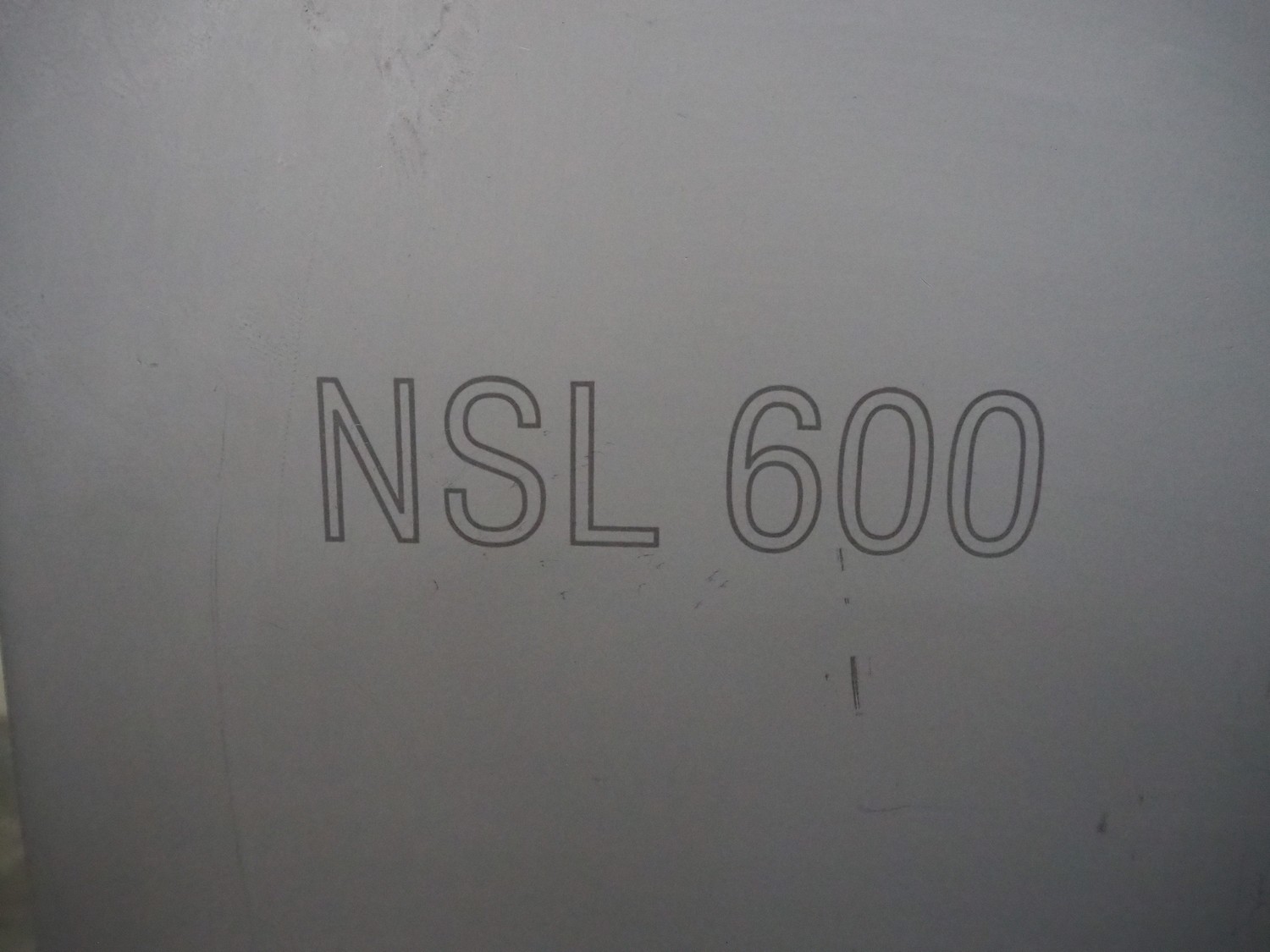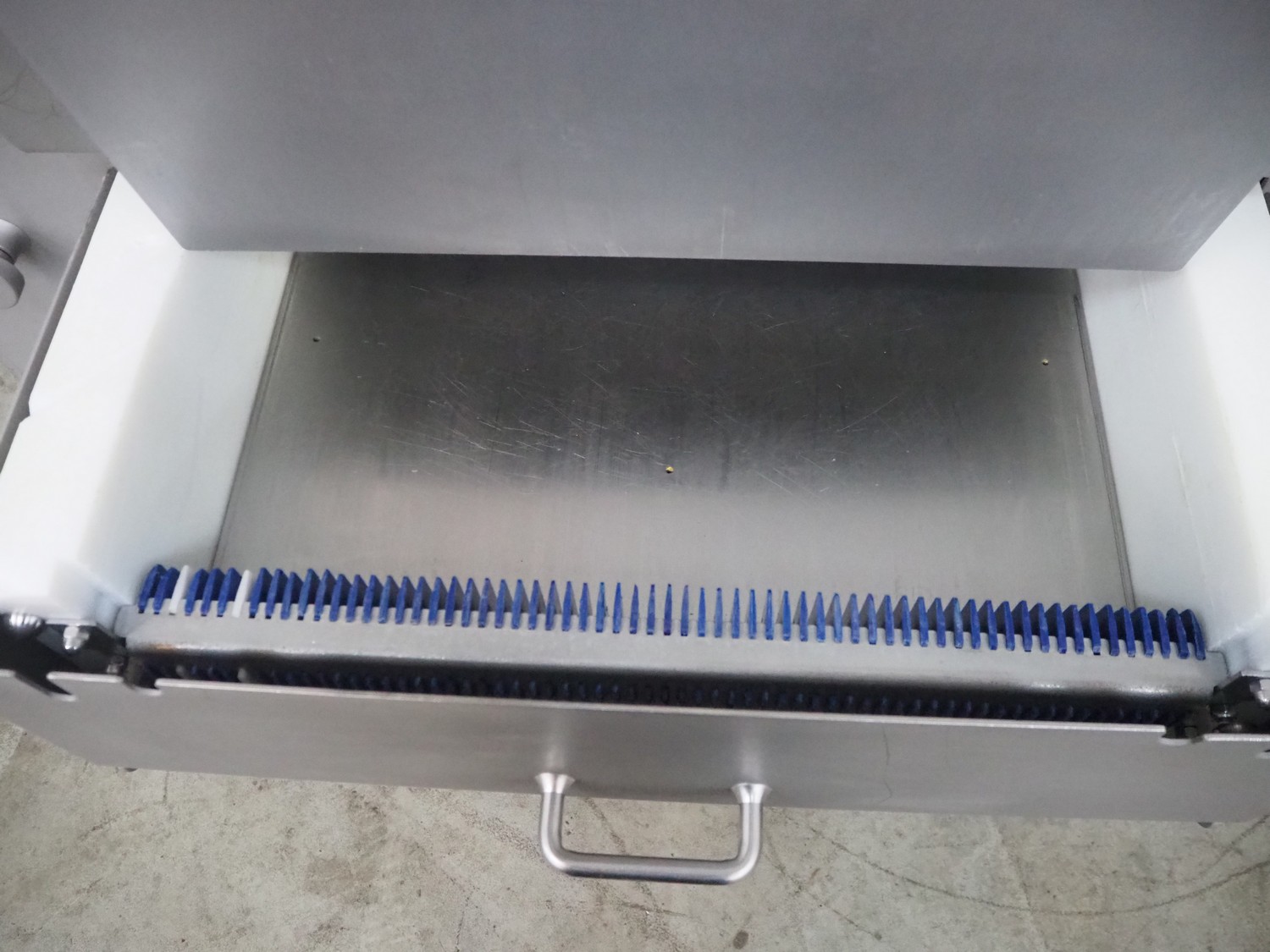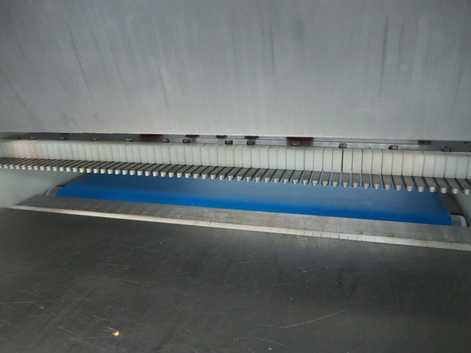 Grasselli slicer, type: NSL 600, number: T10016/457, plastic belt, belt width: 560 mm, distance between knives: 20 mm, total dimensions: 2000 mm x 1200 mm x 1500 mm.