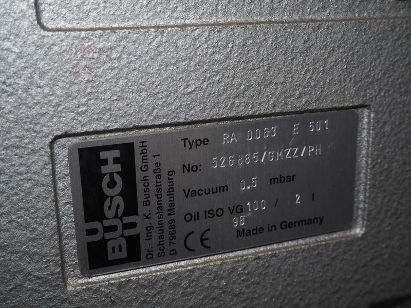 Deca Teknik traysealer, film width: 400 mm, dye: 290 mm x 230 mm, with Busch vacuum pump, type: RA 0063 E 501, number: 526885/GMZZ/PH, capacity: 63 m³ per hour, total dimensions: 1350 mm x 800 mm x 1700 mm.