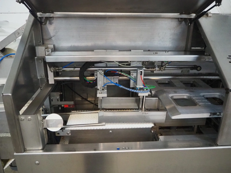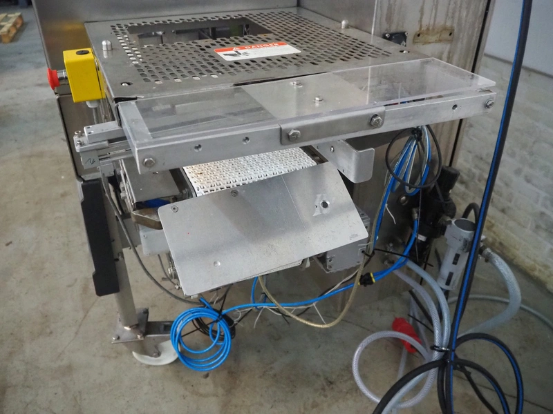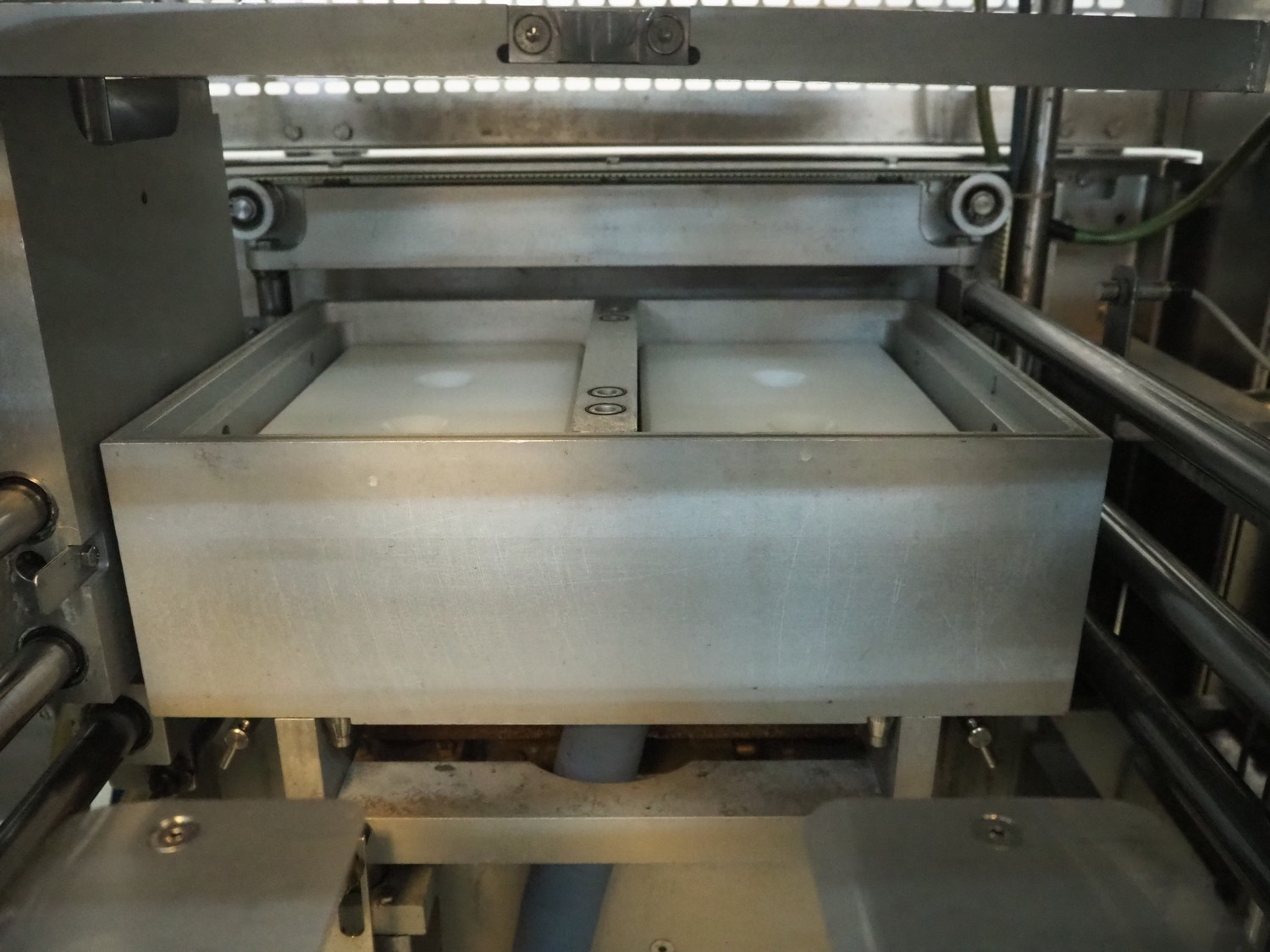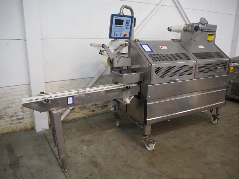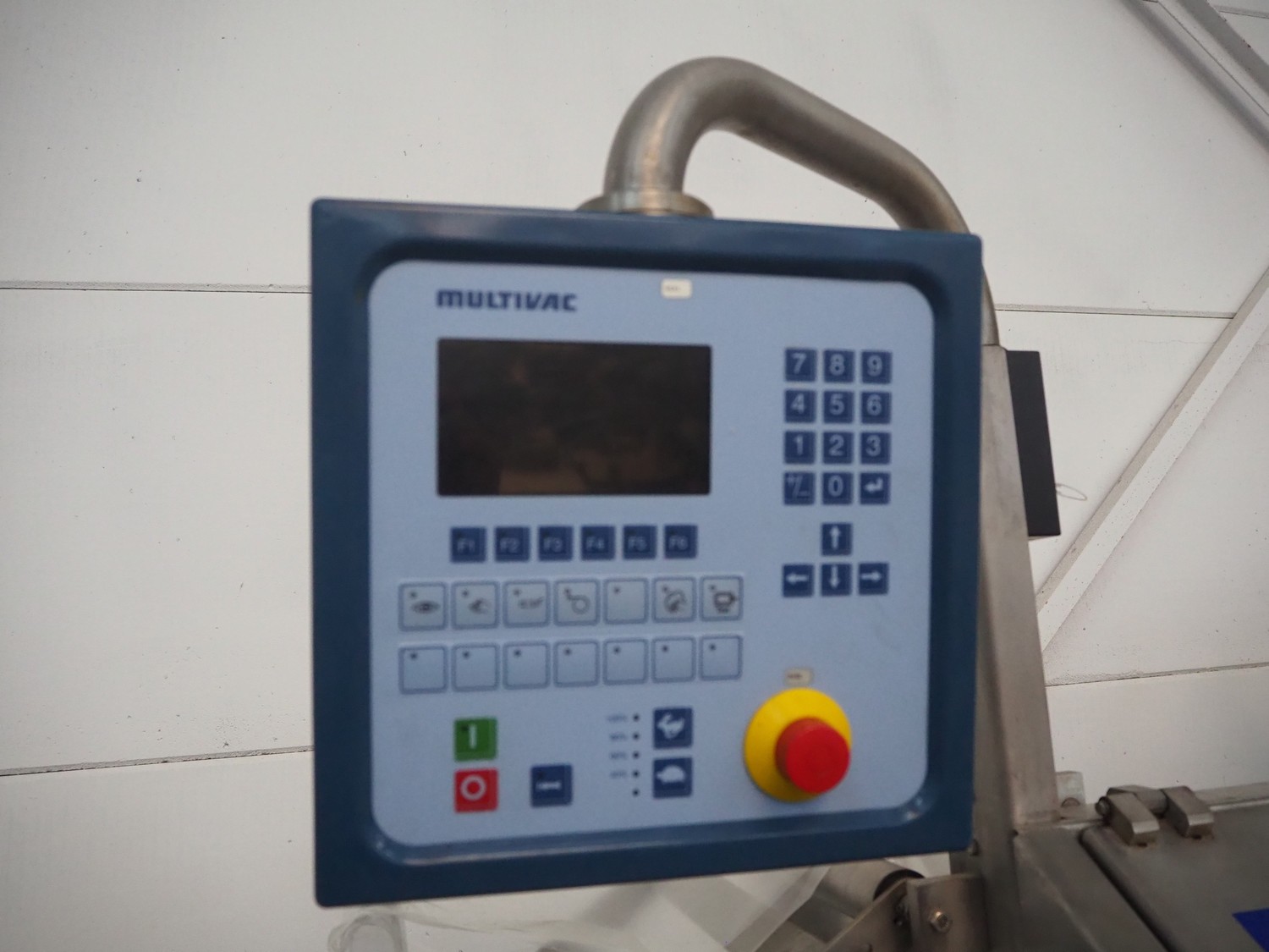Multivac mobile traysealer, type: T350, serial number: 15, year of construction: 2004, 400 V, 3 Ph, 50 Hz, 30 A, 7.5 kW, film width: 280 mm, plastic mesh belt, belt width: 200 mm, dimensions dye: (2x) 135 mm x 170 mm, total dimensions: 3900 mm x 1200 mm x 2100 mm. Missing vacuum pump.