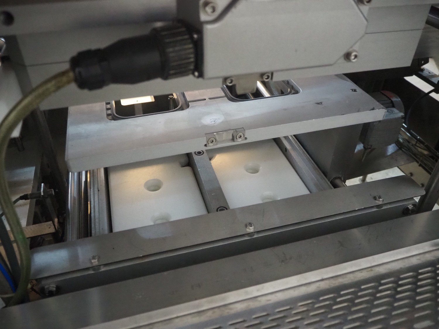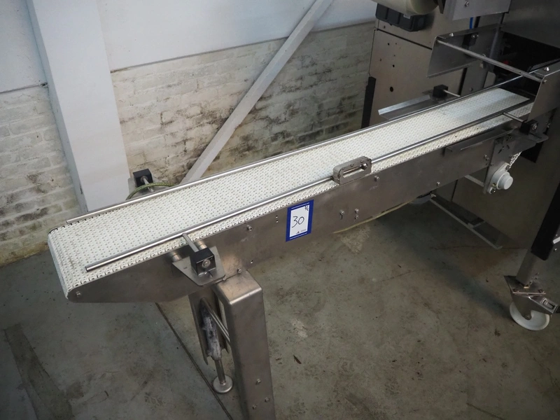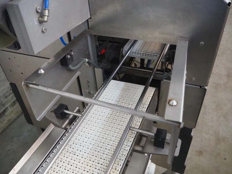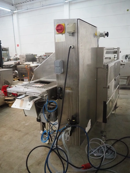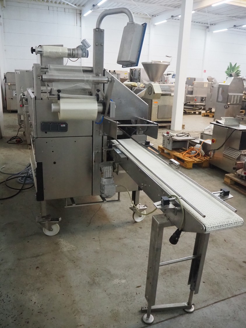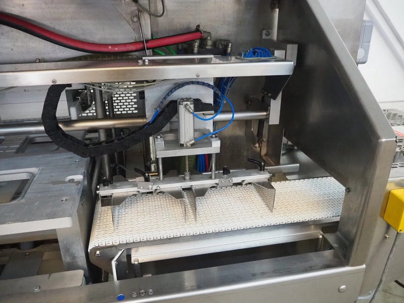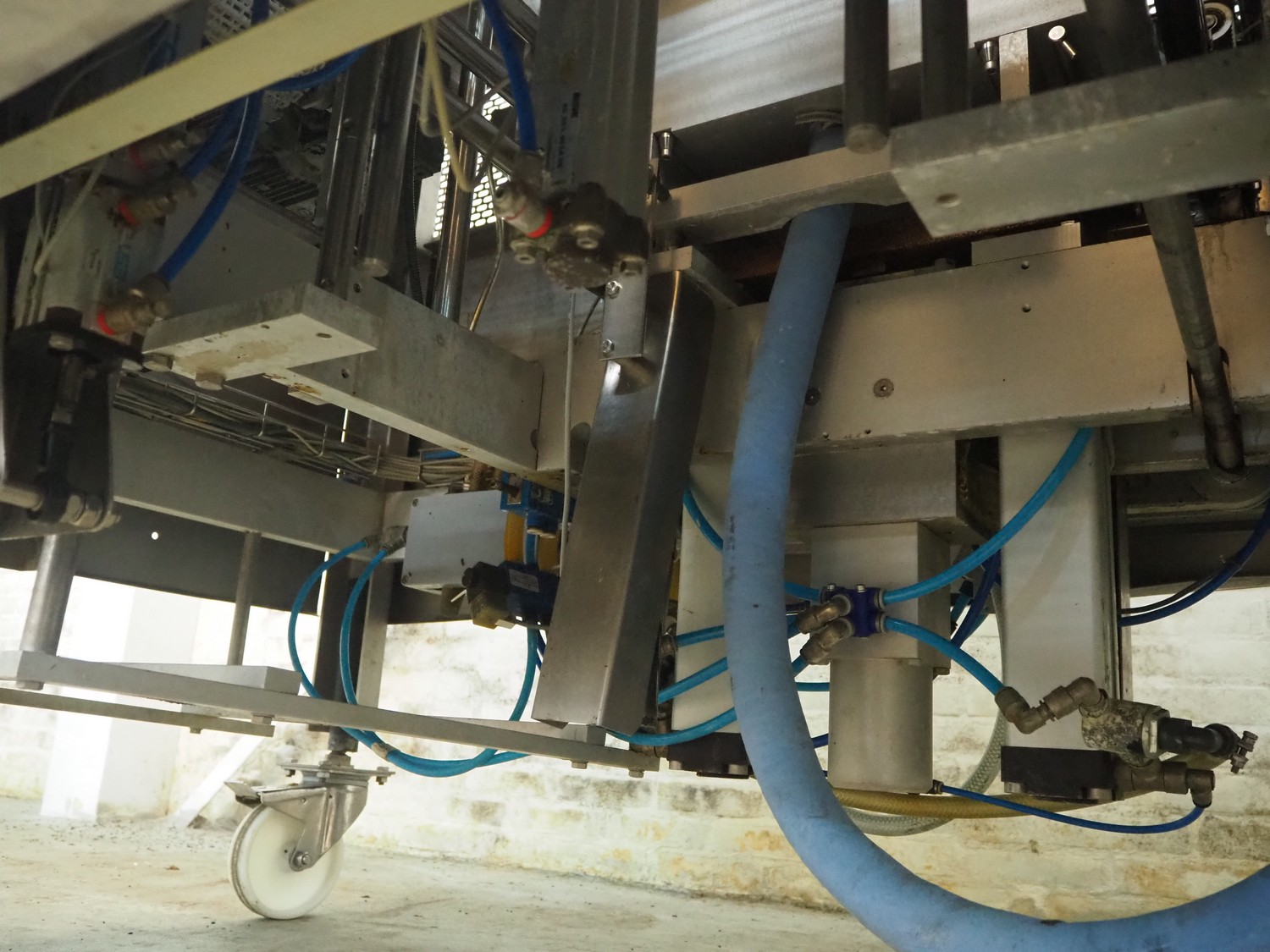 Multivac mobile traysealer, type: T350, serial number: 15, year of construction: 2004, 400 V, 3 Ph, 50 Hz, 30 A, 7.5 kW, film width: 280 mm, plastic mesh belt, belt width: 200 mm, dimensions dye: (2x) 135 mm x 170 mm, total dimensions: 3900 mm x 1200 mm x 2100 mm. Missing vacuum pump.
