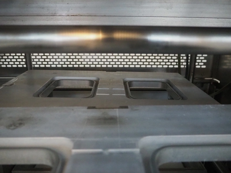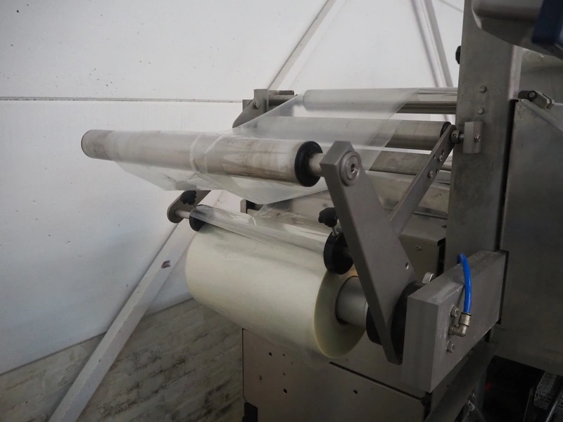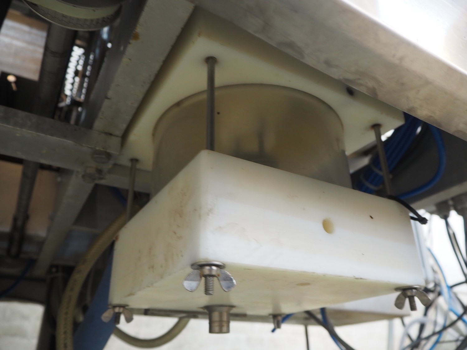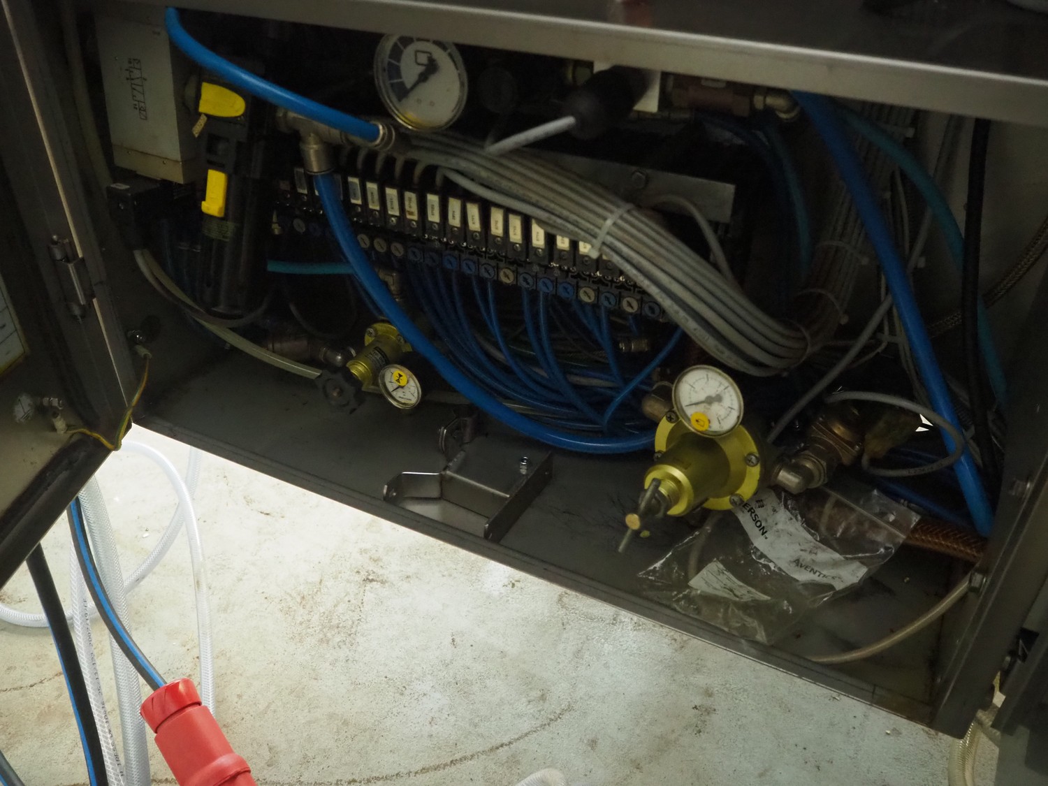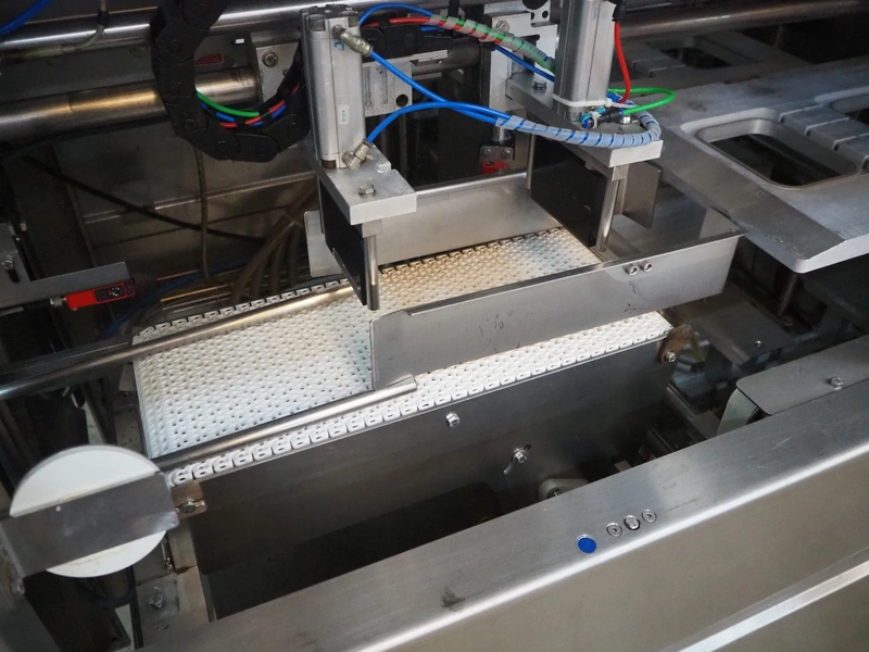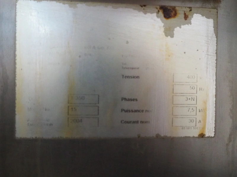 Multivac mobile traysealer, type: T350, serial number: 15, year of construction: 2004, 400 V, 3 Ph, 50 Hz, 30 A, 7.5 kW, film width: 280 mm, plastic mesh belt, belt width: 200 mm, dimensions dye: (2x) 135 mm x 170 mm, total dimensions: 3900 mm x 1200 mm x 2100 mm. Missing vacuum pump.