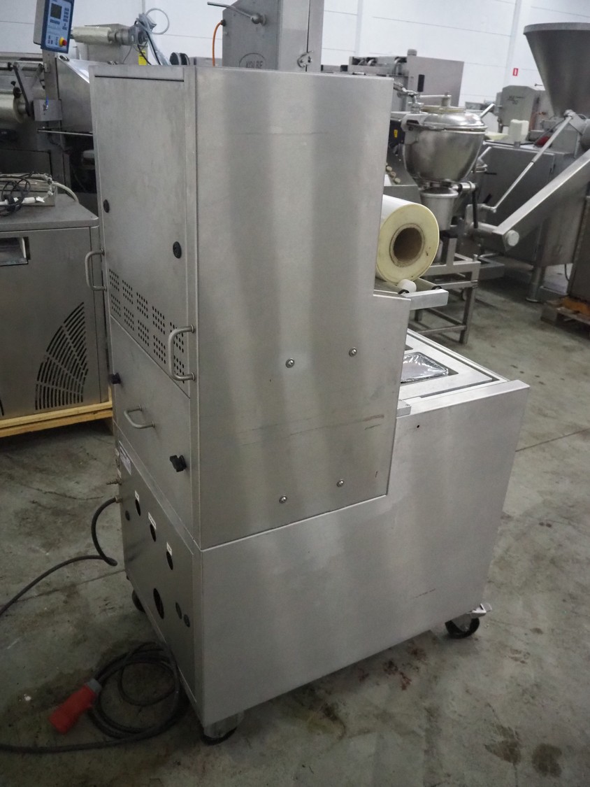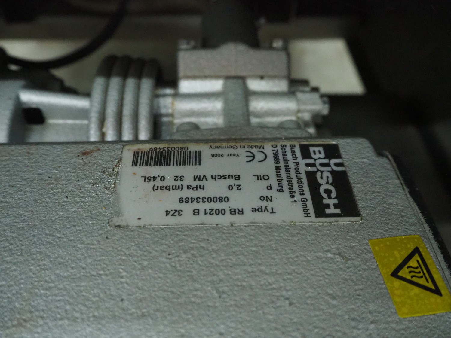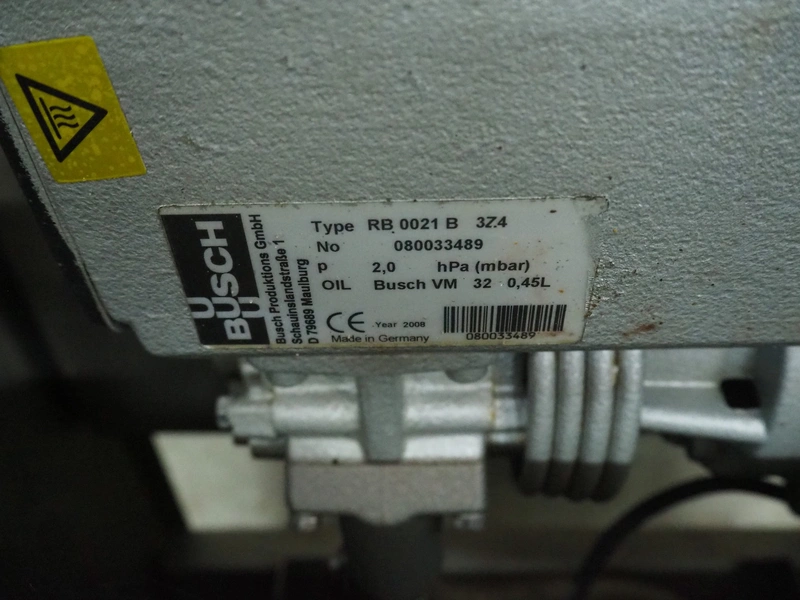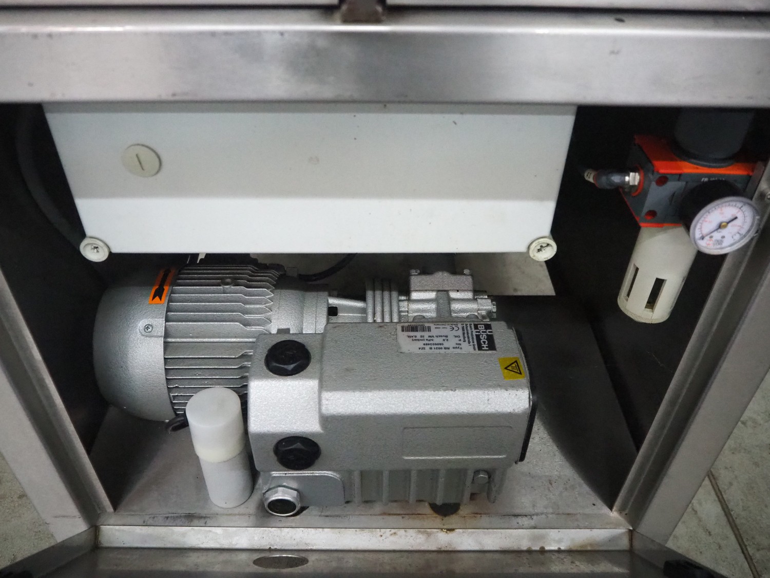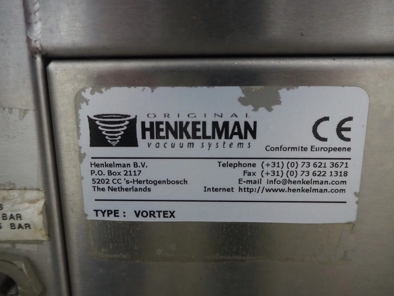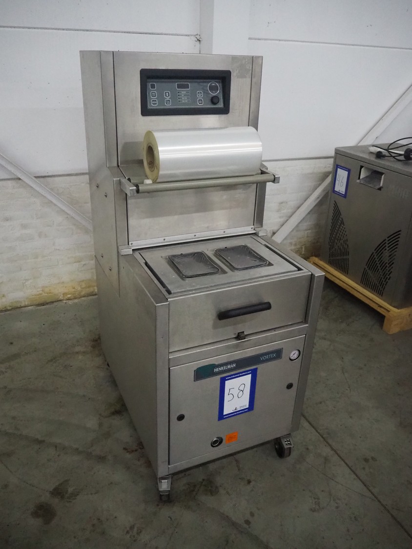 Henkelman mobile traysealer, type: Vortex, machine number: V0812010, year of construction: 2008, mould code: 0721005000, 400 V, 3 Ph, 50 Hz, 4 kW, 6 A, dimensions dye: (2x) 187 mm x 137 mm, Busch vacuum pump, type: RB 0021 B 37.4, year of construction: 2008, capacity: 21 m³ per hour, total dimensions: 930 mm x 600 mm x 1600 mm.